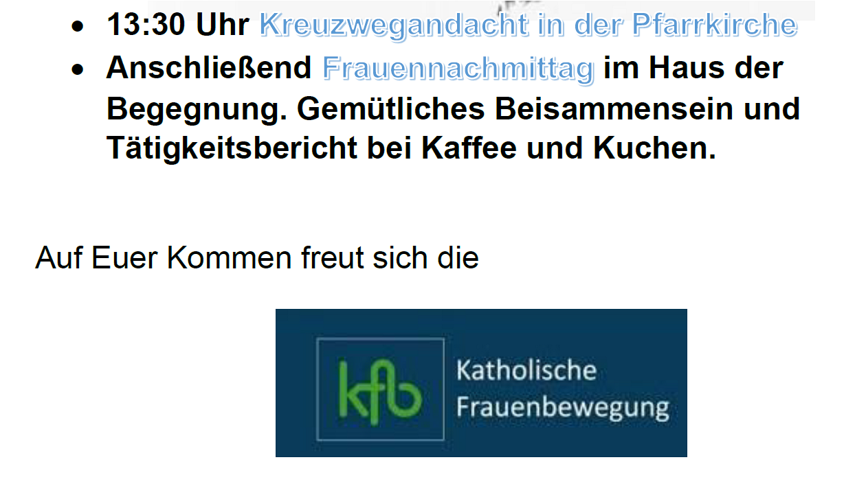 Kreuzwegandacht, gestaltet von der KFB anschließend Frauennachmittag im HdB