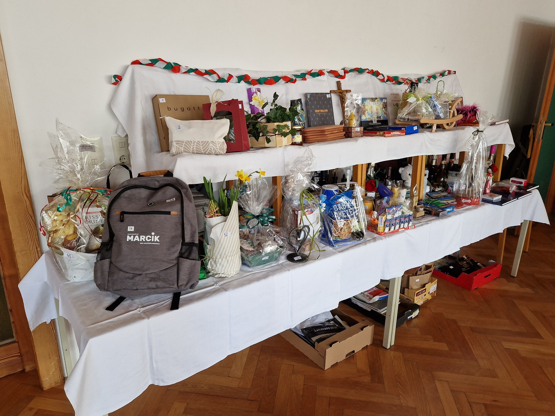 P. Jacobus lud nach dem Segen zum Pfarrcafe mit Tombola ein. Bereits am Kirchenplatz erwarteten die Ministranten die Messbesucher mit Losen auf dem Marktplatz.Neugierig kamen viele ins Haus der Begegnung und ließen sich von den tollen Preisen überraschen. Das Team der Katholischen Frauenbewegung und die Eltern der Minis verwöhnten die vielen Gäste mit köstlichen Mehlspeisen und Kaffee. Römisches Flair brachte die kleine italienische Prosecco-Bar.