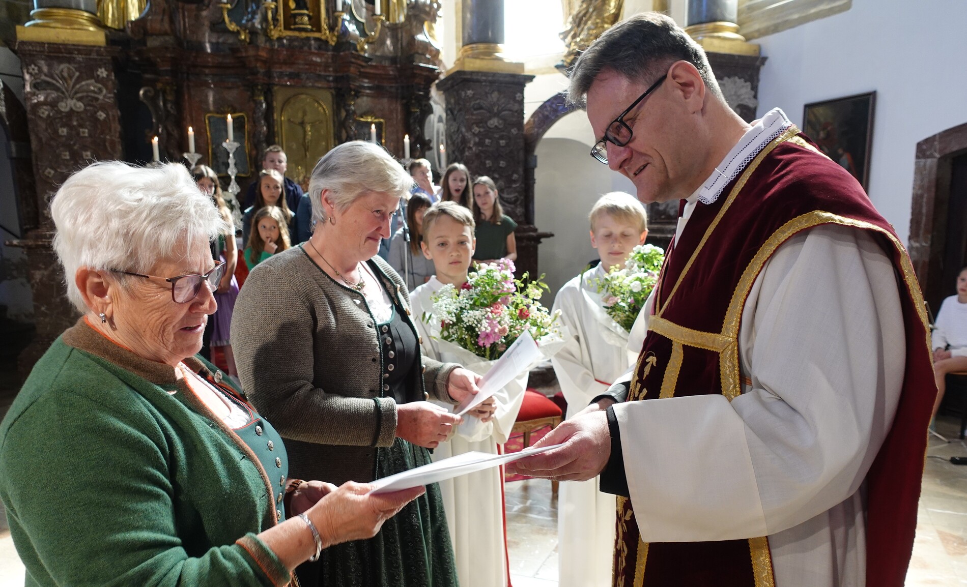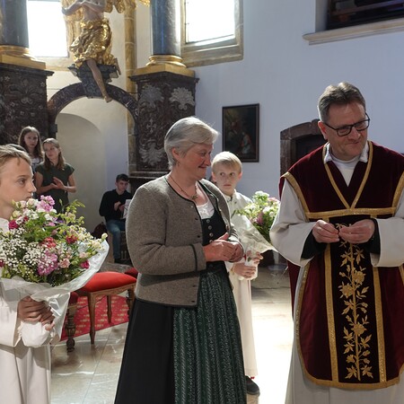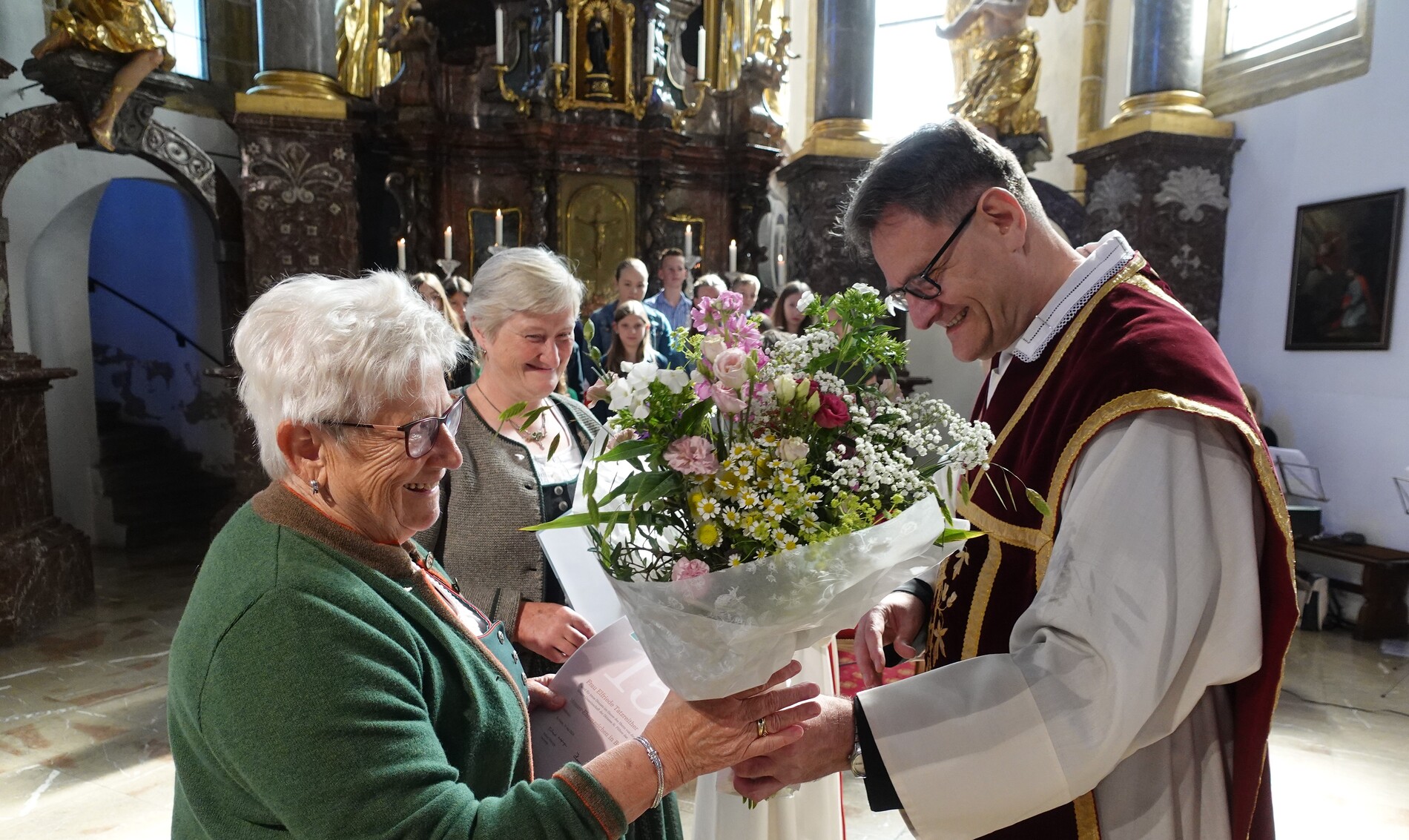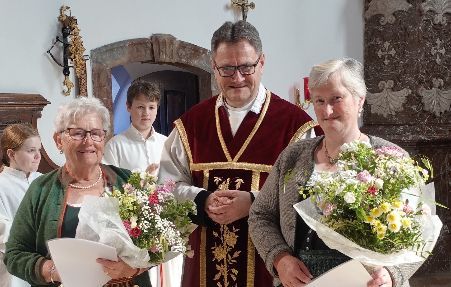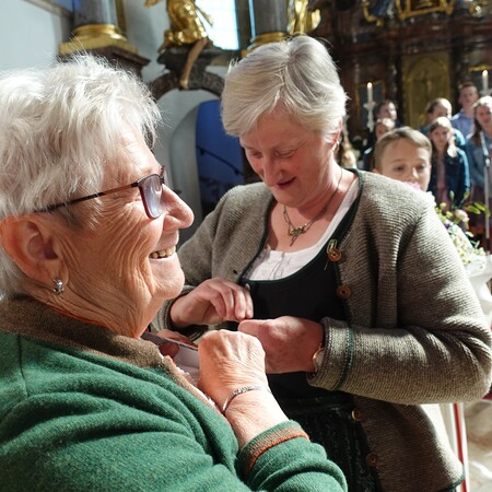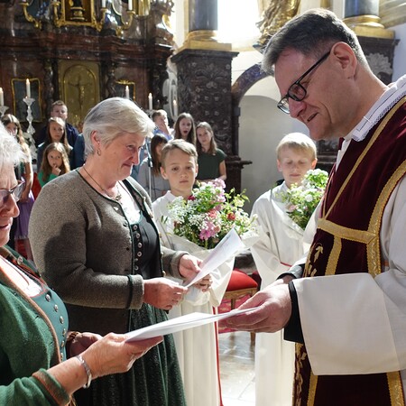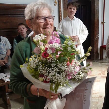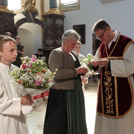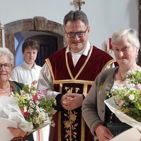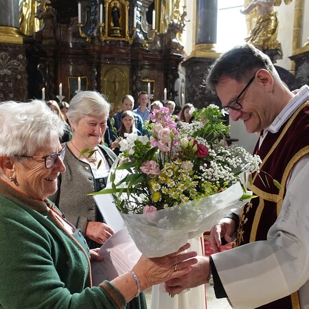 Im Anschluss an die Feier bat P. Jacobus unsere Mesnerinnen vor den Vorhang, die in großer Treue, in Umsichtigkeit und Liebenswürdigkeit ihren Dienst leisten. Die Zusammenarbeit mit ihnen ist dem Pfarrer eine Freude - zum Zeichen dafür gab es einen Blumenstrauß, die Urkunde der Mesnergemeinschaft und das Mesnerehrenzeichen in Bronze.