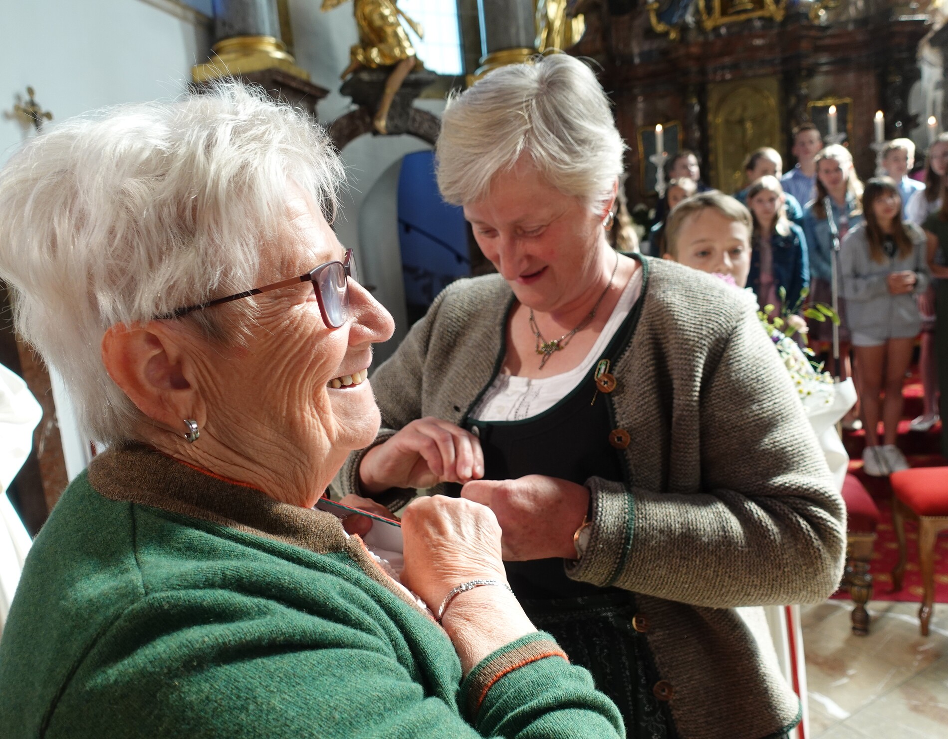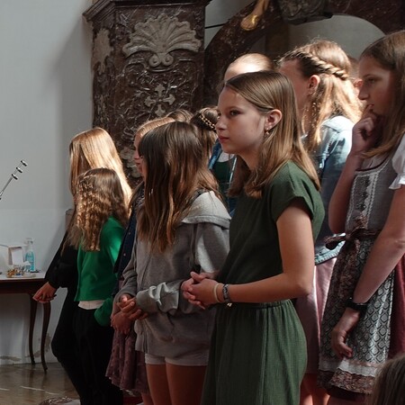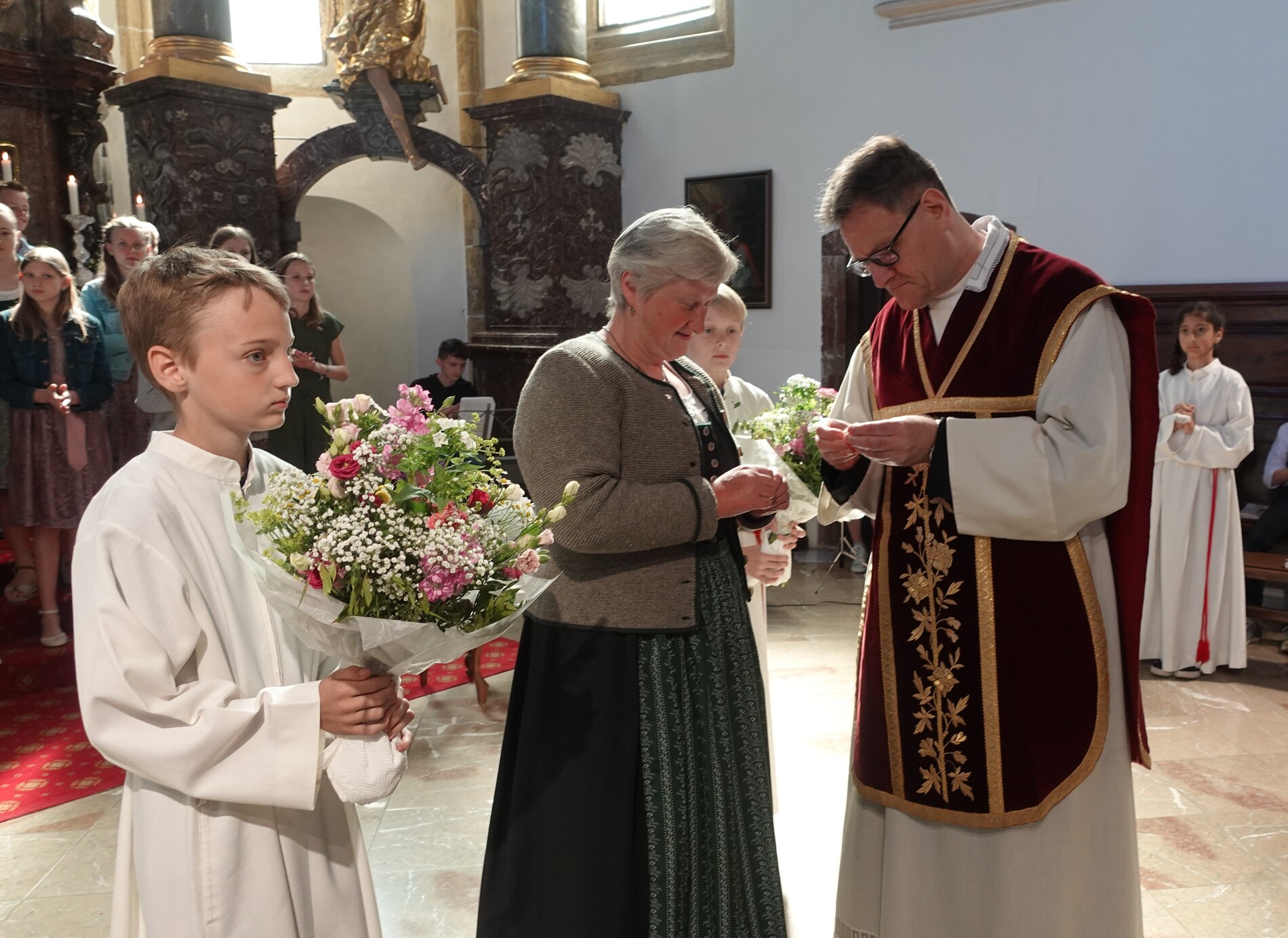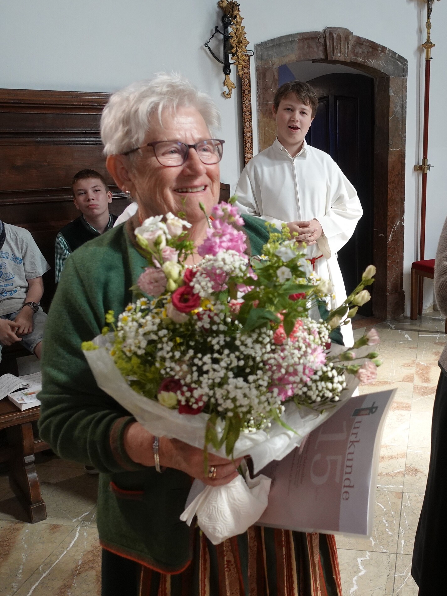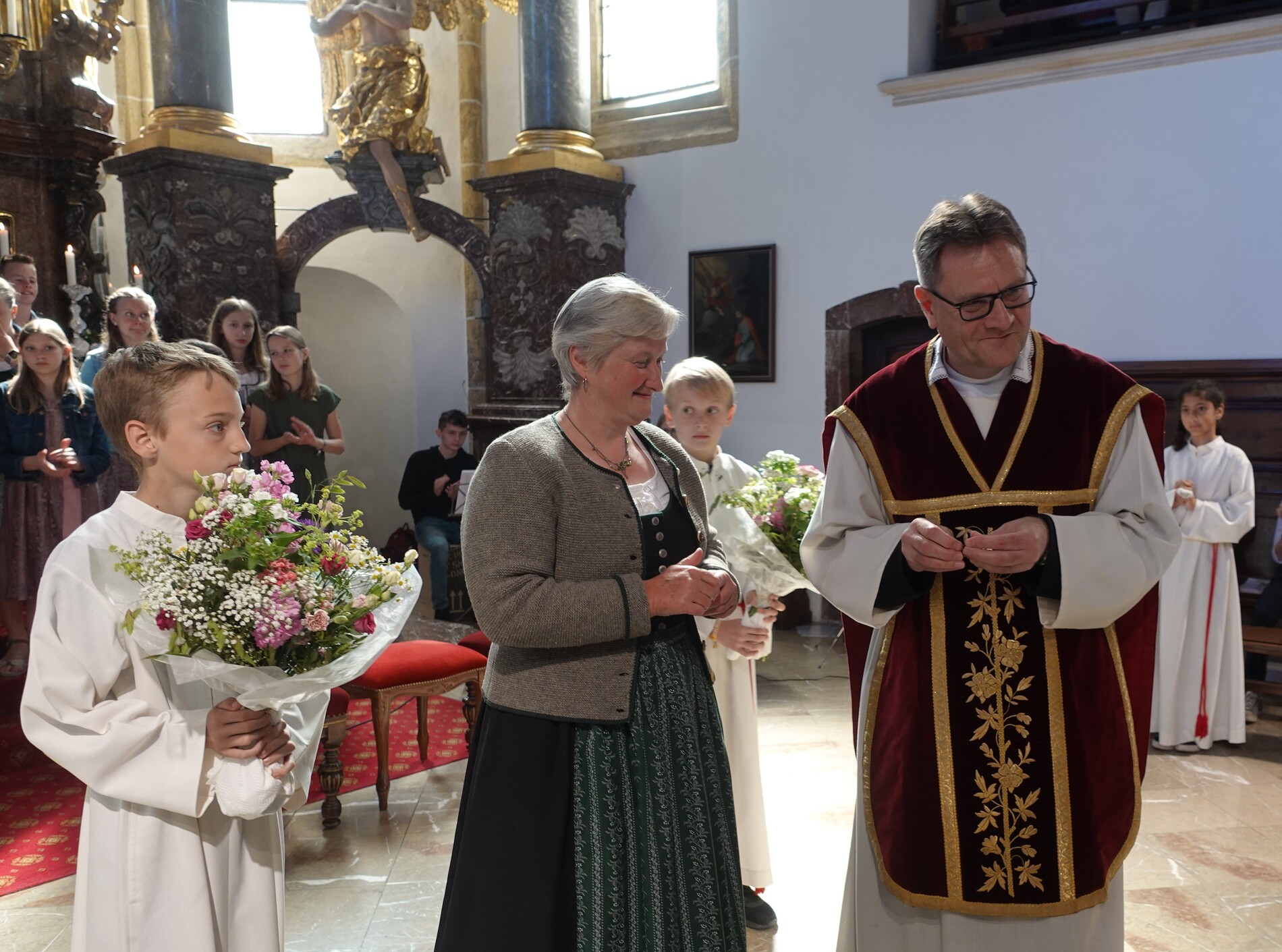 Im Anschluss an die Feier bat P. Jacobus unsere Mesnerinnen vor den Vorhang, die in großer Treue, in Umsichtigkeit und Liebenswürdigkeit ihren Dienst leisten. Die Zusammenarbeit mit ihnen ist dem Pfarrer eine Freude - zum Zeichen dafür gab es einen Blumenstrauß, die Urkunde der Mesnergemeinschaft und das Mesnerehrenzeichen in Bronze.