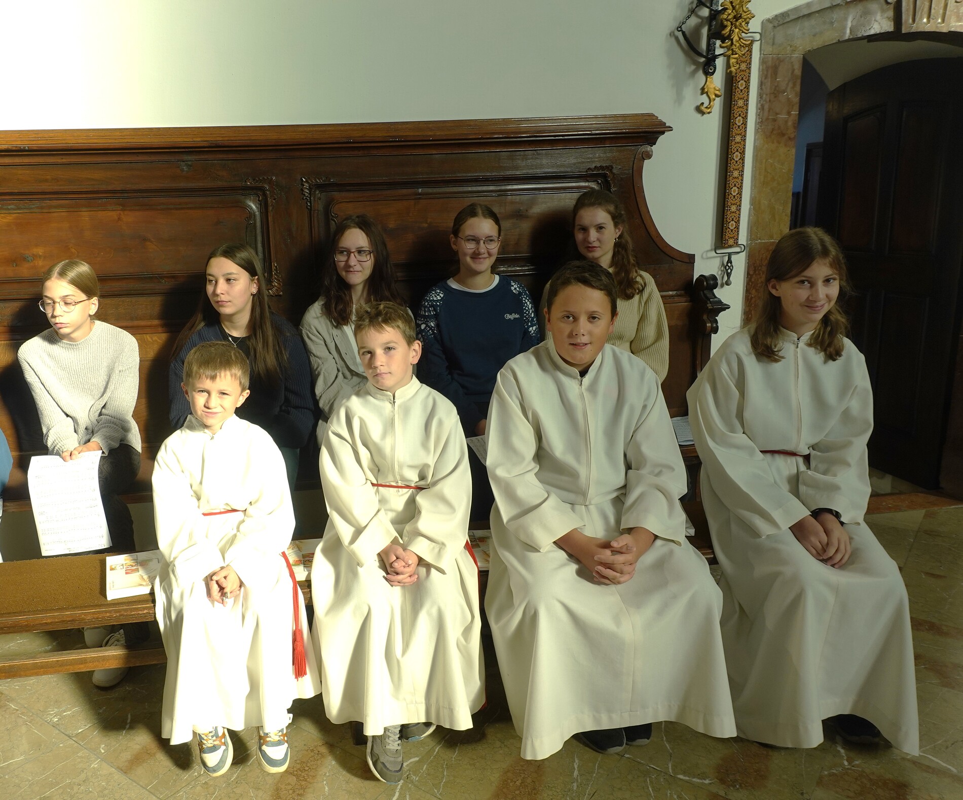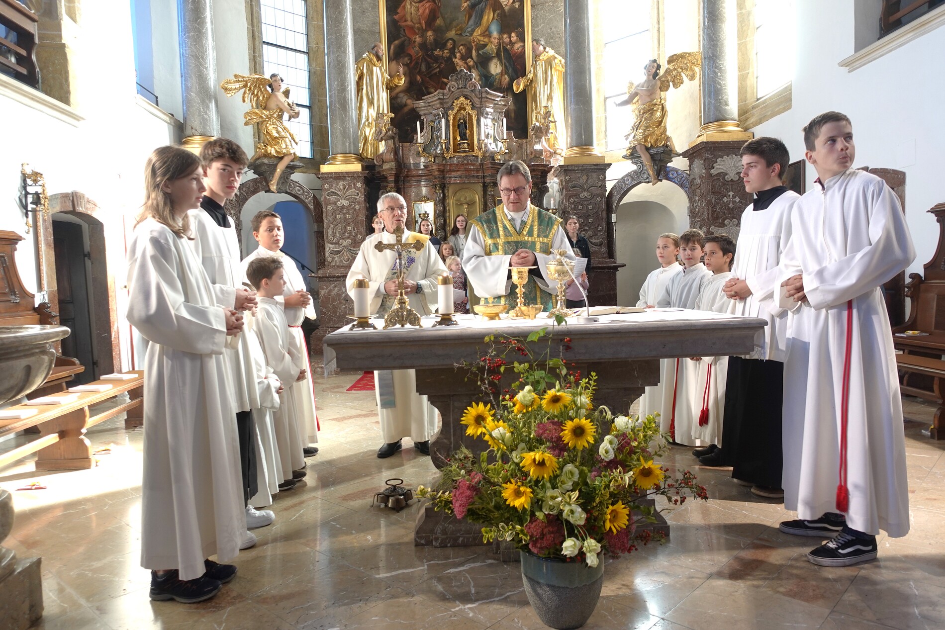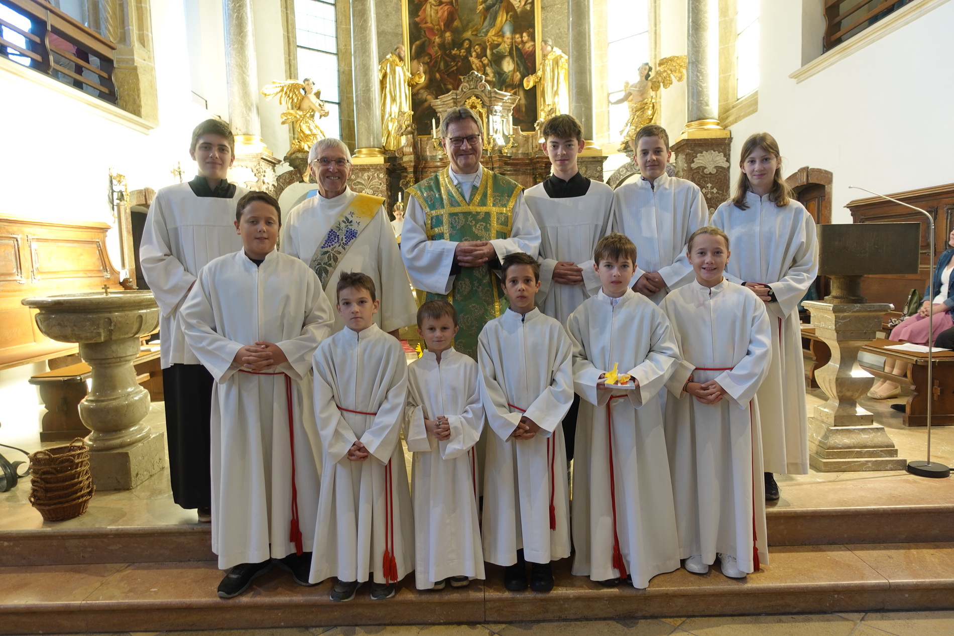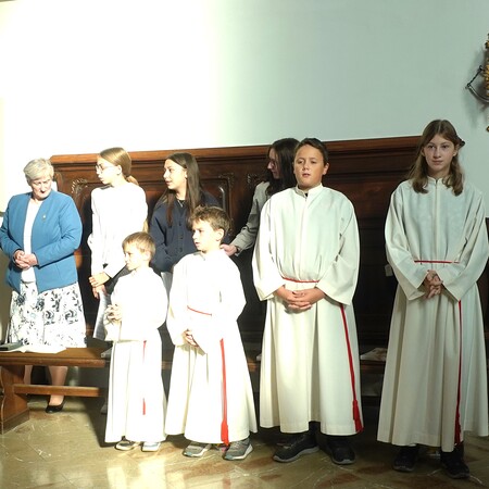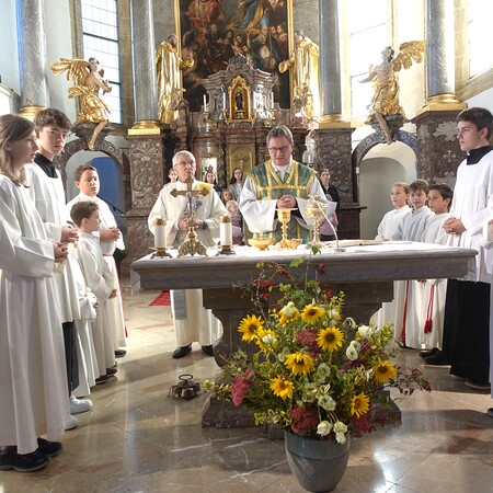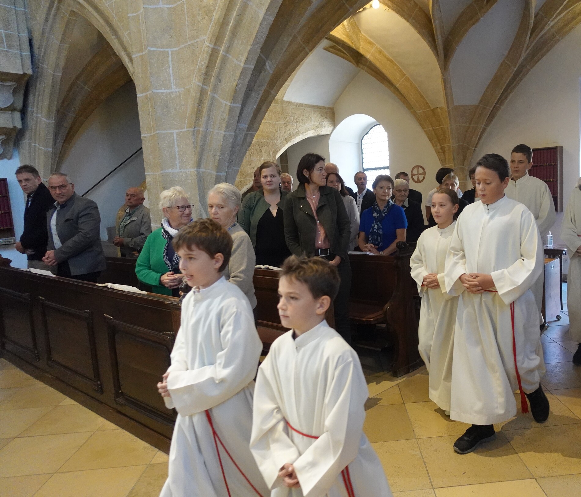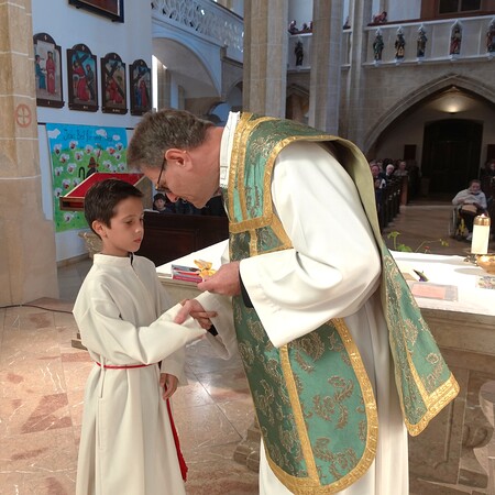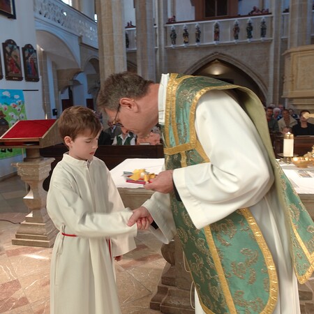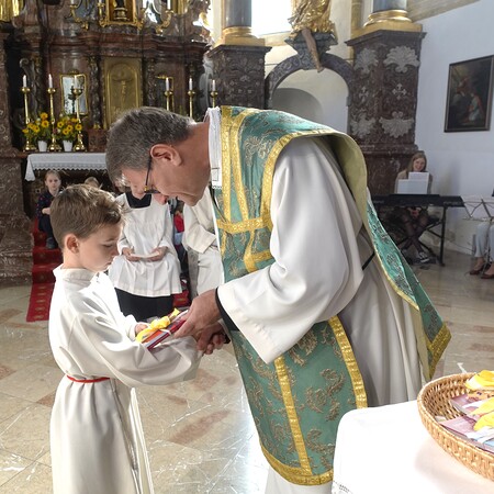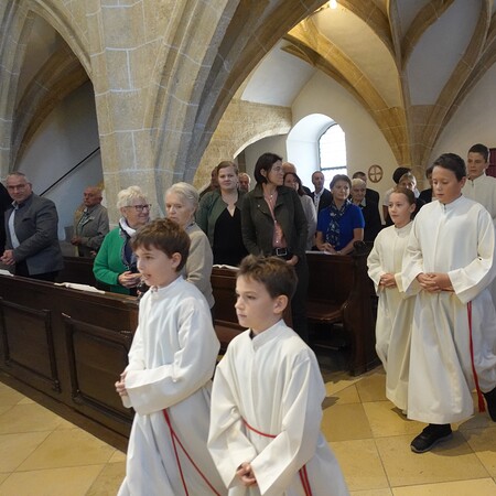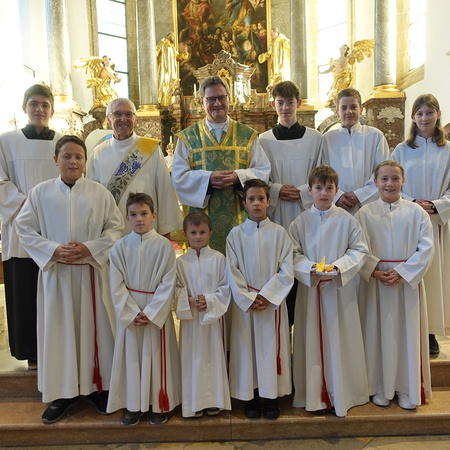 Der feierliche Einzug durch das Hauptportal stellte den besonderen Dienst der Ministranten vor Augen. P. Jacobus erklärte nach der herzlichen Begrüßung, dass die Ministranten die Pfarrgemeinde am Altar vertreten und ihnen besondere Aufgaben zugeteilt sind.