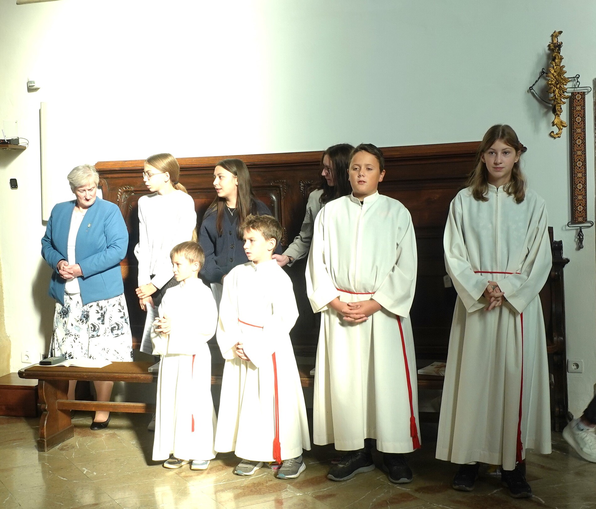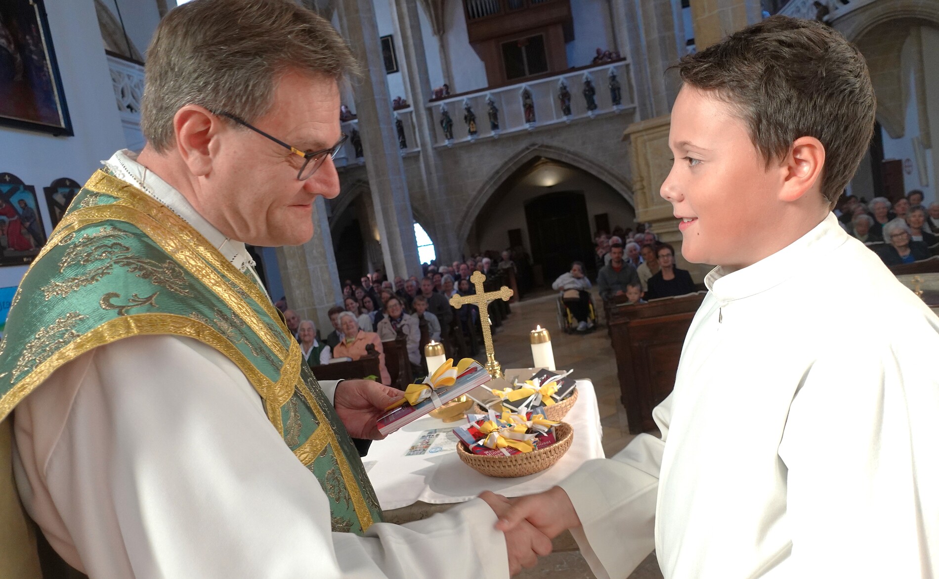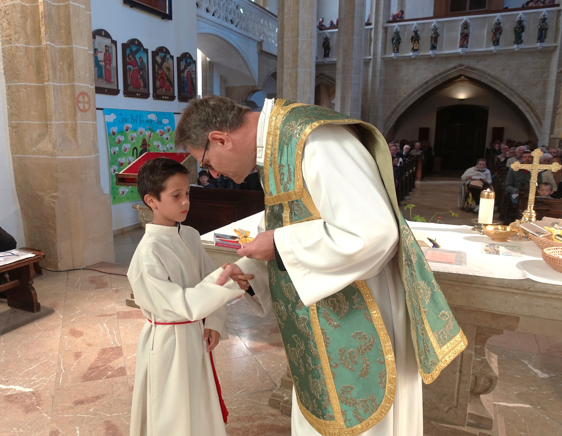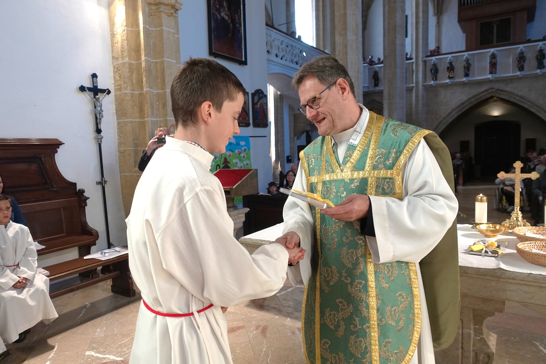 Der feierliche Einzug durch das Hauptportal stellte den besonderen Dienst der Ministranten vor Augen. P. Jacobus erklärte nach der herzlichen Begrüßung, dass die Ministranten die Pfarrgemeinde am Altar vertreten und ihnen besondere Aufgaben zugeteilt sind.