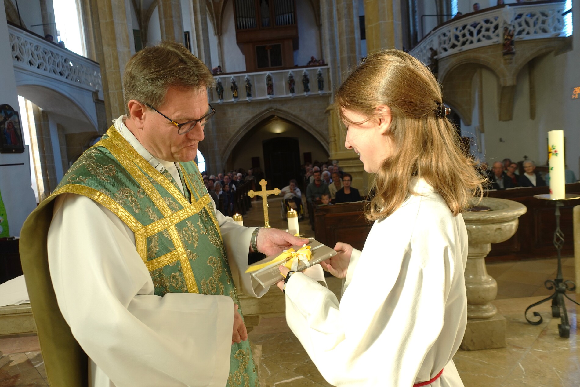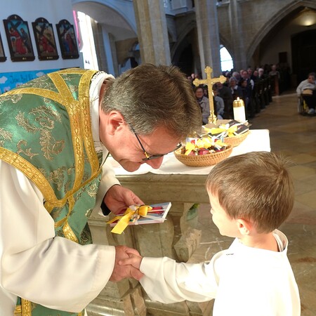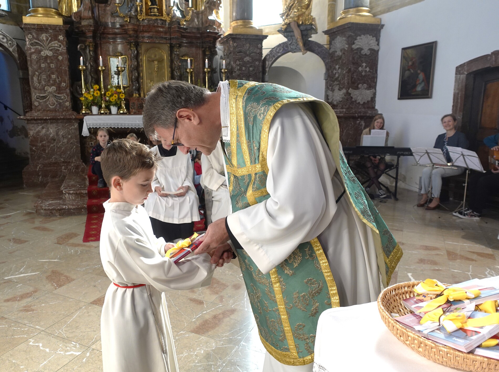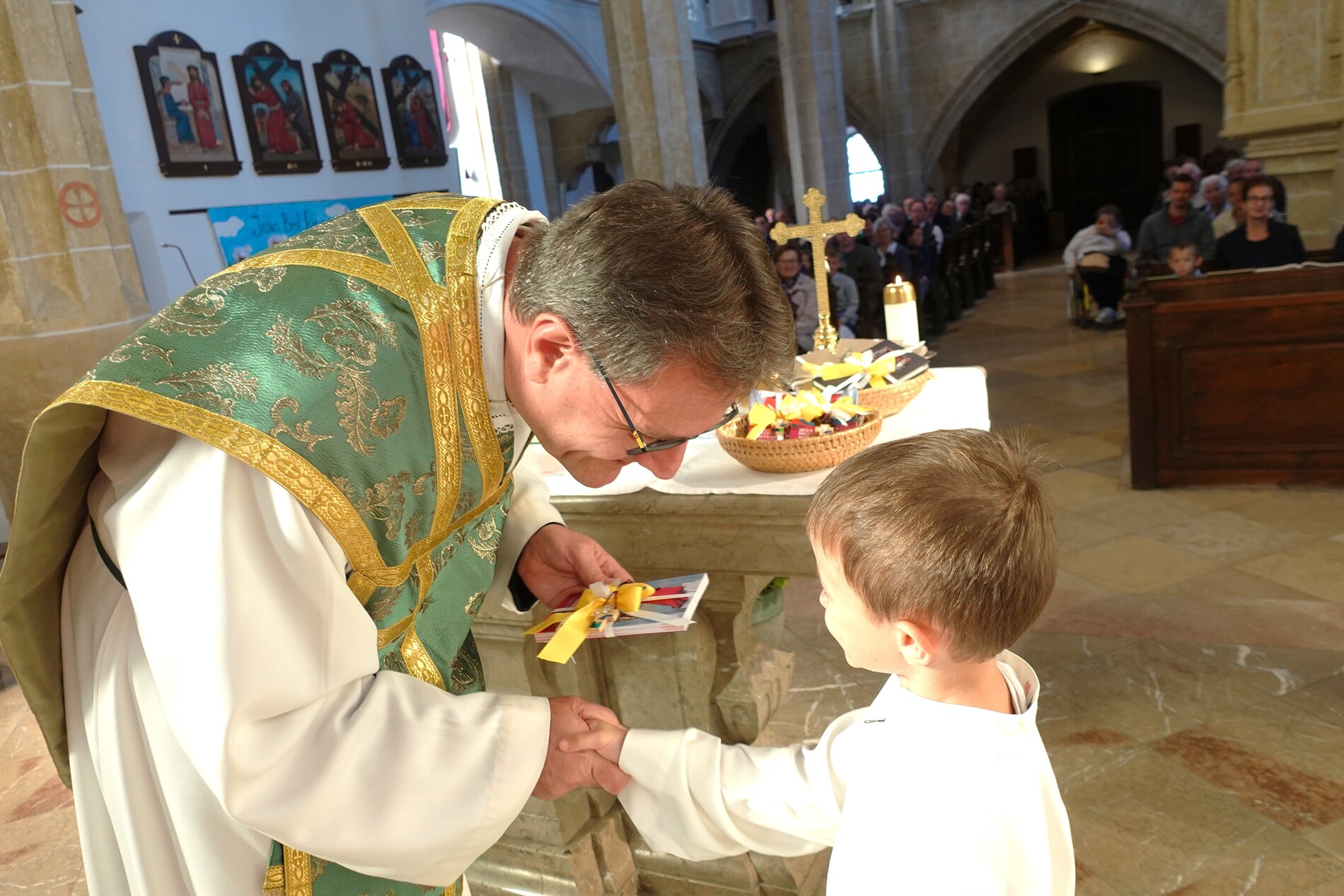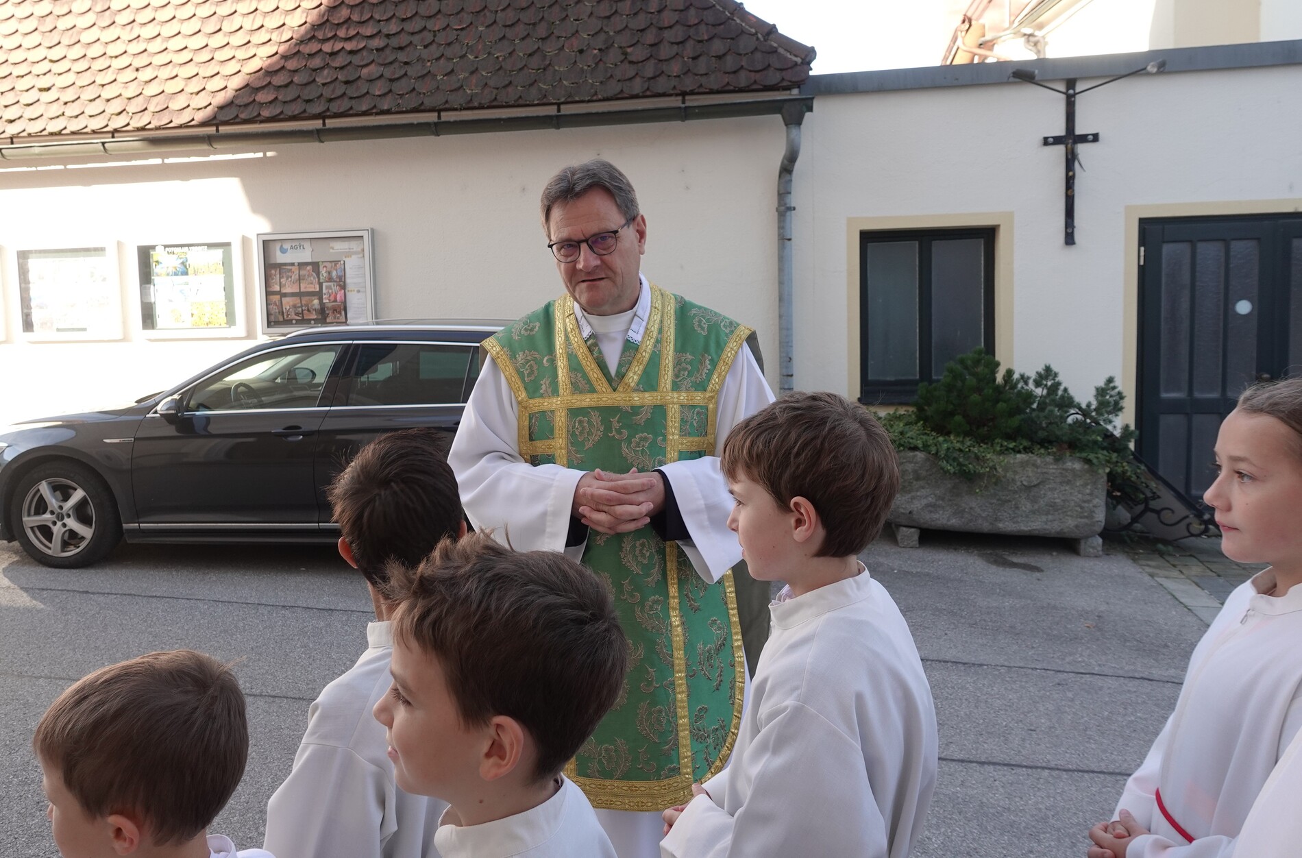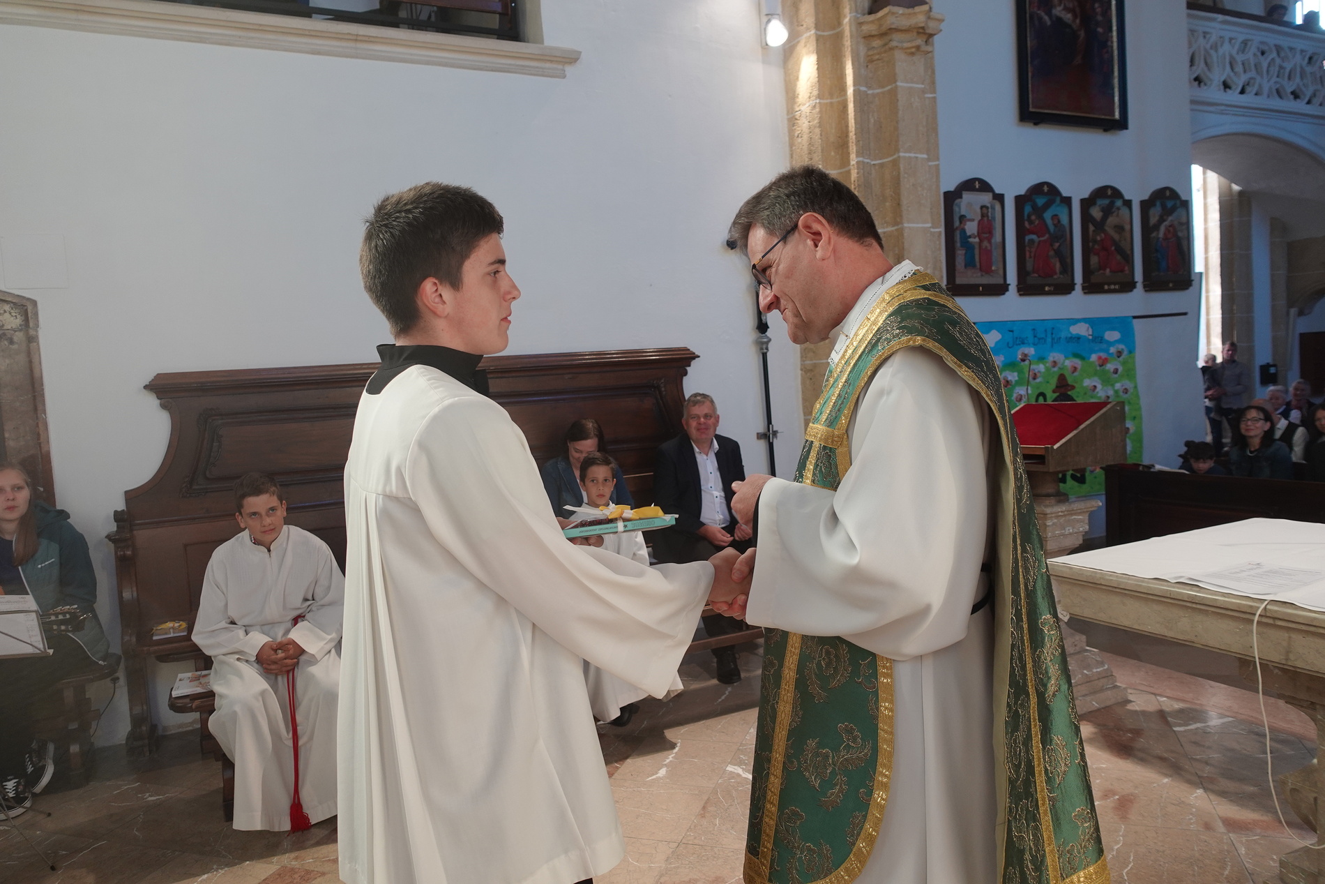 Der feierliche Einzug durch das Hauptportal stellte den besonderen Dienst der Ministranten vor Augen. P. Jacobus erklärte nach der herzlichen Begrüßung, dass die Ministranten die Pfarrgemeinde am Altar vertreten und ihnen besondere Aufgaben zugeteilt sind.