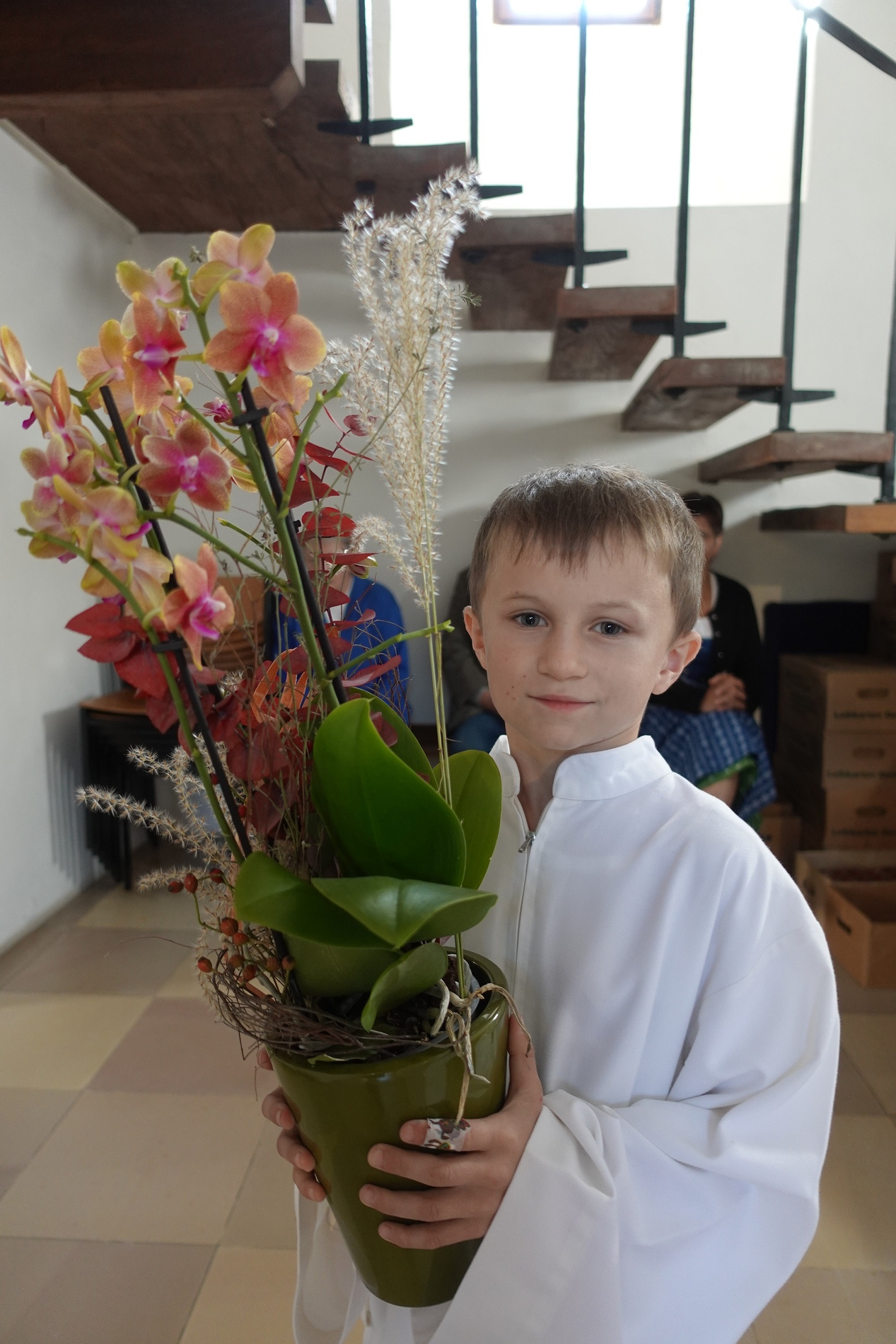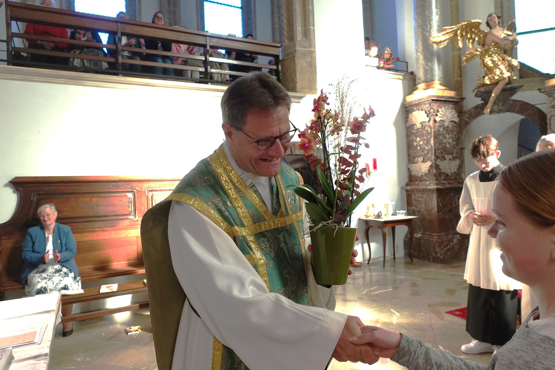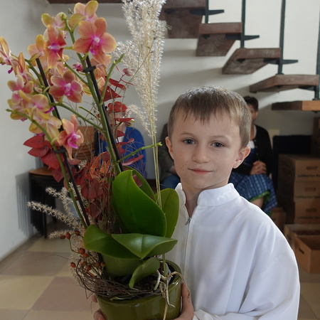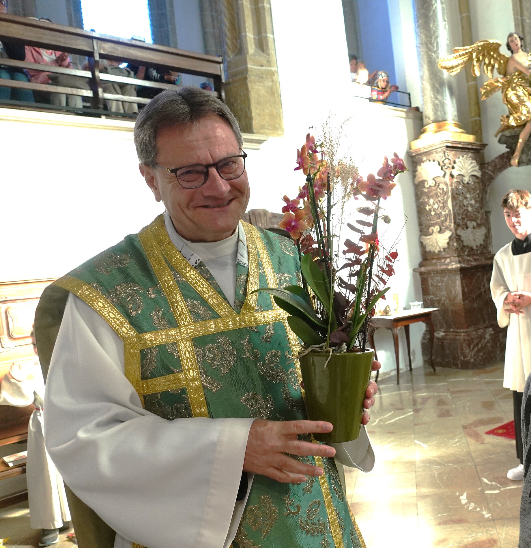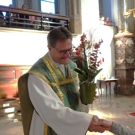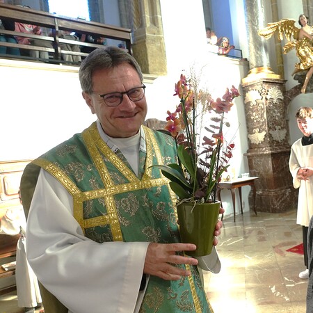 Am Ende des Gottesdienstes überraschten die Minstranten P. Jacobus mit einer Blume und gratulierten ihm herzlich zur Wahl zum Dechanten des Dekanates Waidhofen/Ybbs. Mit kräftigem Applaus schloss sich die Pfarrgemeinde den Glückwünschen an.