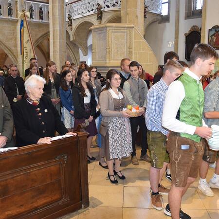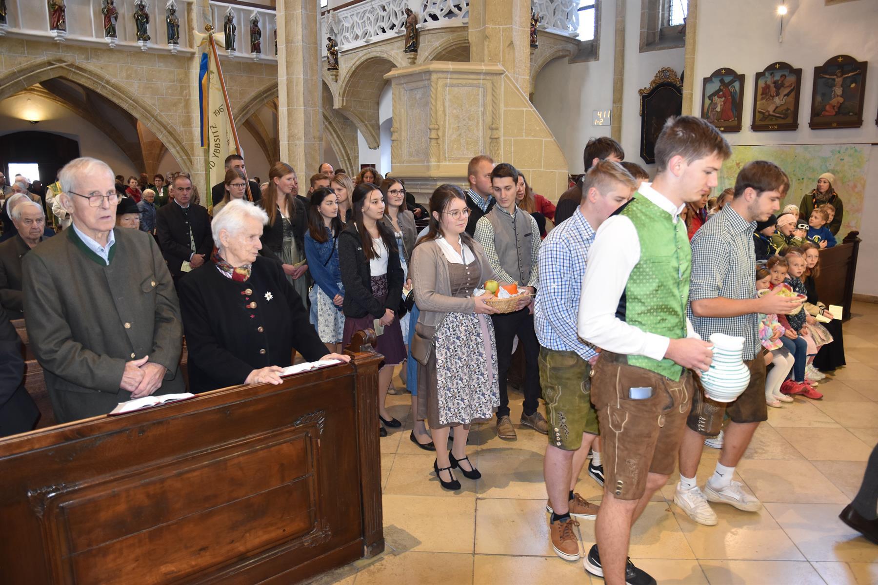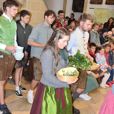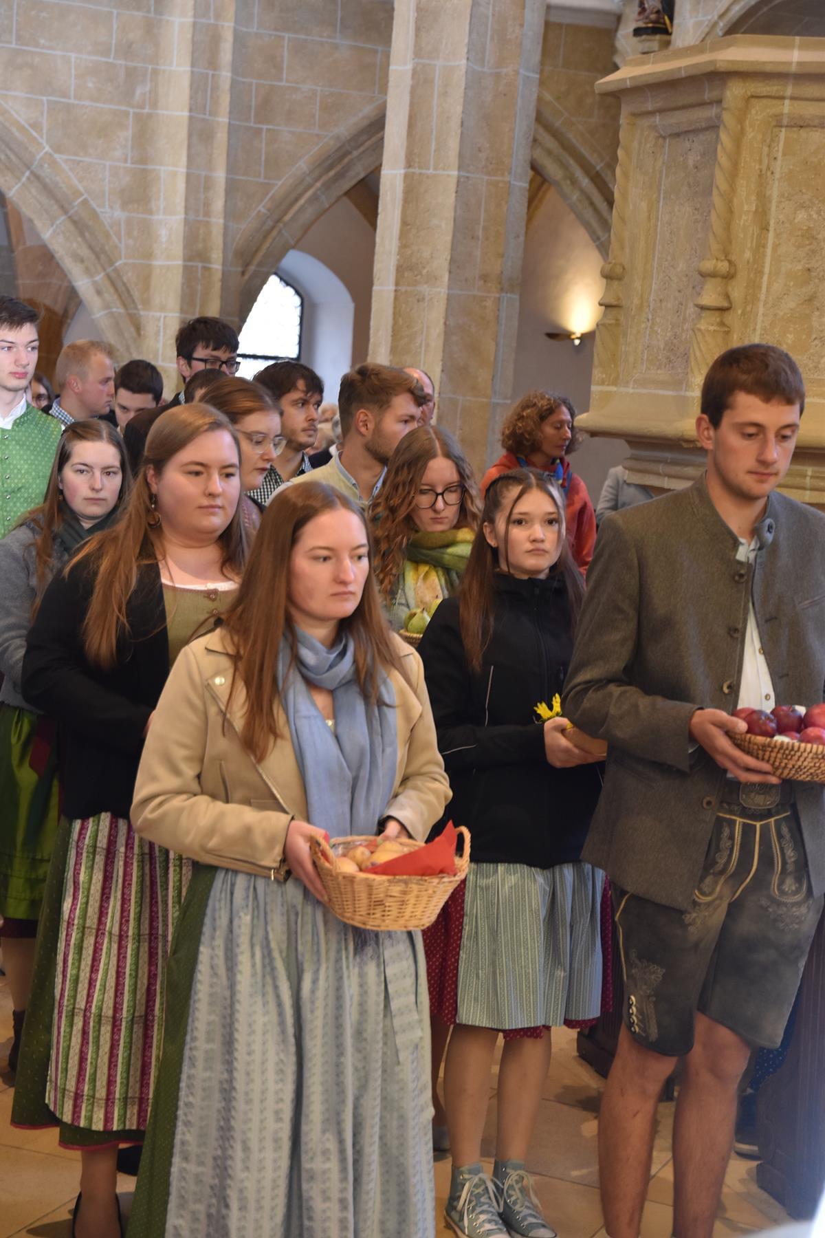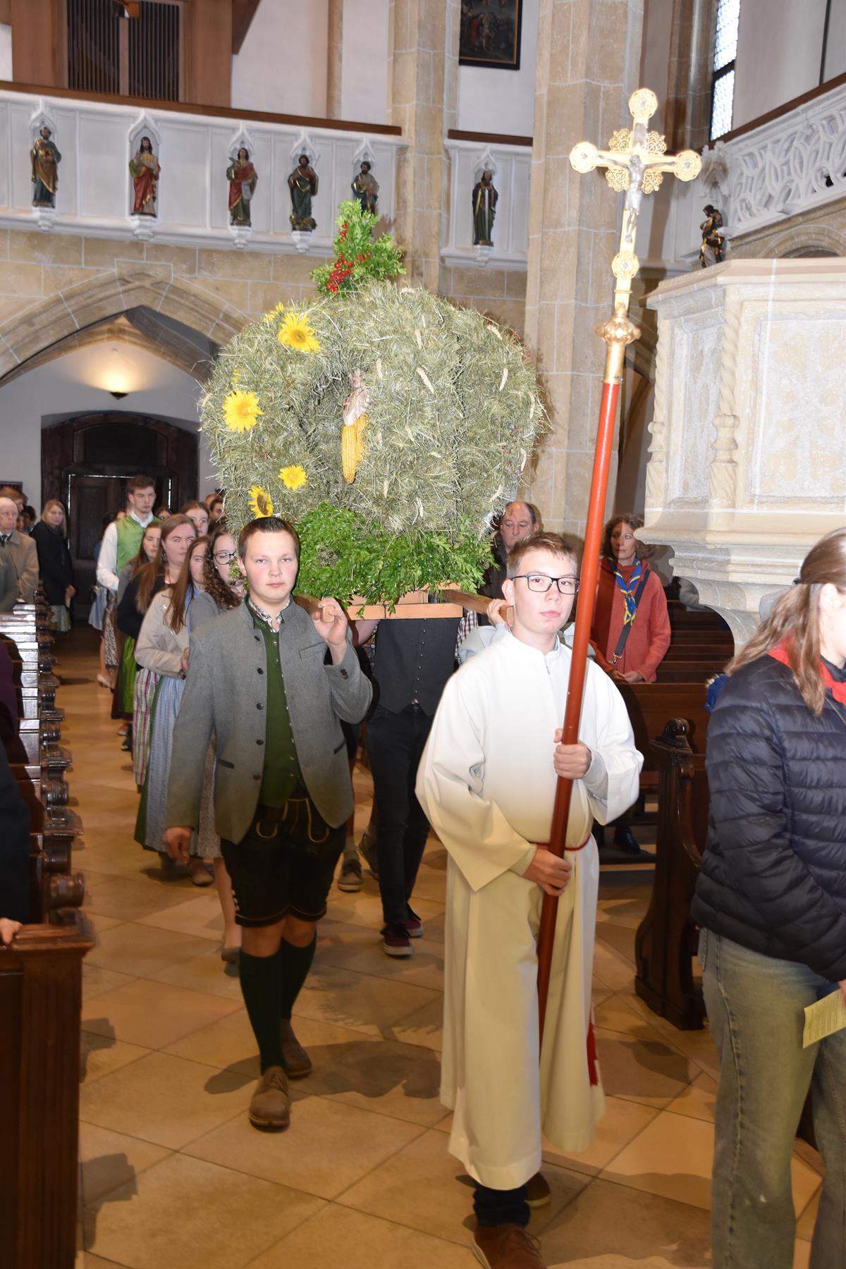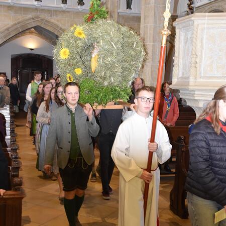 Nach der Segnung der Erntegaben zog die Prozession unter den festlichen Klängen unserer Musikkapelle zur Kirche, um den Dankgottesdienst zu feiern.