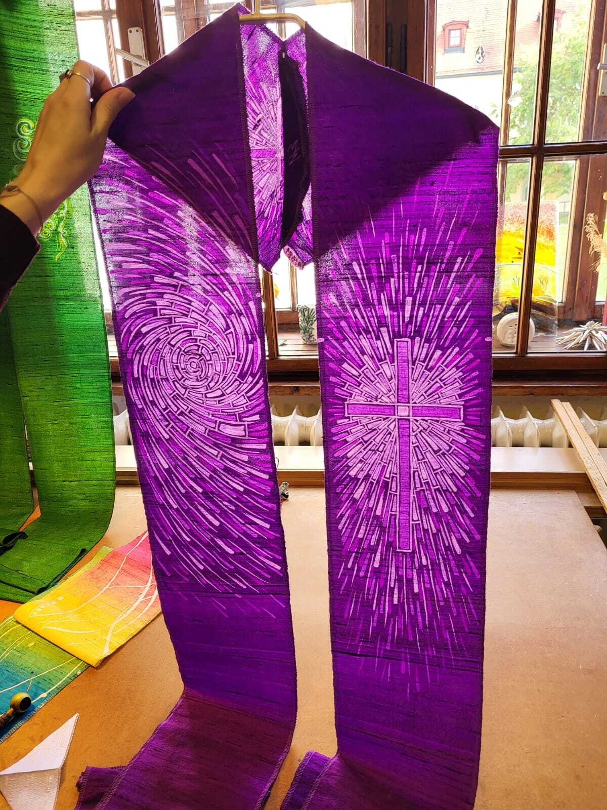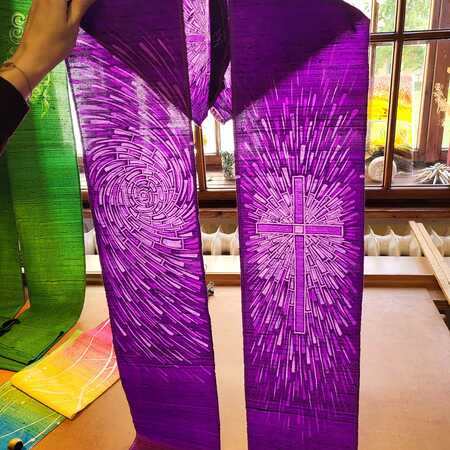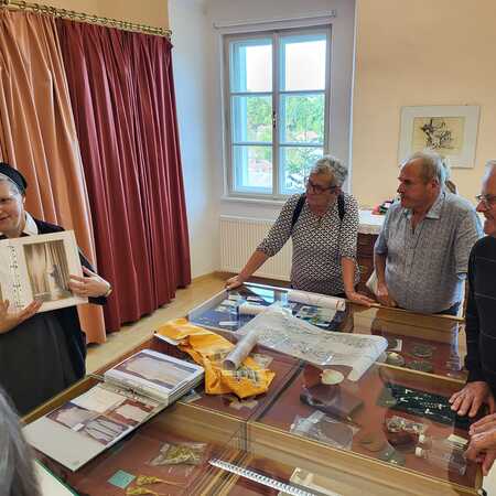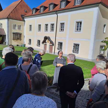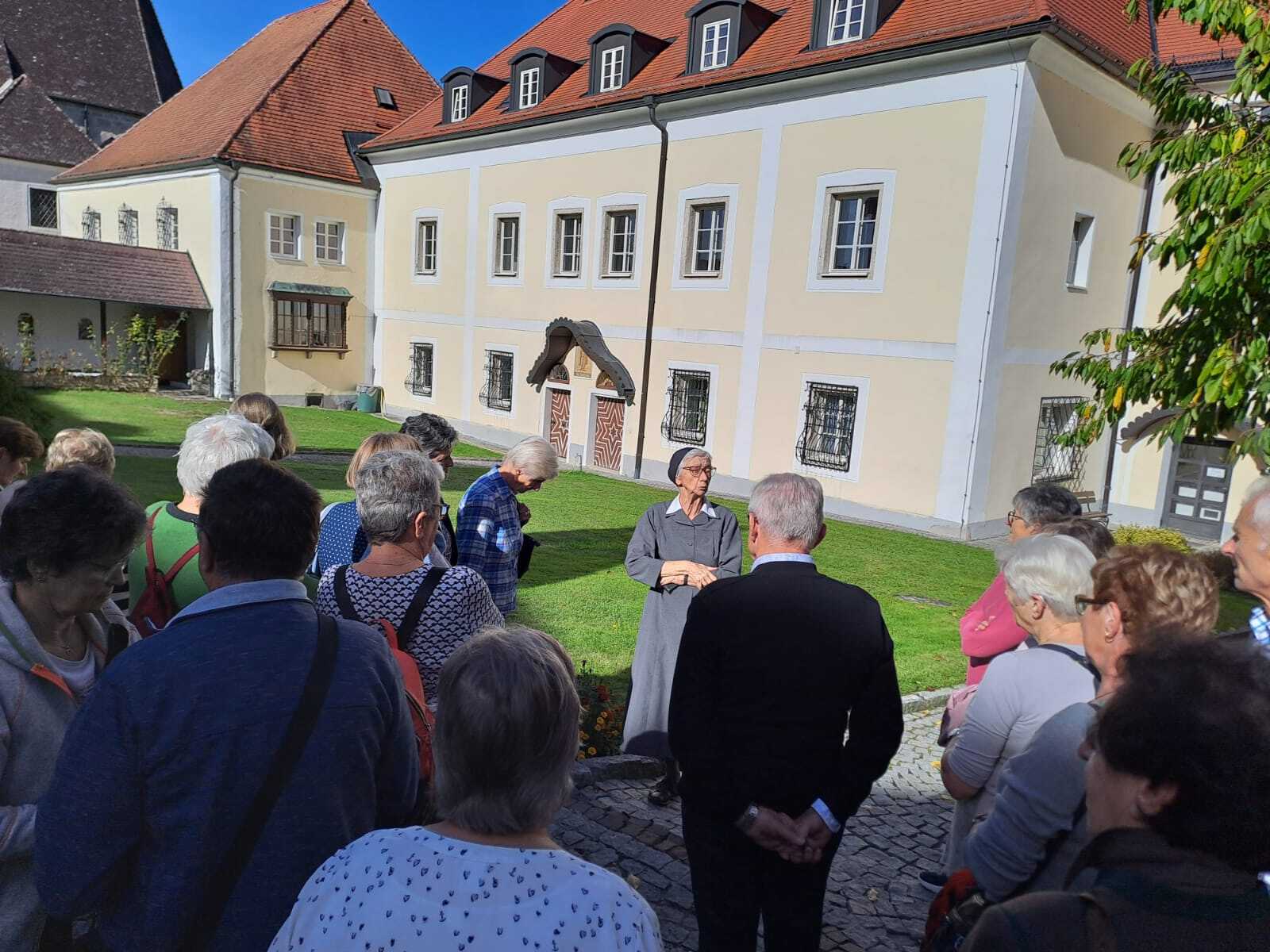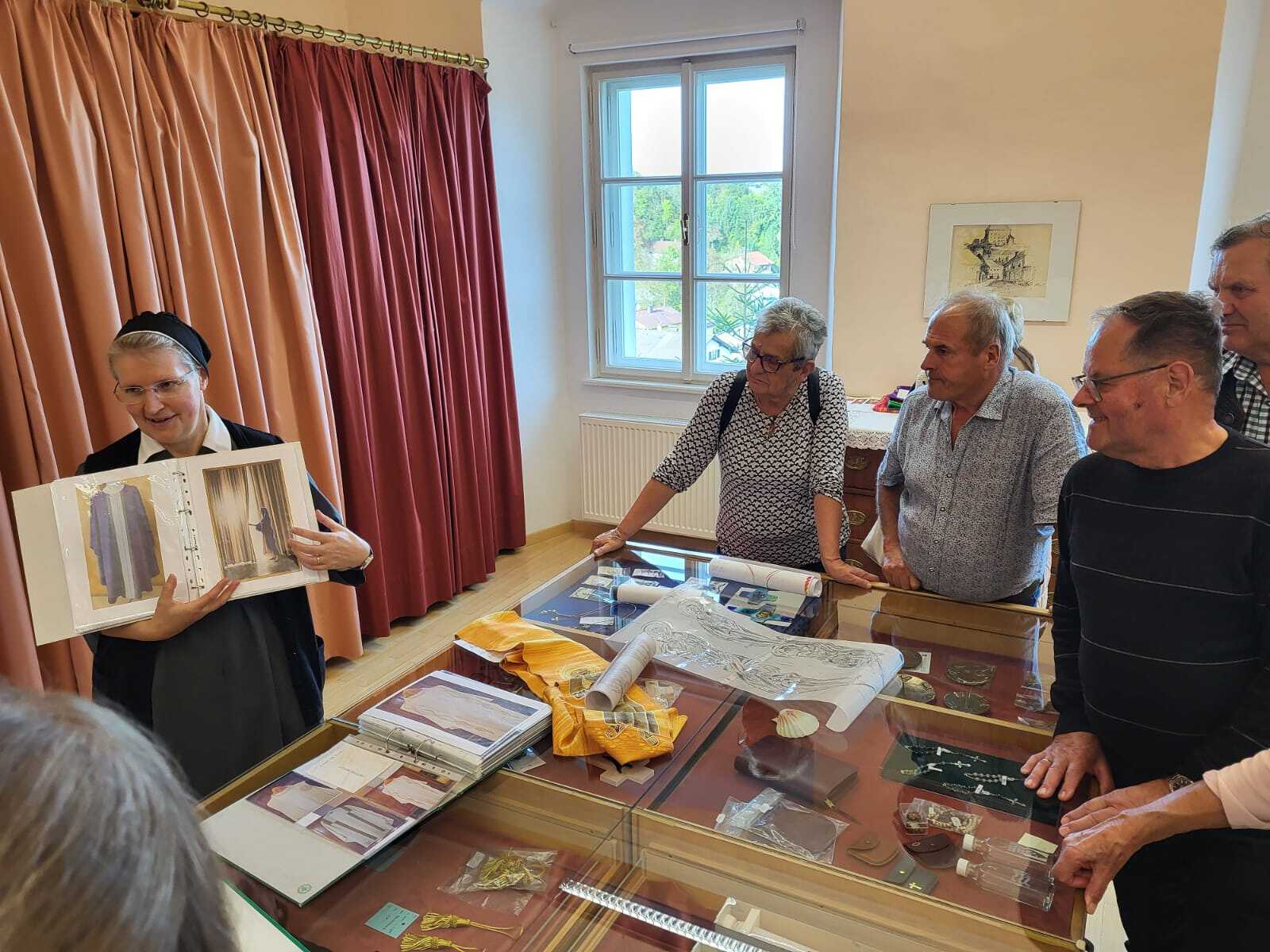 Ein zweiter Höhepunkt war der Besuch des Benediktinerinnenklosters Steinerkirchen an der Traun, wo wir in die Geschichte der dort lebenden 57 Benediktinerinnen sowie in die Kunst der Paramentik eingeführt wurden. Wir erlebten, wie die qualitätvollen liturgischen Gewänder und gottesdienstlichen Textilien in künstlerischer Handarbeit entstehen und auch fachgerecht restauriert werden, erfuhren aber auch von der Entstehung des Ordens, dem Alltagsleben und Nachwuchssorgen der Benediktinerinnen (deren Altersdurchschnitt weit über 80 ist!)