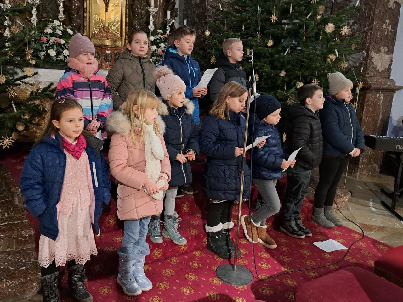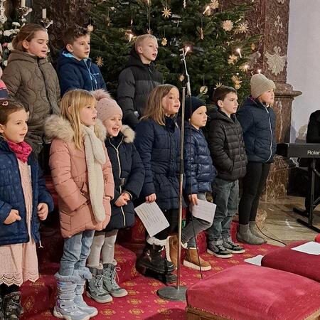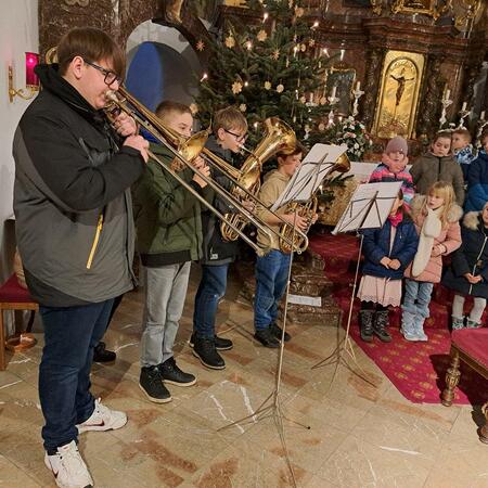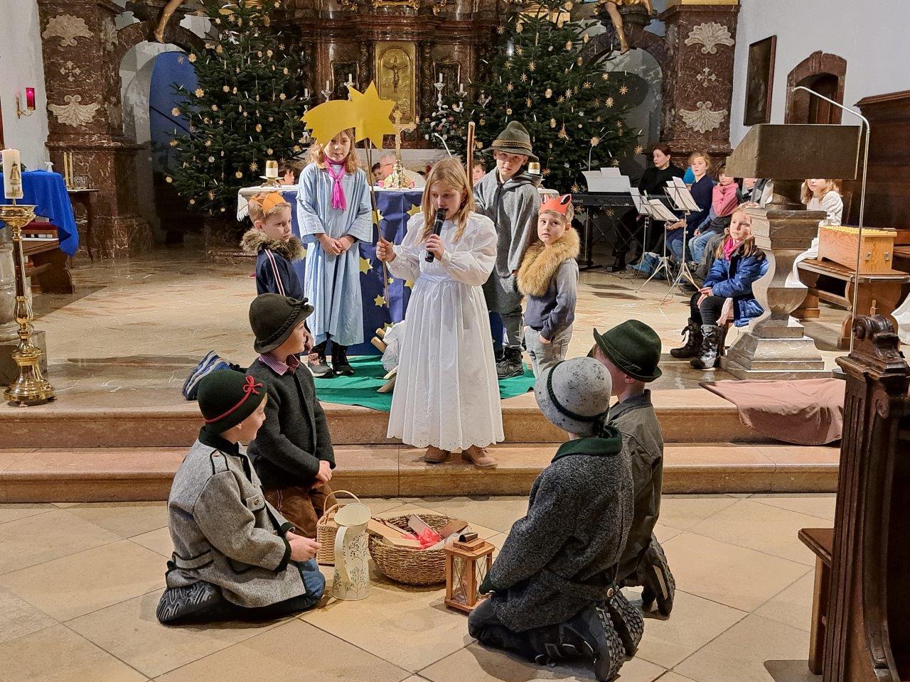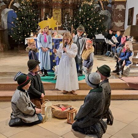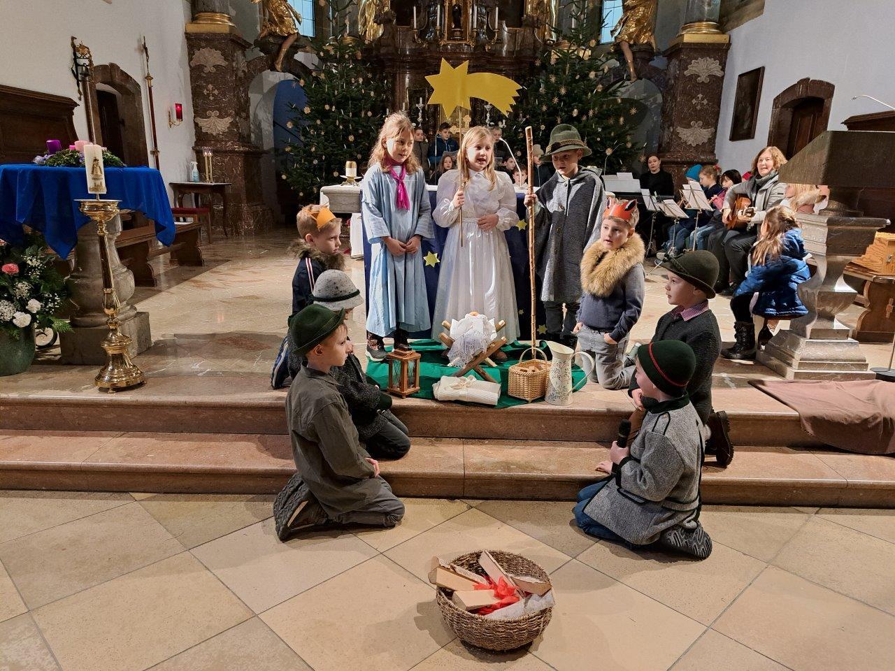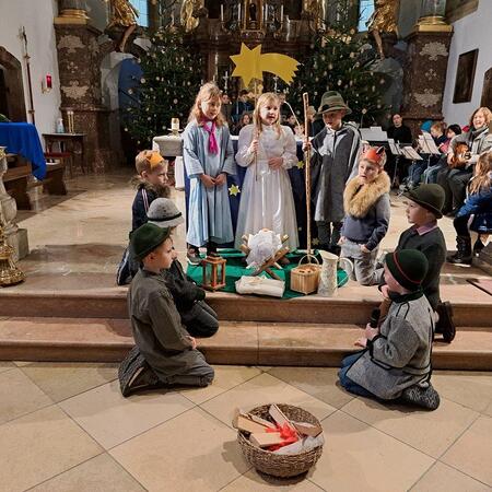 Jesus, das Kind in der Krippe, ist das große Geschenk, das uns der liebende Gott macht. Die Kinder der 2b-Klasse der VS (mit ihrer Lehrerin Christine Hinterleitner) begeisterten mit ihrem Weihnachts-Theaterstück die Gottesdienstbesucher; die schwungvollen Lieder der Volksschüler, begleitet von Gertraud und Sarah Handsteiner, und das junge Bläserquartett gaben der Feier einen weihnachtlich würdigen Rahmen.