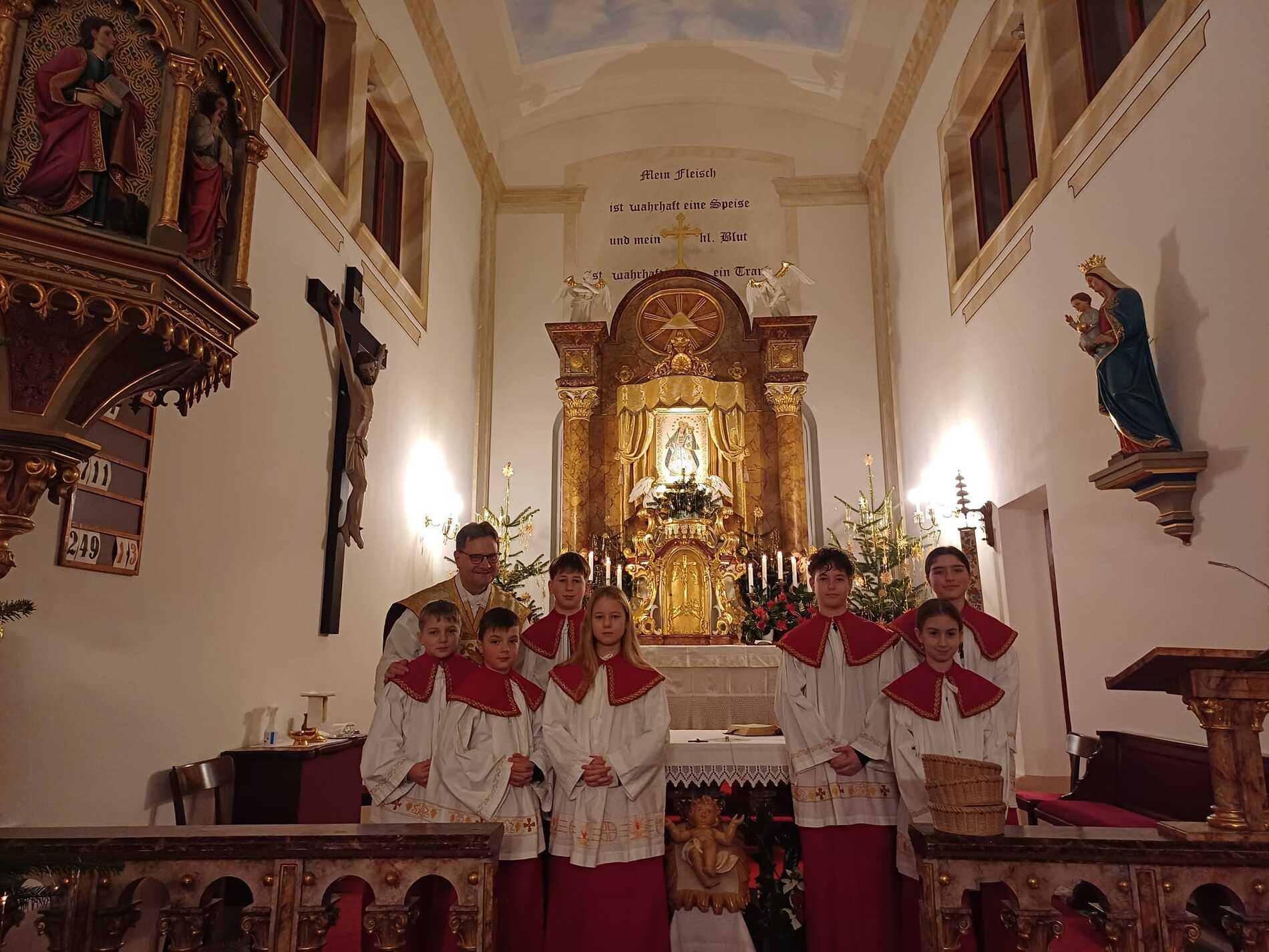 Vor der Feier der Christmetten empfingen Bläserensembles in der Wallfahrtskirche Maria Seesal und in Ybbsitz die Gottesdienstbesucher - sie machten die Botschaft des Heiligen Abends hörbar und stimmten auf das wunderbare Ereignis der Heiligen Nacht ein. In einer besonders festlichen Atmosphäre wurde die Geburt Jesu als das zentrale Ereignis des Christfestes gefeiert, das nicht die Wintersonnenwende oder ein heidnisches Fest, sondern die Menschwerdung Gottes ist, damit wir alle Kinder Gottes werden können, so P. Jacobus in seiner Predigt. Die feierlichen Messen wurden in beiden Kirchen von Bläserensembles mitgestaltet.