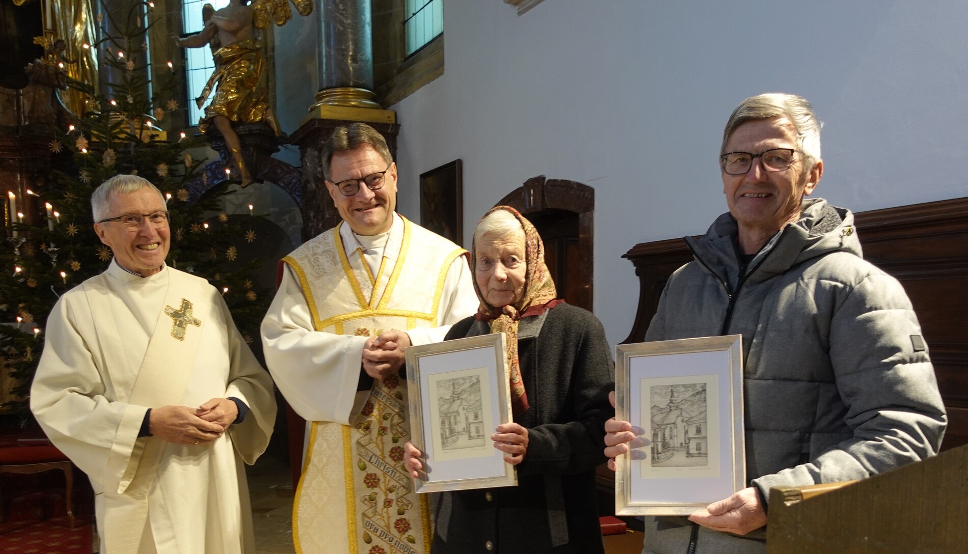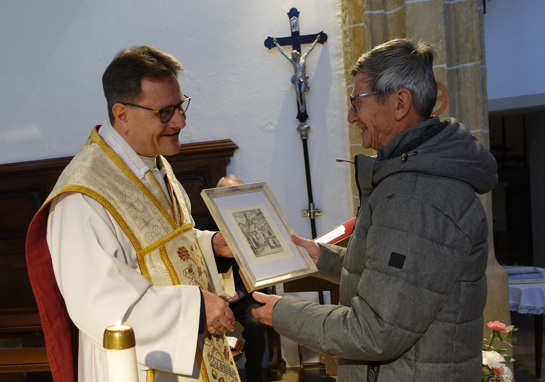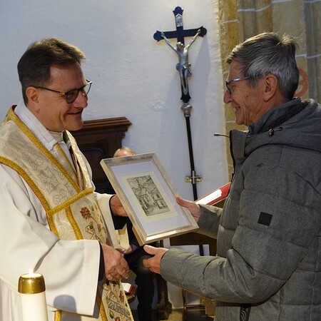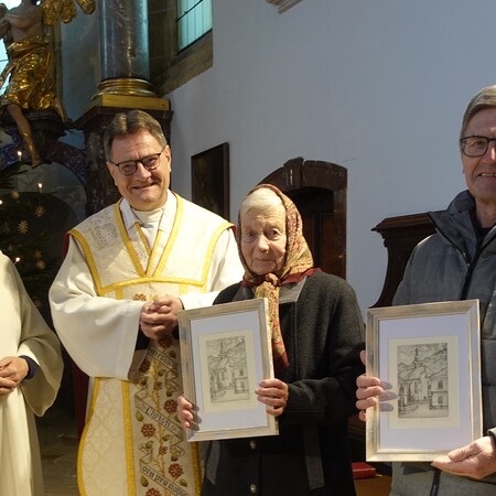 P. Jacobus sprach ihnen Dank und Anerkennung aus und überreichte eine Radierung von P. Martin Mayerhofer mit einer Ansicht unserer Pfarrkirche. Die Gottesdienstbesucher bedankten sich mit einem kräftigen Applaus.