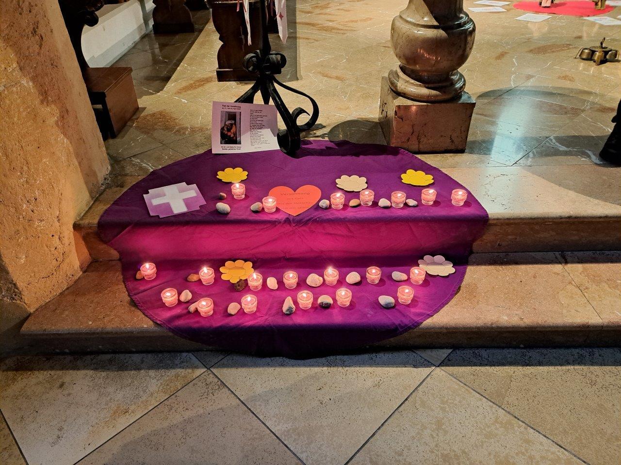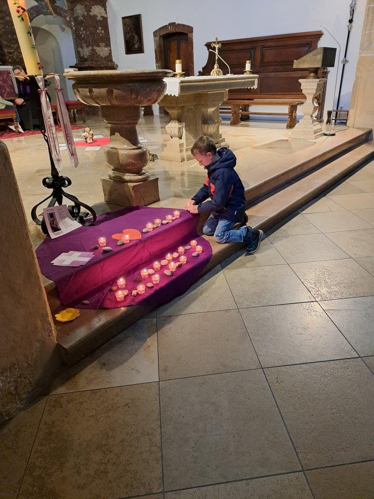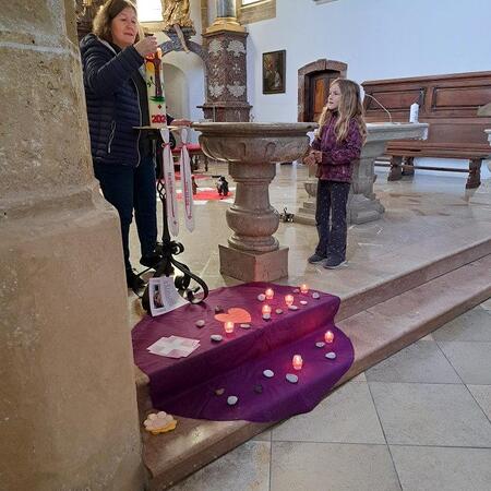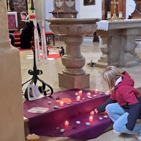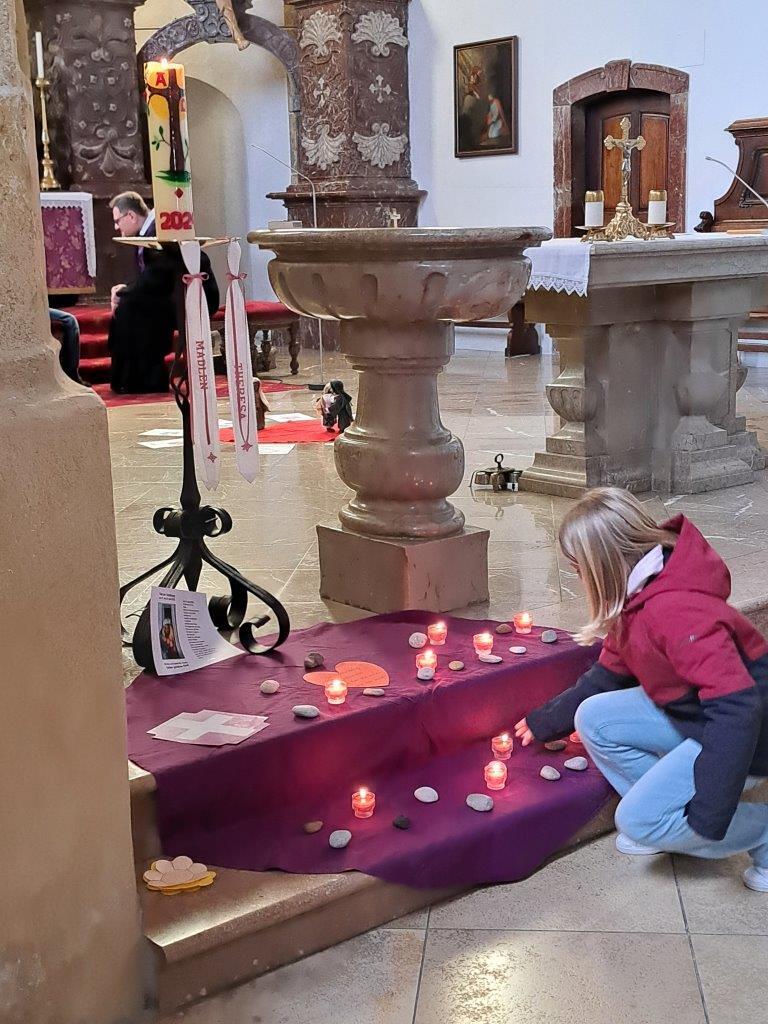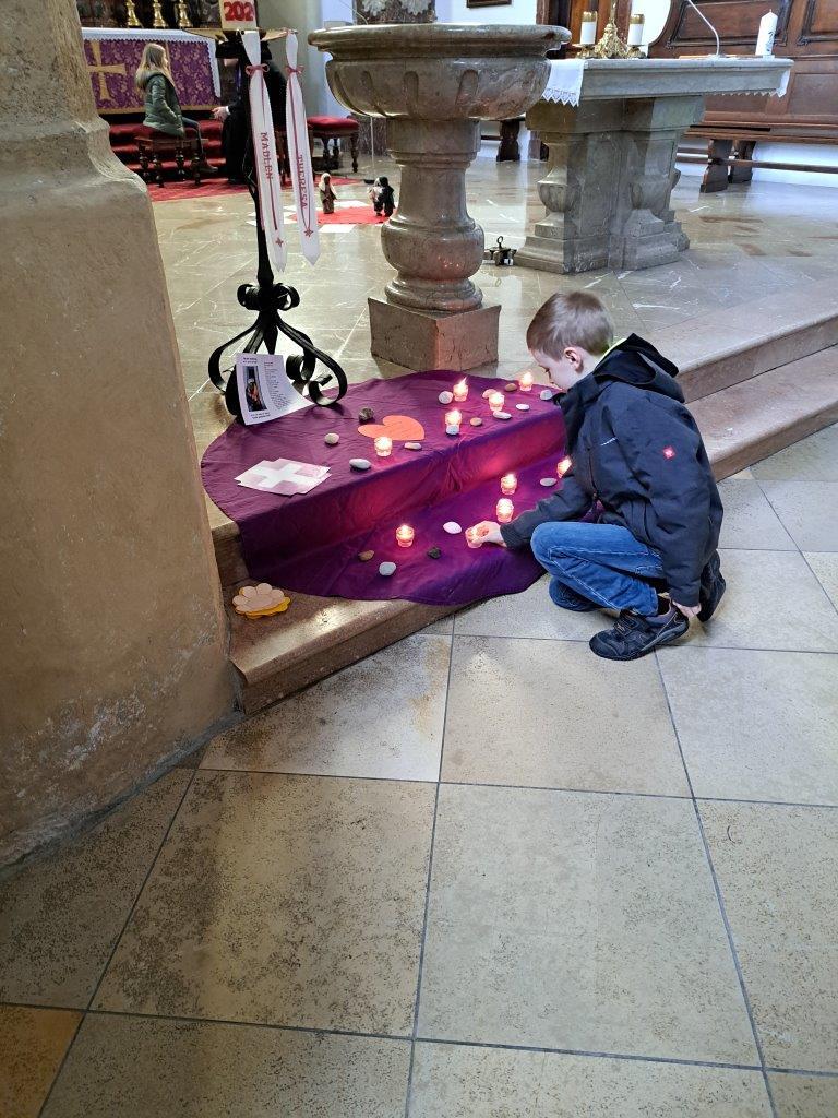 Gemeinsam mit ihrer erwachsenen Begleitperson nahmen die Kinder dann im hinteren Teil der Kirche Platz, bereiteten sich persönlich noch einmal auf die Beichte vor und gestalteten bei meditativer Musik ein Bild für ihr Religionsheft. Daraufhin gingen sie einzeln in Begleitung ihrer Religionslehrerin nach vorne und legten einen Stein – Symbol für alles Belastende – bei der Osterkerze ab. Nach der Beichte im Altarraum bekam jedes Kind von P. Jacobus ein Teelicht, das an der Osterkerze entzündet wurde. Dieses Symbol für das neue Licht im Herzen durfte es auf das violette Tuch zu den Steinen stellen.
