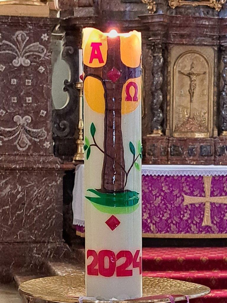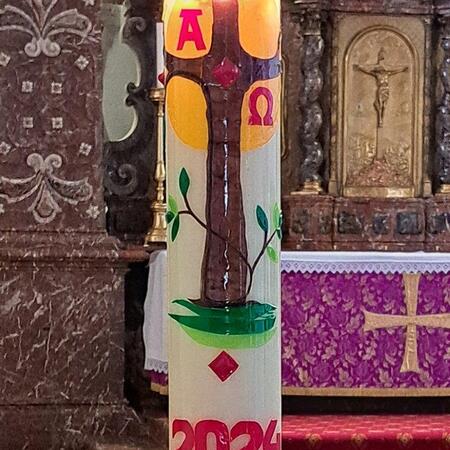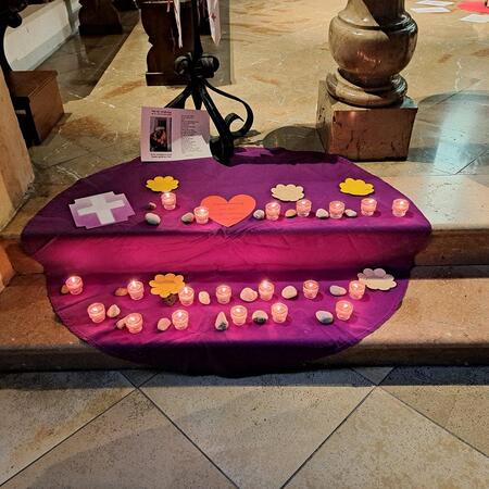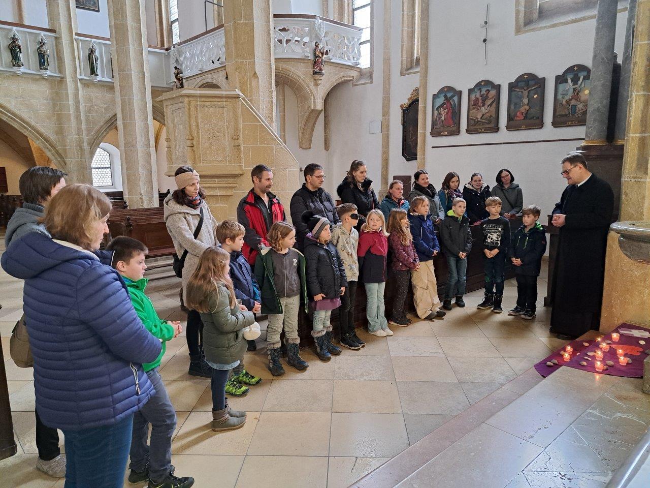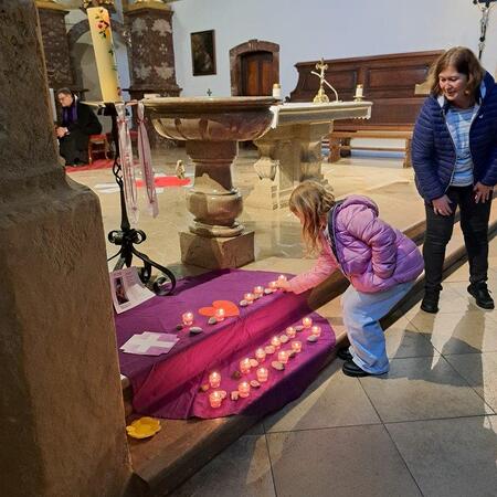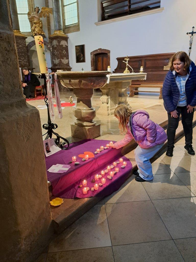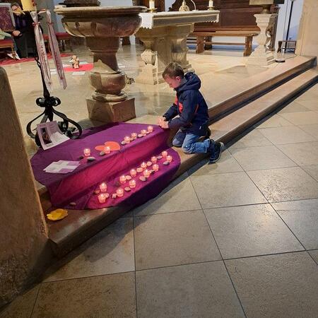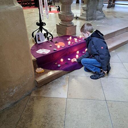 Gemeinsam mit ihrer erwachsenen Begleitperson nahmen die Kinder dann im hinteren Teil der Kirche Platz, bereiteten sich persönlich noch einmal auf die Beichte vor und gestalteten bei meditativer Musik ein Bild für ihr Religionsheft. Daraufhin gingen sie einzeln in Begleitung ihrer Religionslehrerin nach vorne und legten einen Stein – Symbol für alles Belastende – bei der Osterkerze ab. Nach der Beichte im Altarraum bekam jedes Kind von P. Jacobus ein Teelicht, das an der Osterkerze entzündet wurde. Dieses Symbol für das neue Licht im Herzen durfte es auf das violette Tuch zu den Steinen stellen.