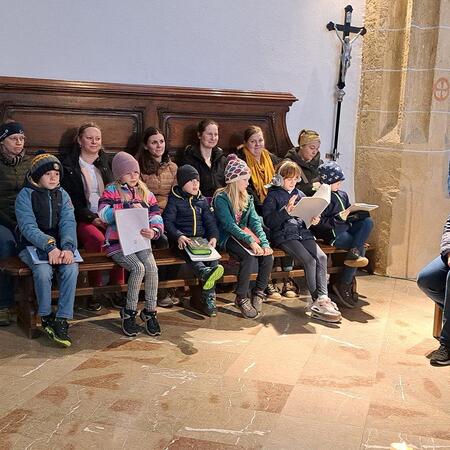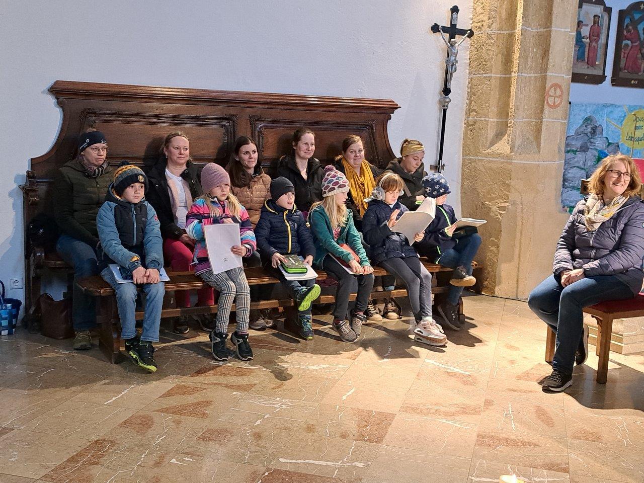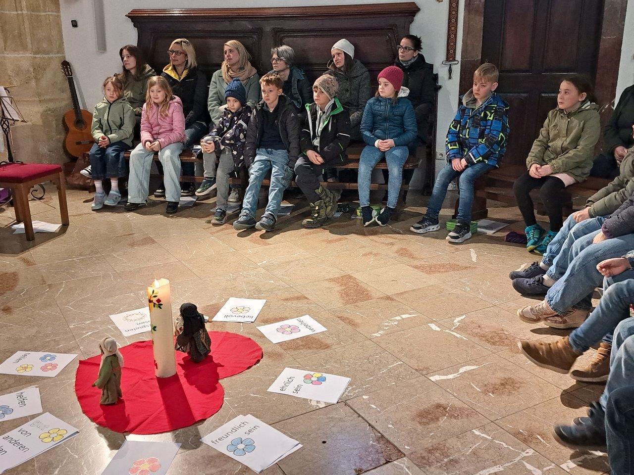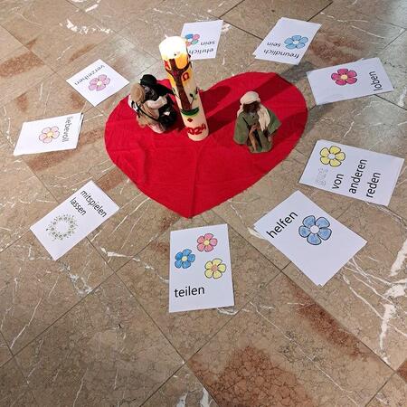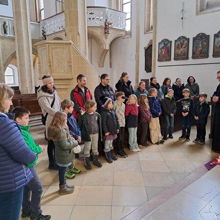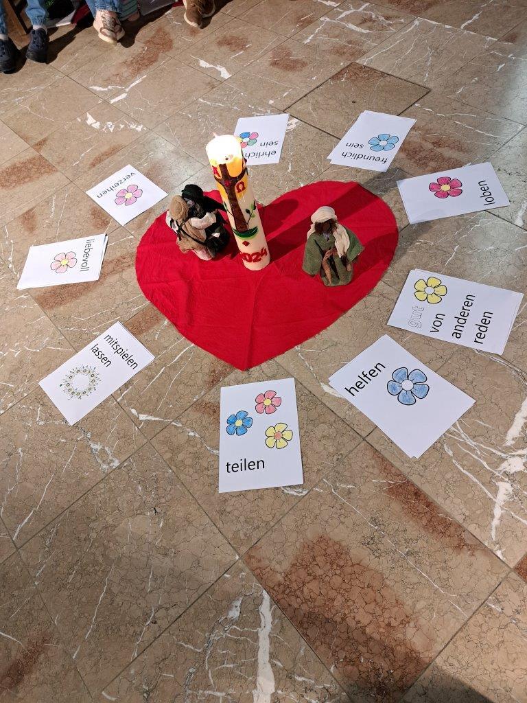 In einem Weggottesdienst – wie gewohnt im Altarraum – wurden die Kinder zu Beginn mit dem Gleichnis vom verlorenen Sohn und dem barmherzigen Vater darauf eingestimmt, dass Gott uns mit offenen Armen entgegenkommt und uns wieder liebevoll aufnimmt, wenn wir zu ihm heimkommen und um seine Verzeihung bitten für das, was uns nicht gelungen ist und uns von ihm und unseren Mitmenschen entfernt hat.