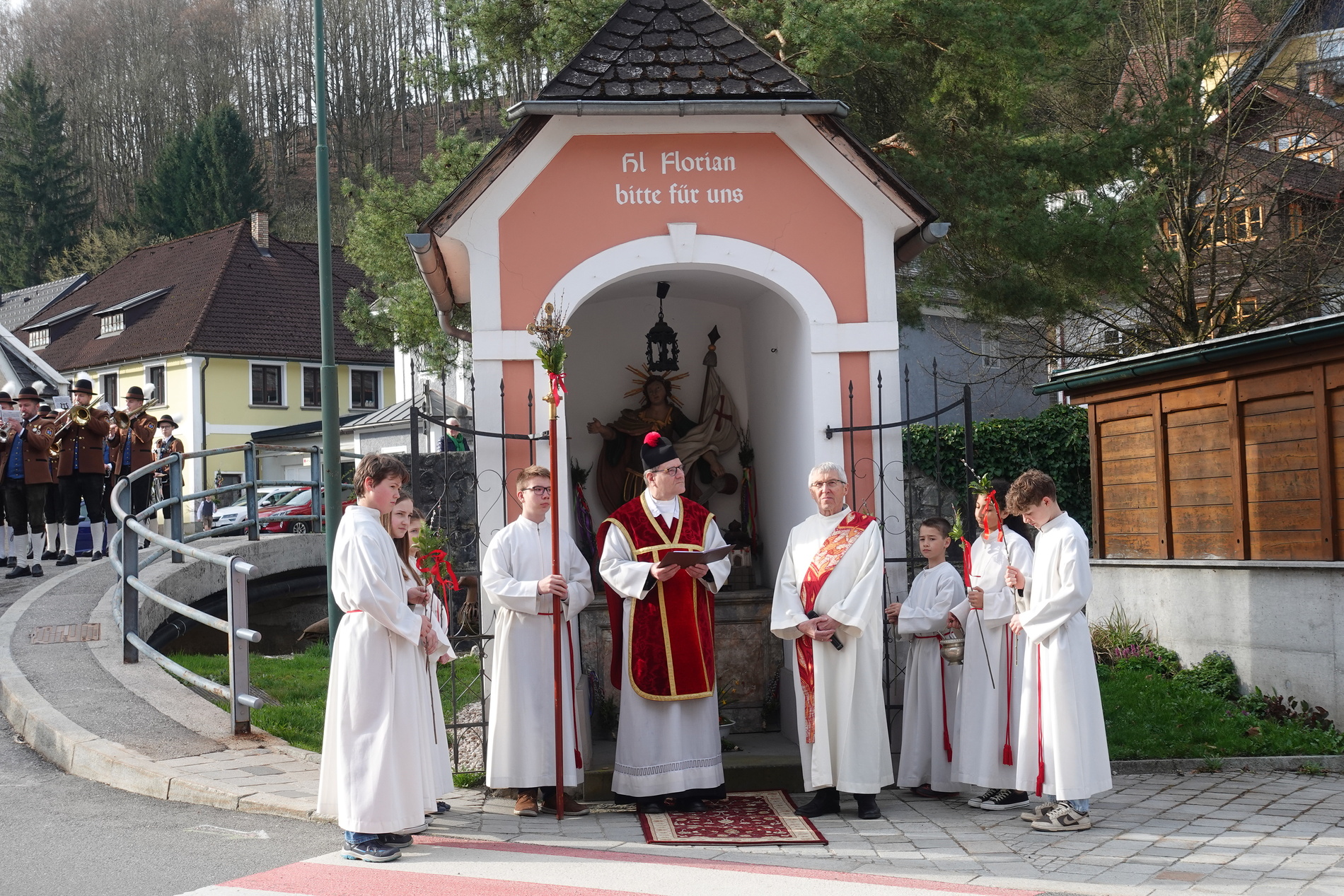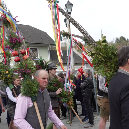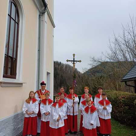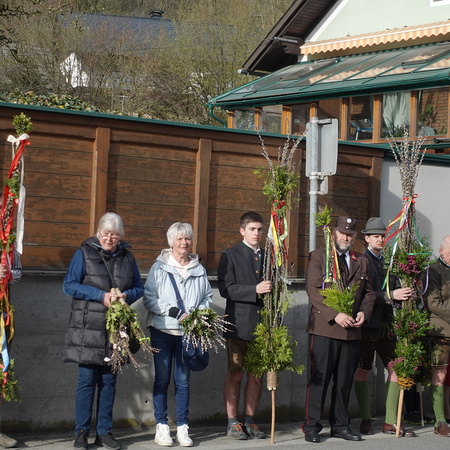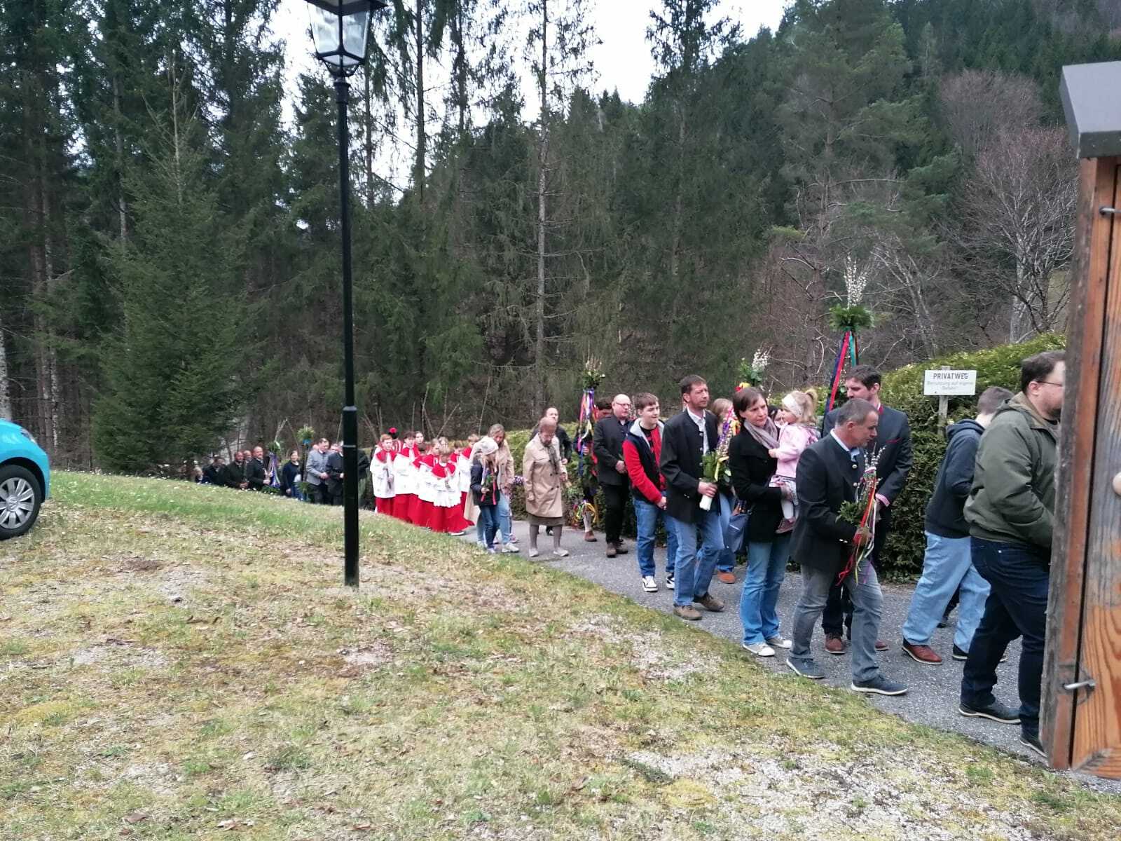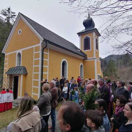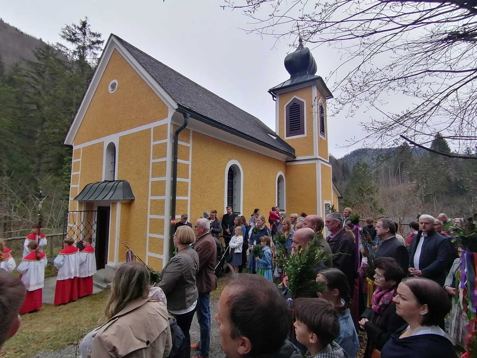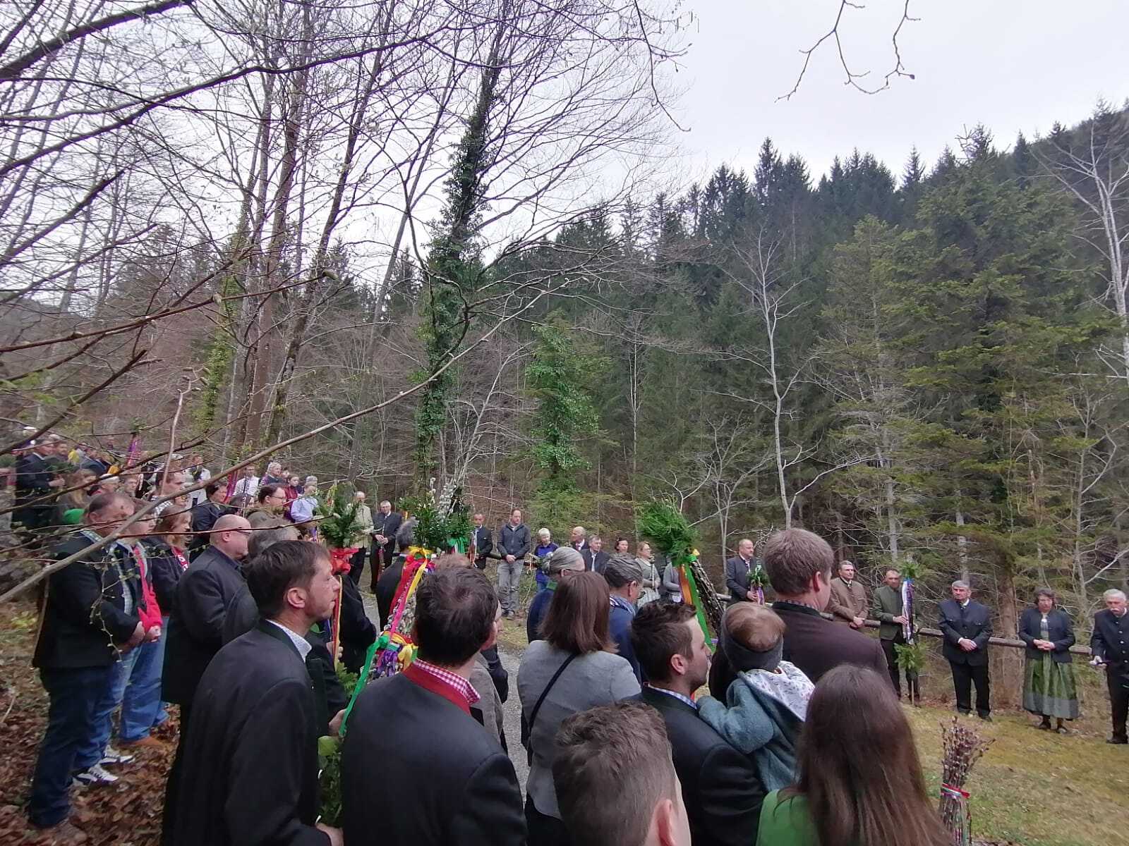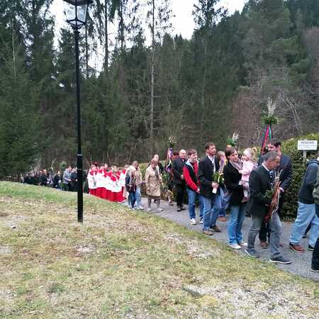 Der Pfarrer bedankte sich bei allen Mitfeiernden sowie der Musikkapelle und Feuerwehr und bat gleichzeitig um deren Dienst auch in der Osternacht. Er lud auch zur Mitfeier der Karwoche ein und machte sich im Anschluss auf den Weg nach Maria Seesal, wo die Palmzweige bei der Ursprungskapelle gesegnet wurden und dann die Prozession zur Wallfahrtskirche führte.