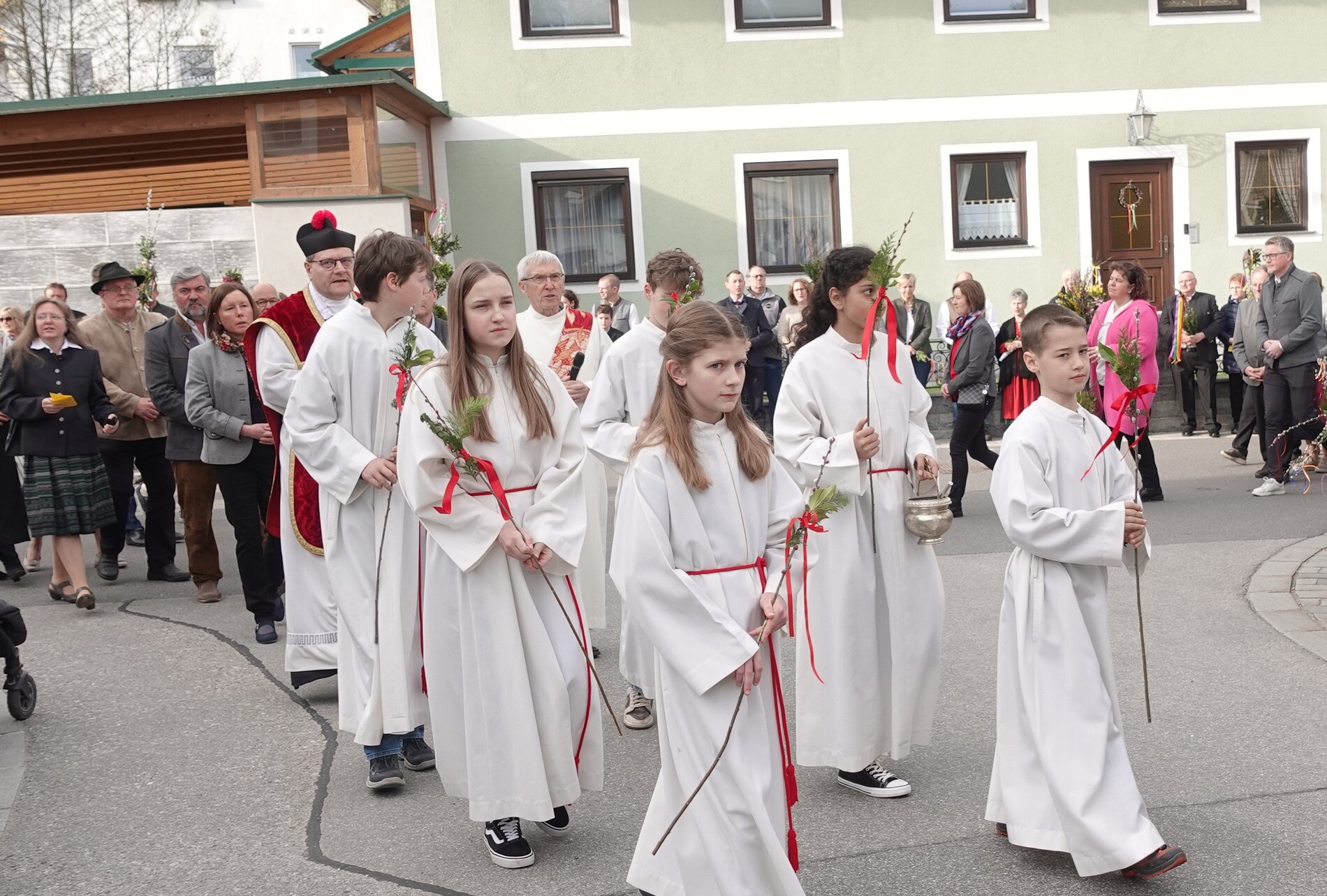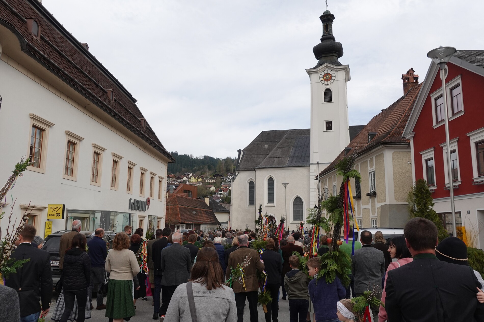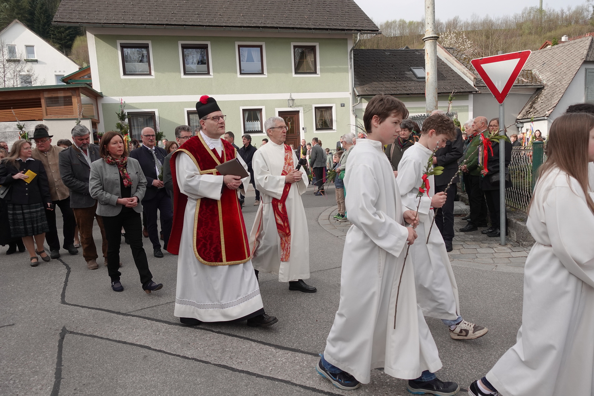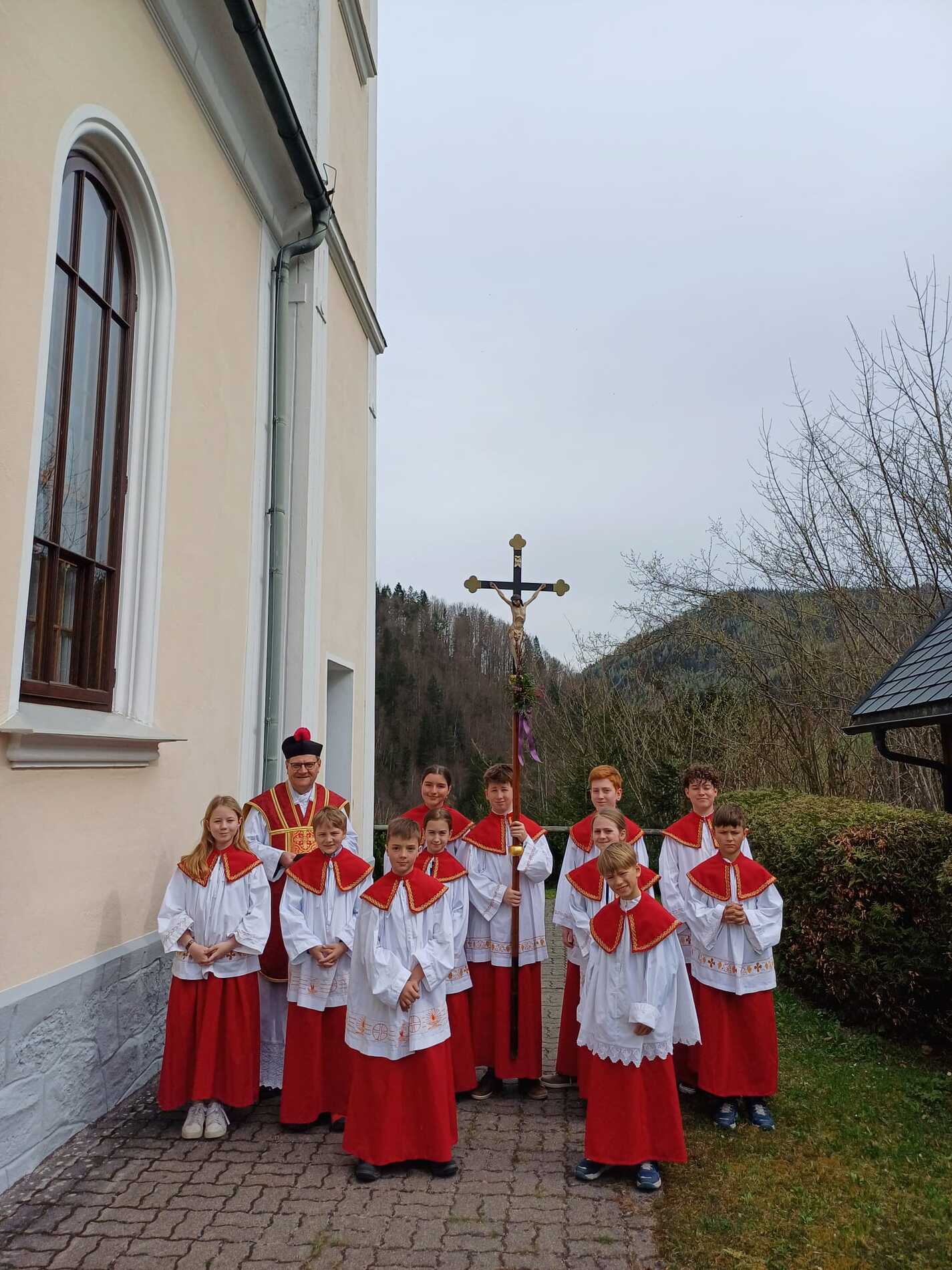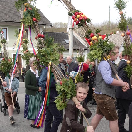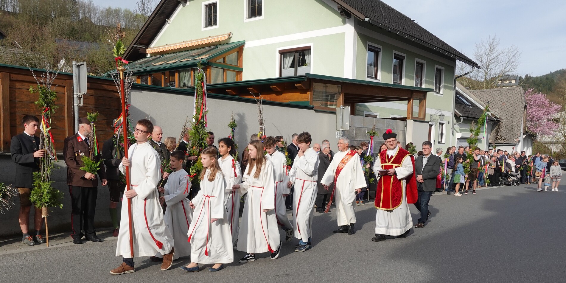 Der Pfarrer bedankte sich bei allen Mitfeiernden sowie der Musikkapelle und Feuerwehr und bat gleichzeitig um deren Dienst auch in der Osternacht. Er lud auch zur Mitfeier der Karwoche ein und machte sich im Anschluss auf den Weg nach Maria Seesal, wo die Palmzweige bei der Ursprungskapelle gesegnet wurden und dann die Prozession zur Wallfahrtskirche führte.