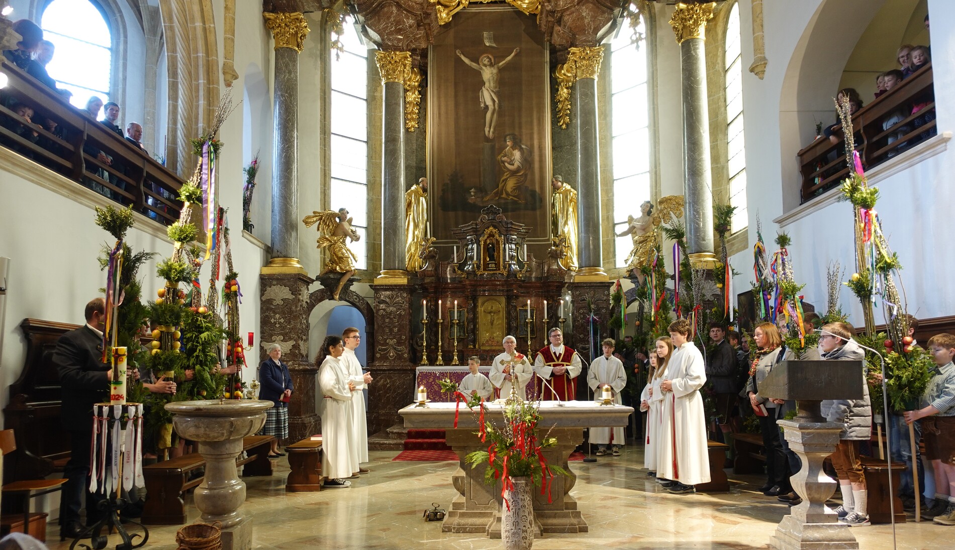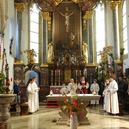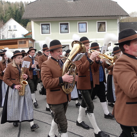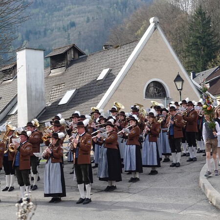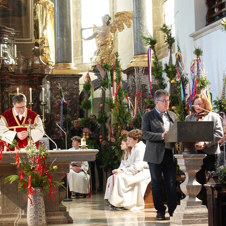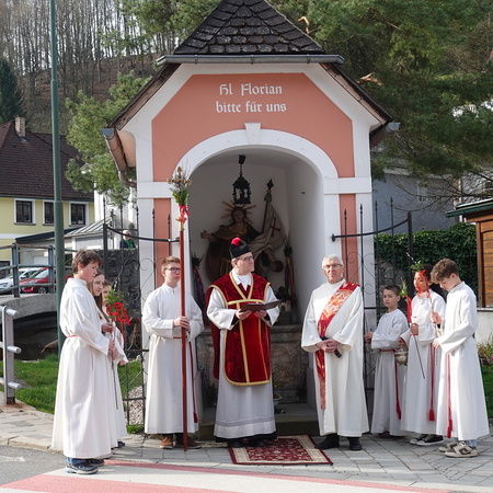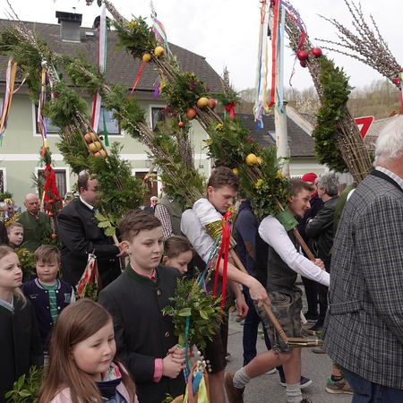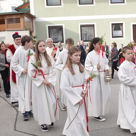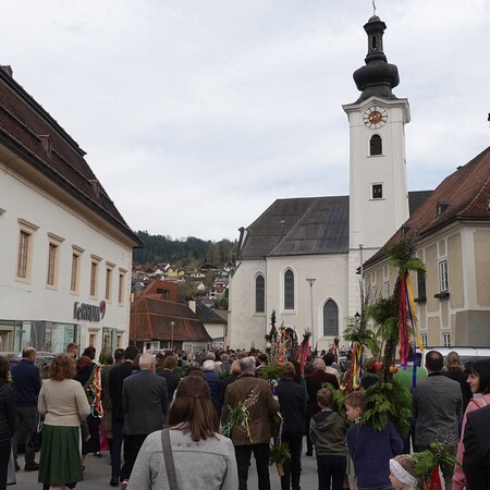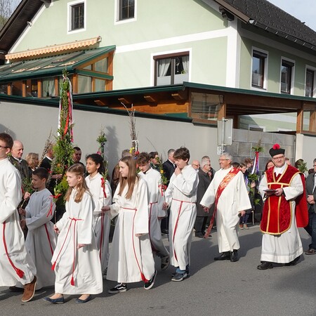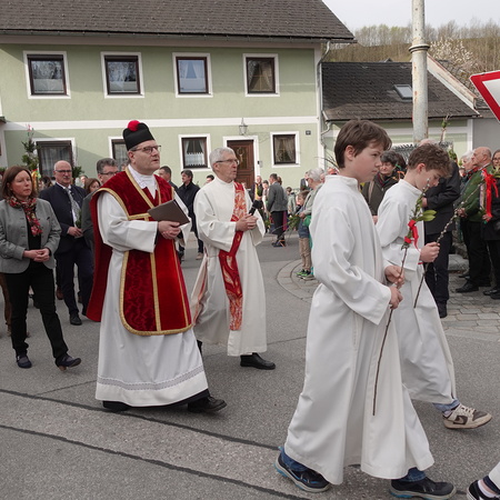 Sehr viele Pfarrangehörige hatten sich mit ihren schönen Palmbuschen bei der Florianikapelle eingefunden, wo das Evangelium vom Einzug Jesu in Jerusalem den Jubel des Palmsonntags zum Ausdruck brachte. Nach der Segung der Palmzweige und unter den festlichen Klängen der Musikkapelle zog die Pfarrgemeinde, Gott lobend, zur Kirche. Es ist immer wieder erhebend und berührend, wenn unser Gotteshaus mit Gebet und Gesang so vieler Menschen erfüllt wird.