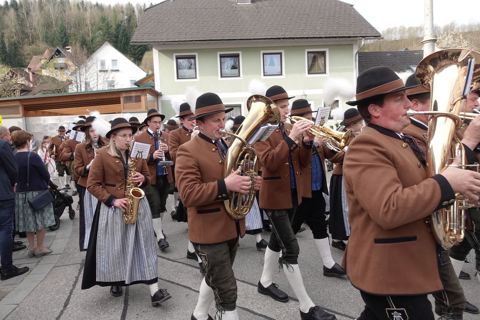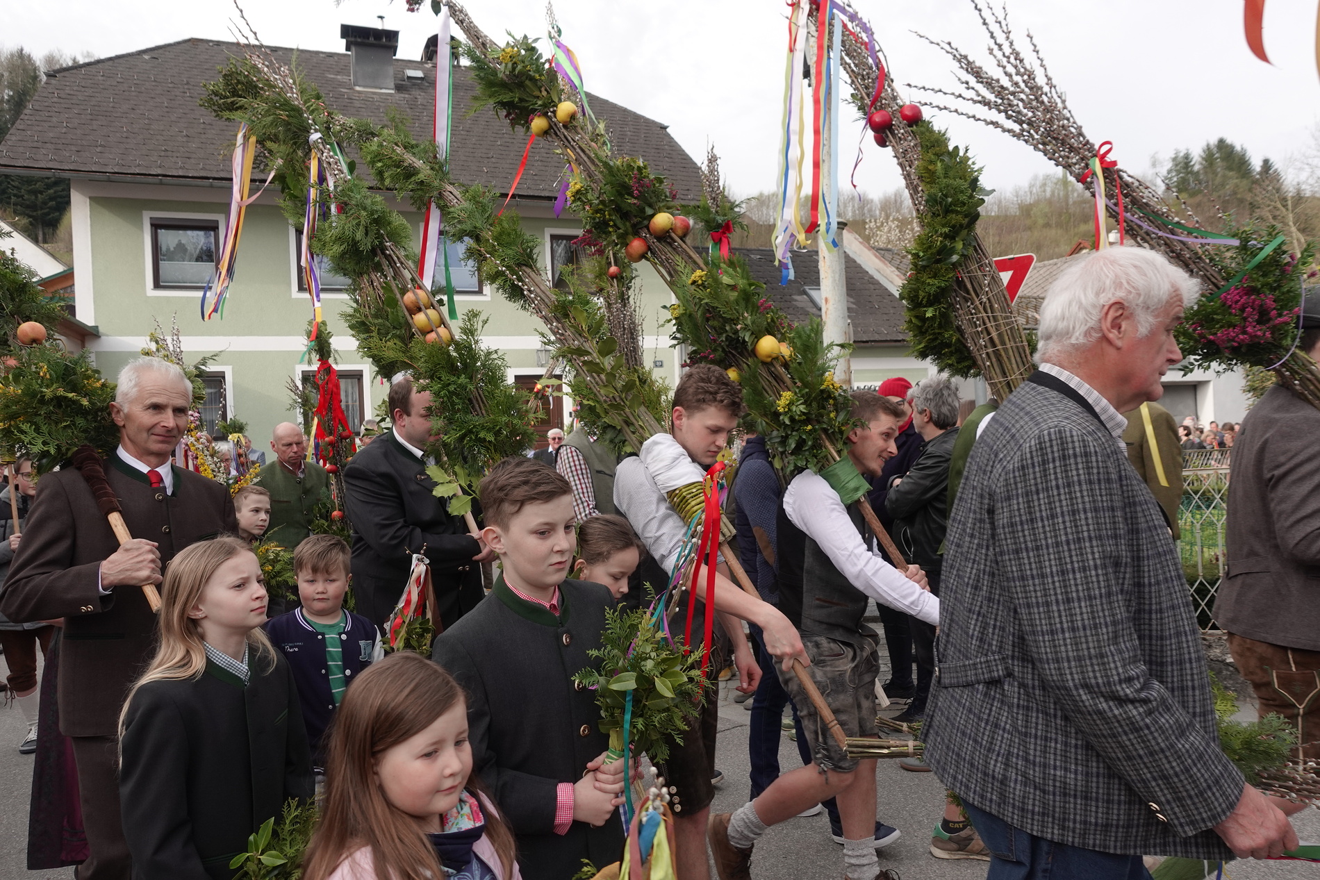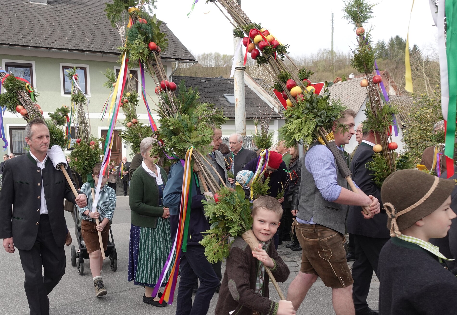 Sehr viele Pfarrangehörige hatten sich mit ihren schönen Palmbuschen bei der Florianikapelle eingefunden, wo das Evangelium vom Einzug Jesu in Jerusalem den Jubel des Palmsonntags zum Ausdruck brachte. Nach der Segung der Palmzweige und unter den festlichen Klängen der Musikkapelle zog die Pfarrgemeinde, Gott lobend, zur Kirche. Es ist immer wieder erhebend und berührend, wenn unser Gotteshaus mit Gebet und Gesang so vieler Menschen erfüllt wird.