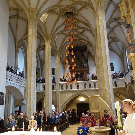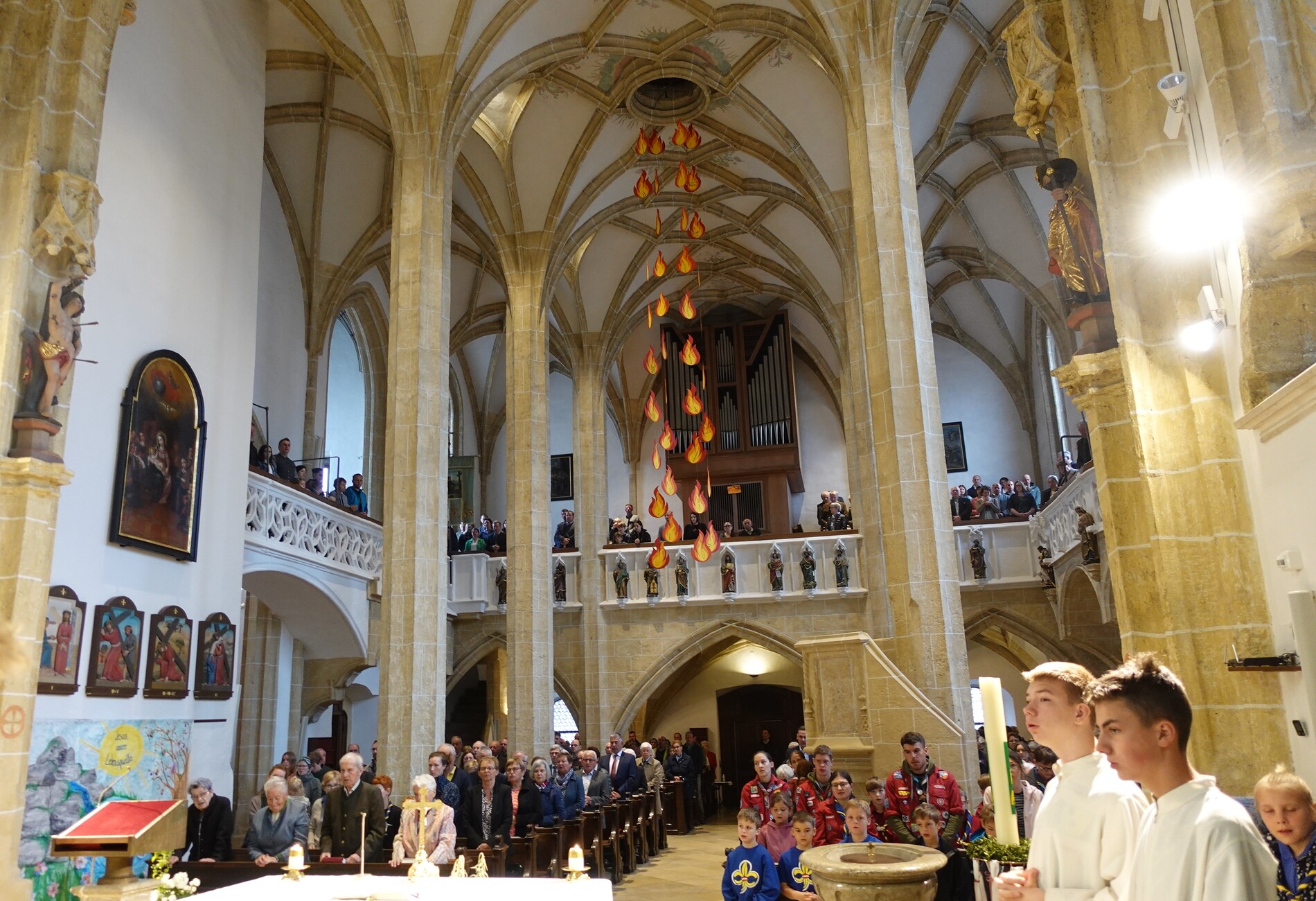 In der Predigt wurde im ersten Teil auf das Wesen des Heiligen Geistes eingegangen, als dritte göttliche Person, als wahren Gott und Lebensspender, als Heiligmacher, Tröster, Beistand und Vollender. Wir Christen haben ihn in der Taufe empfangen und sind von ihm bei der Firmung gestärkt worden. Er ist die Liebe, die die Herzen entflammt und sie zum Guten antreibt. Ausgehend von der Lesung aus der Apostelgeschichte, die beschreibt, welche Veränderung die Apostel durch die Herabkunft des Heiligen Geistes erfahren haben, wurde dargelegt, dass der Heilige Geist alle Angst und Mutlosigkeit weggenommen, alle Verwirrung beseitigt hat.