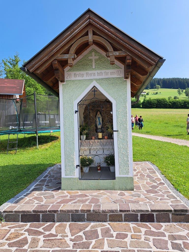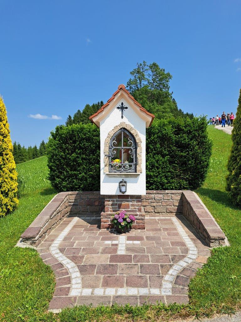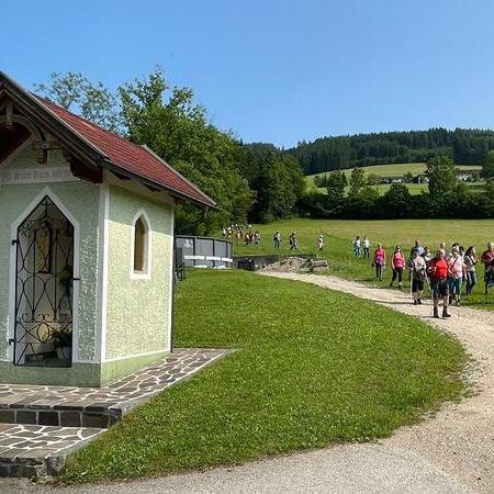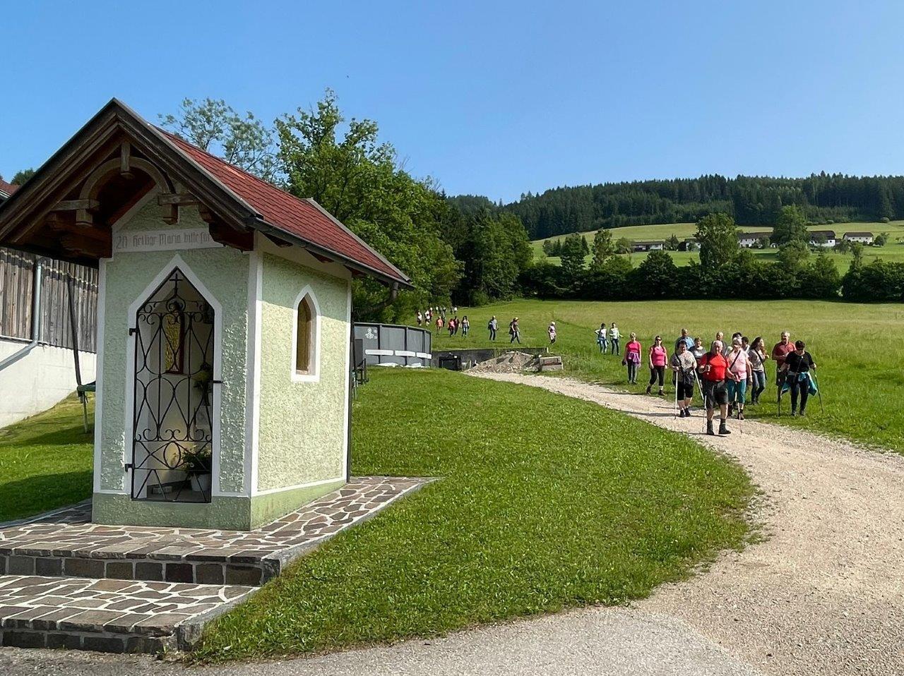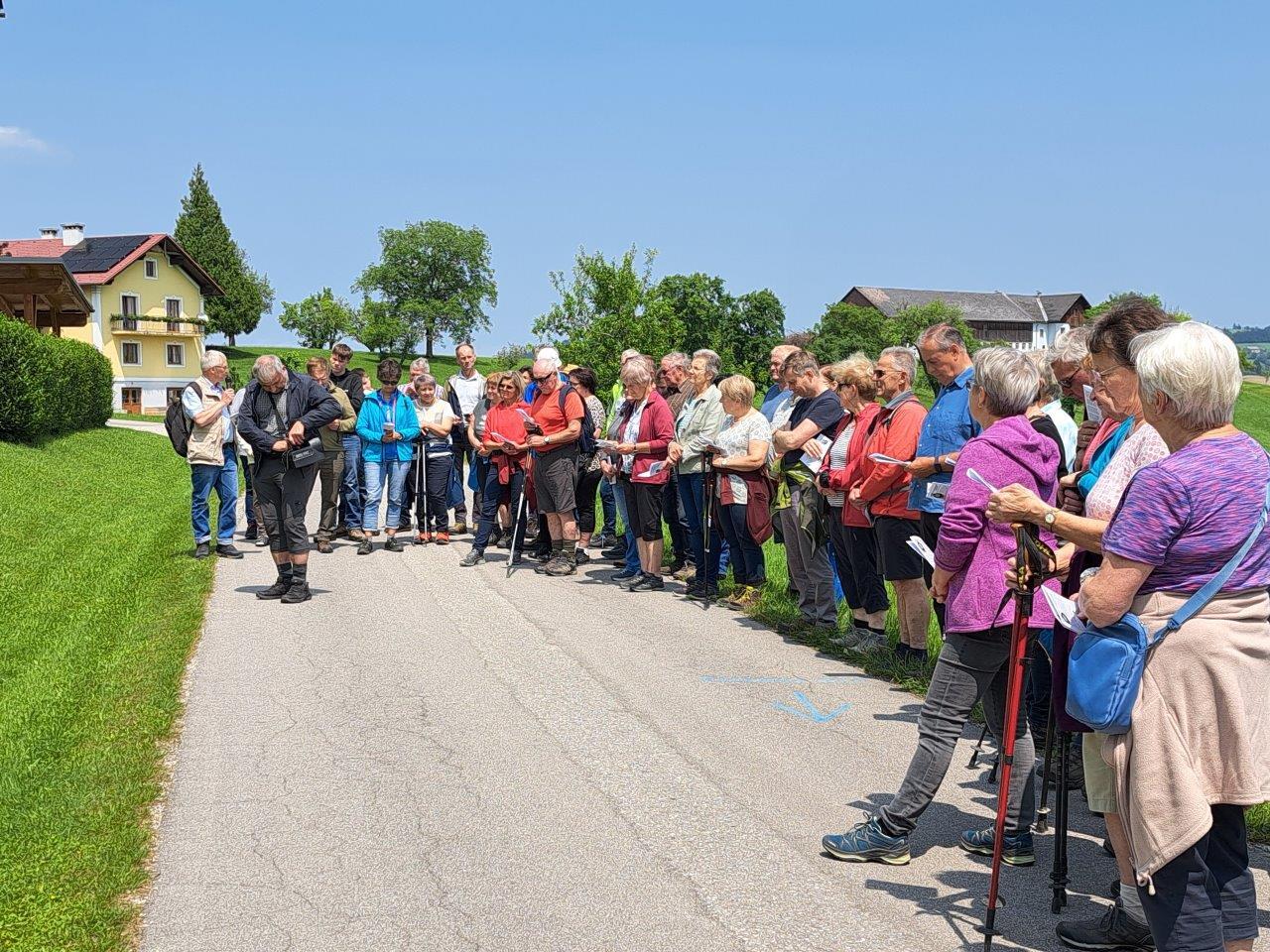 Beim Reitbauern segnete Diakon Hermann das 2018 errichtete und jetzt wieder neu gestaltete Wegkreuz, und nach dem Pilgersegen ging es in insgesamt 7 Stationen über den Hubberggipfel bis zum Haus Niederbach-Hofstatt. Bei jeder der 4 Kapellen und bei jedem der 3 Kreuze gab es einen kurzen Halt mit Liedern, Bibeltexten und Gebeten, die inhaltlich auf das jeweilige religiöse Denkmal abgestimmt waren: Beim Wegkreuz der Familie Staritzbüchler beteten wir um das Feuer der Liebe, bei der Hub-Kapelle um Trost und Hilfe in den Sorgen der Menschen. Vor dem Hubberg-Gipfelkreuz beteten wir gemeinsam um den Hl. Geist, und bei der Kapelle im Ober-Hubegg vertrauten wir uns dem guten Hirten Jesus an. Nach einer Stärkung ging es über Wiesen und einen Waldweg hinunter zur Kreuzkapelle im Flachreith, wo der Dank an Gott, der uns seinen Sohn Jesus geschenkt hat, im Mittelpunkt stand. Bei der Marienkapelle in der Hofstatt erfolgte der Abschluss mit der Bitte um Gottes Segen.