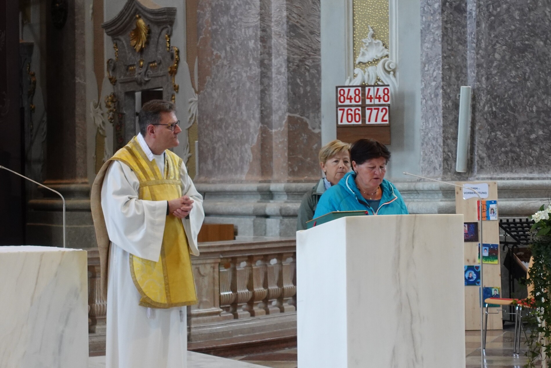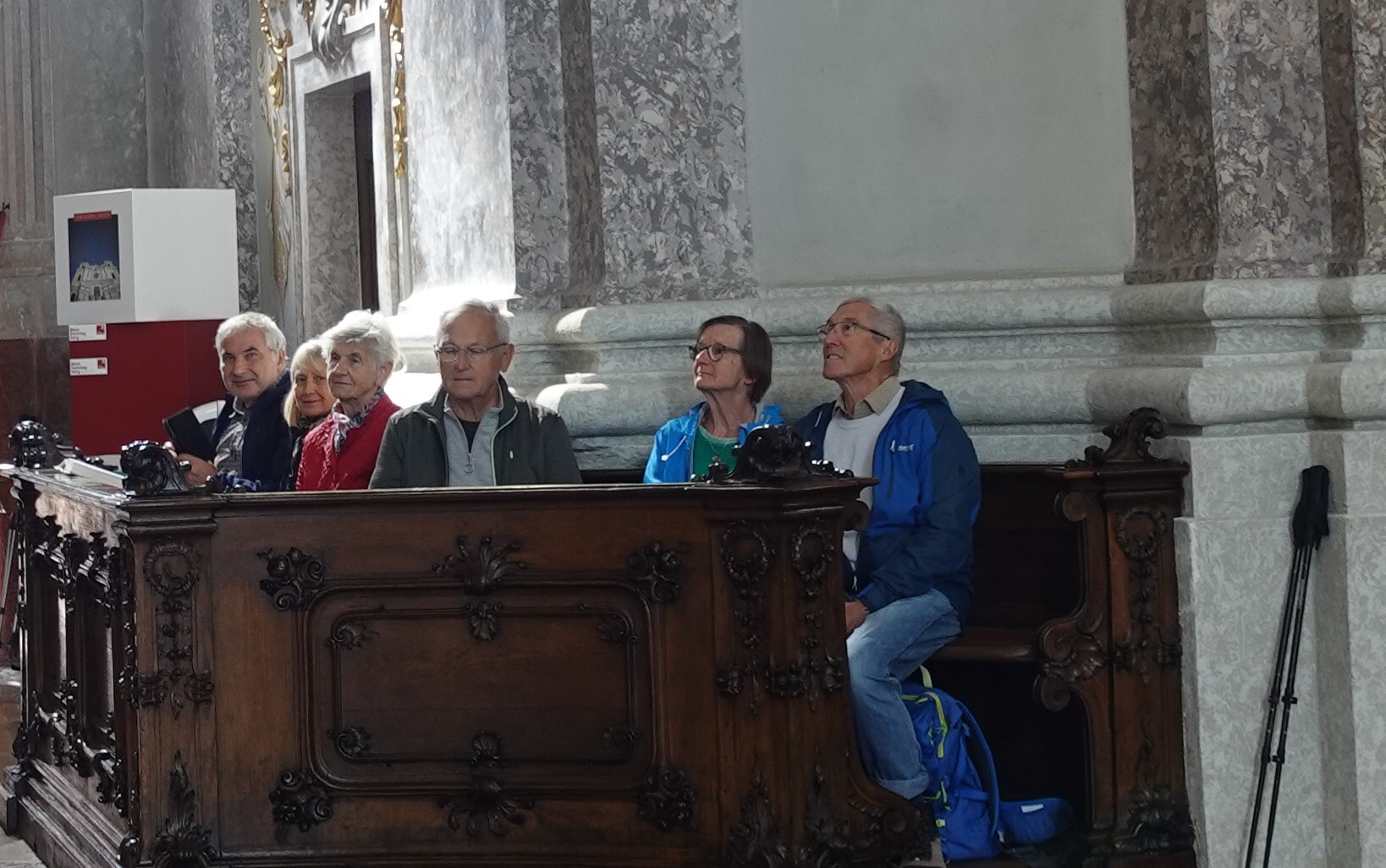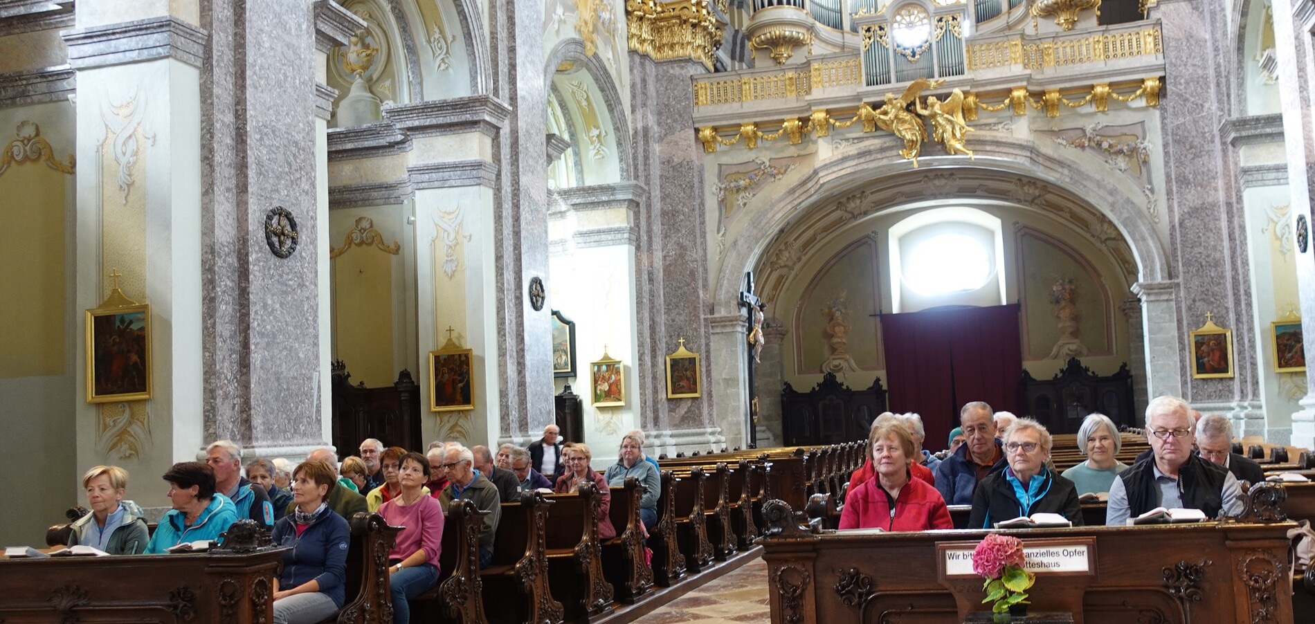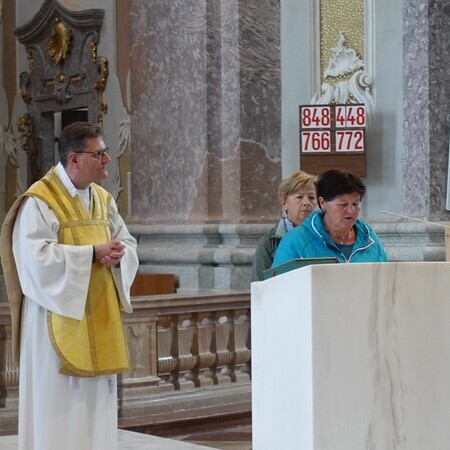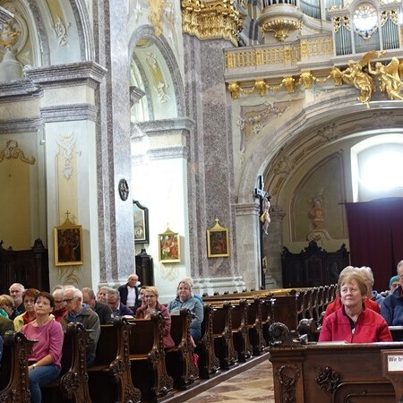 Dieser führte bei angenehmen Temperaturen durch die spätsommerliche, wunderbare Landschaft des Voralpenlandes. Nach ungefähr der halben Wegstrecke erblickten wir die Basilika, was bei manchen die Gedanken und Herzen zum dreifaltigen Gott erhob. P. Franz empfing die Wallfahrer herzlich und wies darauf hin, dass die Ybbsitzer die ersten sind, von denen nachgewiesen ist, dass sie seit 1507 auf den Sonntagberg pilgerten.