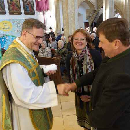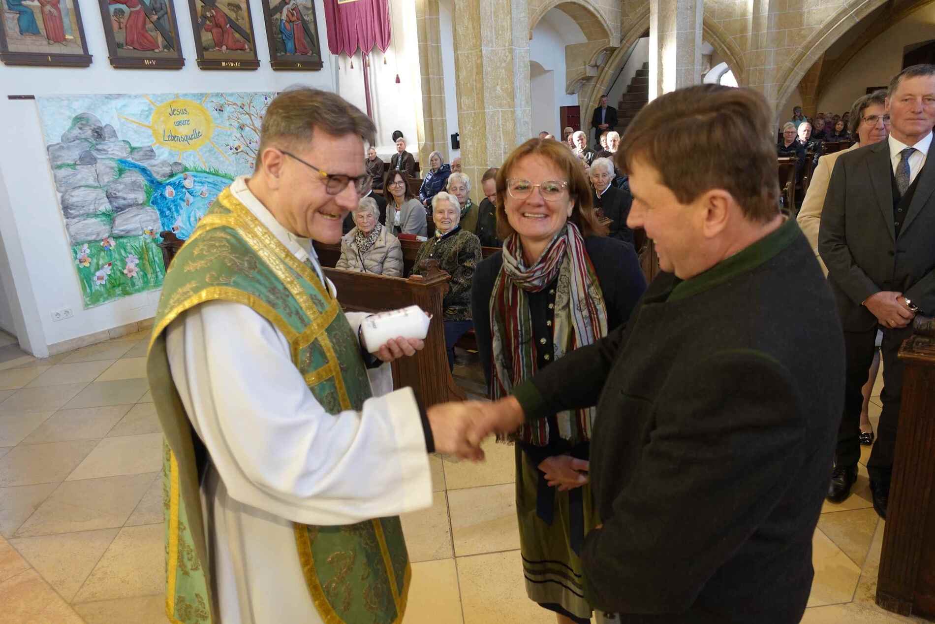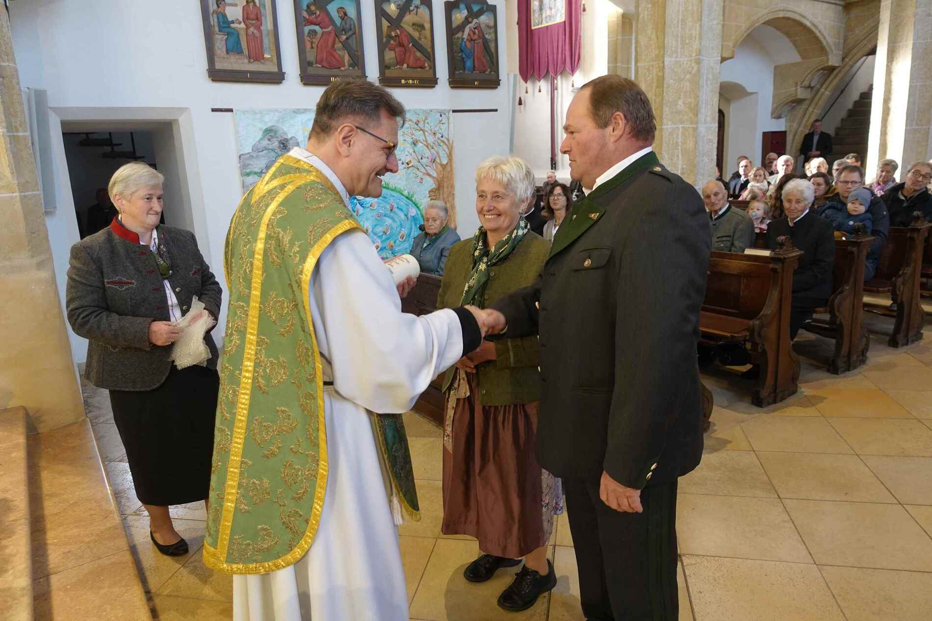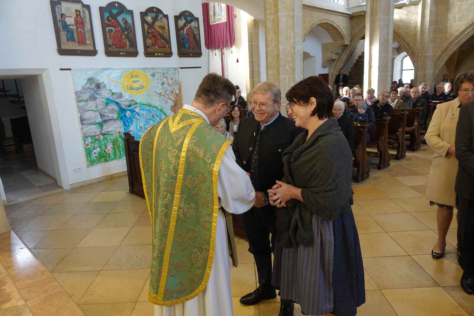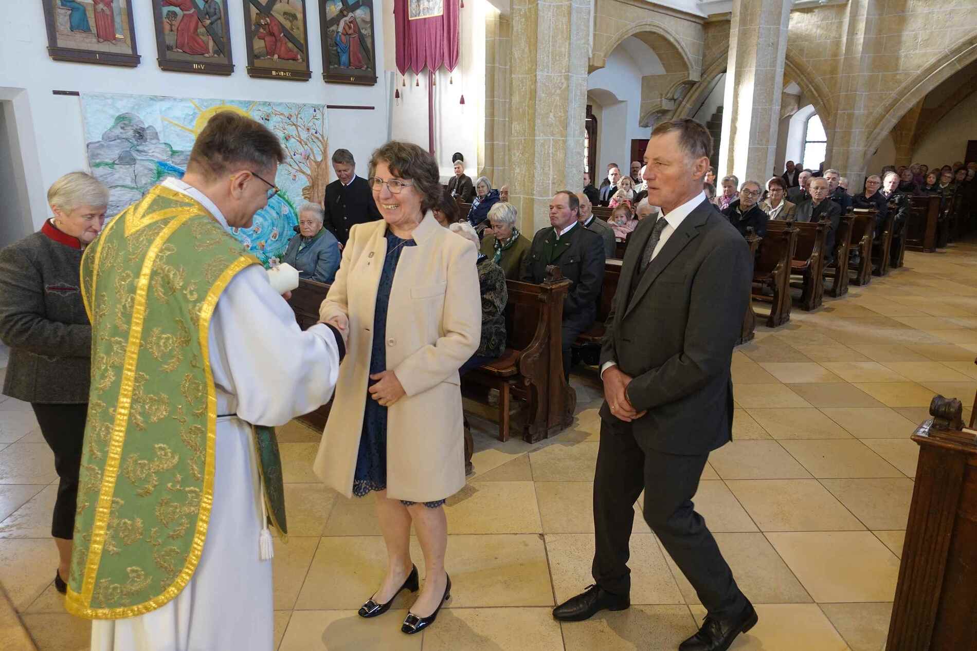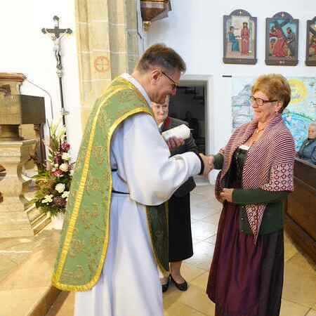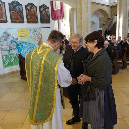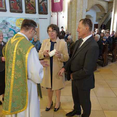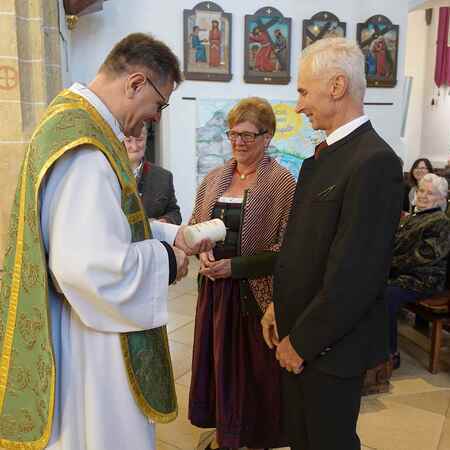 Gott und einander für 25 bzw. 40 Ehejahre danken und um seinen weiteren Segen bitten - in seiner Predigt verglich P. Jacobus diese Feier mit einem Erntedankfest. Man schaut zurück, auf all die Jahre, auf Höhen und Tiefen, auf Freud und Leid, auf Familie, Kinder und Kindeskinder und wird sich bewusst, was einem im Leben geglückt und geschenkt ist. Vieles - manchmal das Wichtigste - verdanken wir einem gütigen Geschick, dem Segen des Herrn.