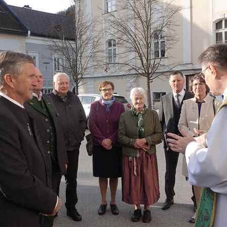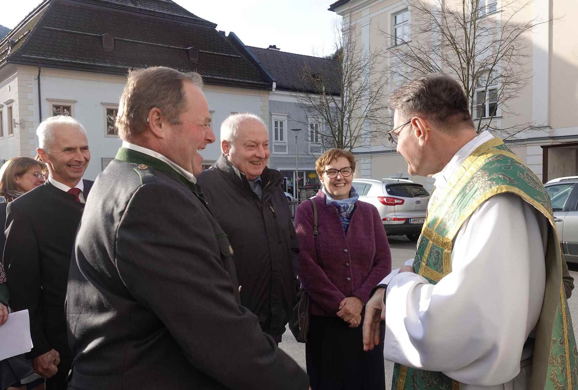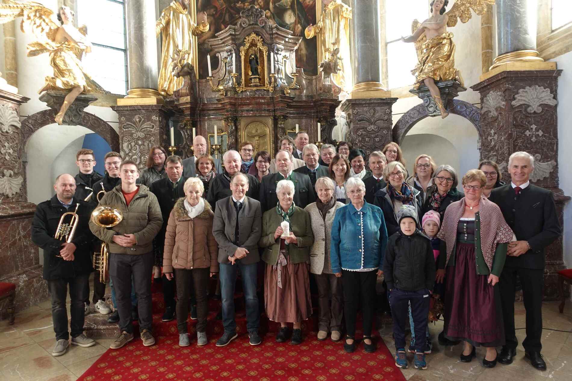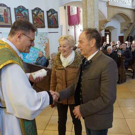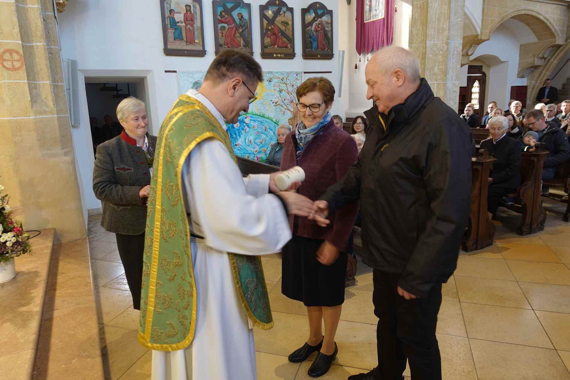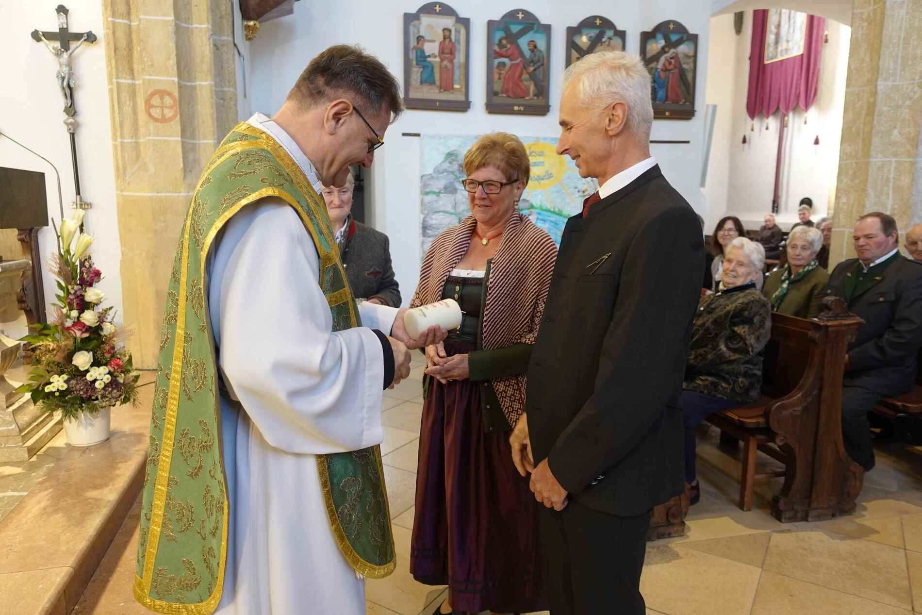 P. Jacobus gratulierte den Paaren im Namen der Pfarre und überreichte jedem Ehepaar eine Kerze, die er vorher gesegnet hatte. Die musikalische Gestaltung durch ein Bläserensemble und den Bäuerinnenchor, zur Ehre Gottes und der Jubelpaare, erfreute die ganze Gottesdienstgemeinde. Nach der Festmesse empfing der Vizebürgermeister die Paare im Ferrum, um ihnen ebenfalls zu gratulieren.