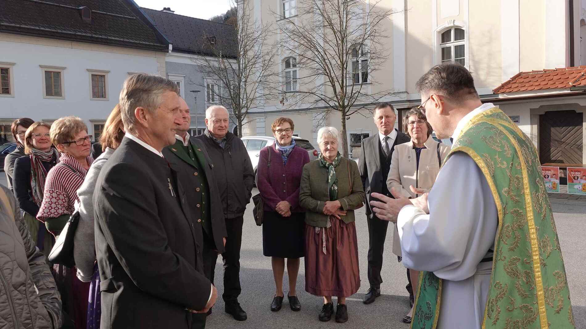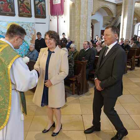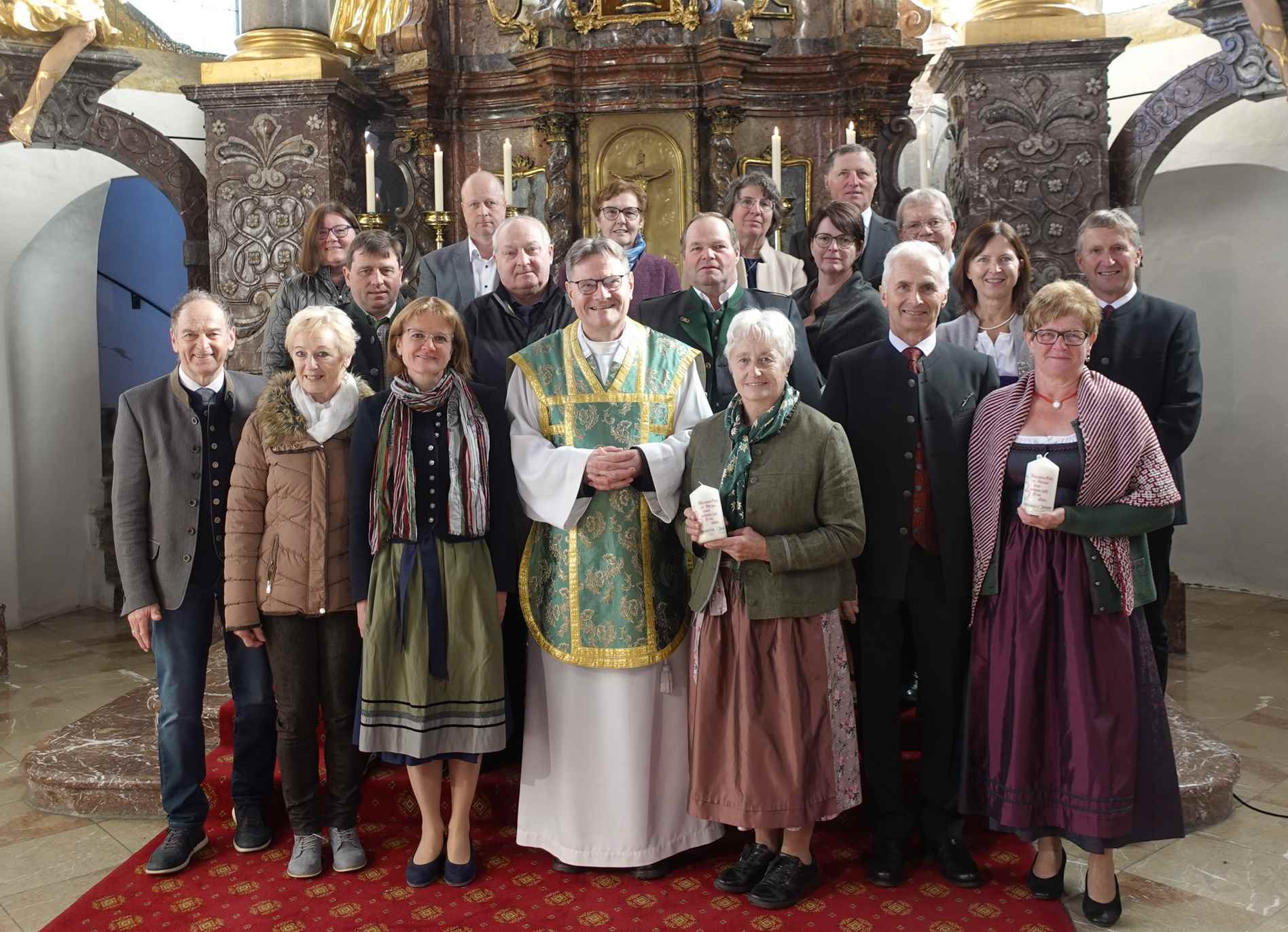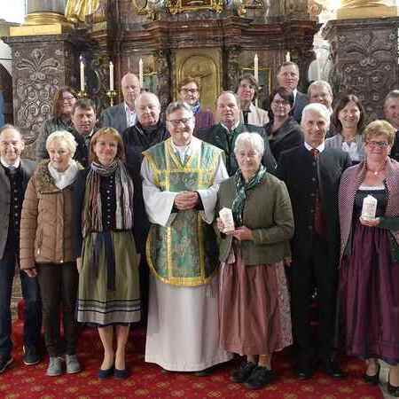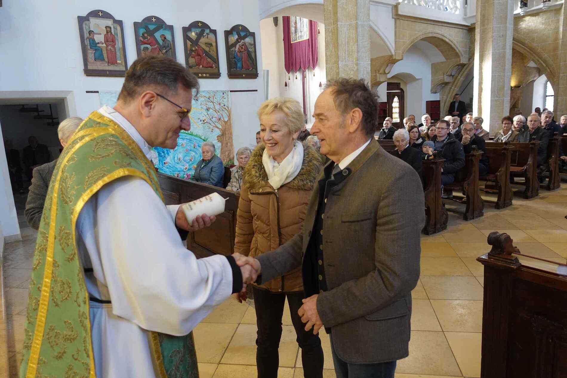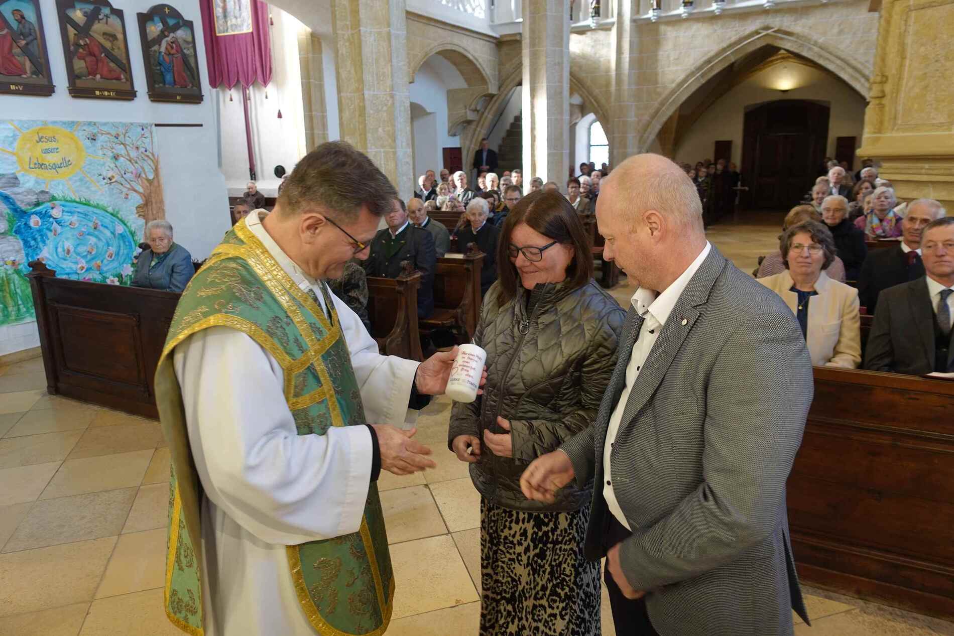 P. Jacobus gratulierte den Paaren im Namen der Pfarre und überreichte jedem Ehepaar eine Kerze, die er vorher gesegnet hatte. Die musikalische Gestaltung durch ein Bläserensemble und den Bäuerinnenchor, zur Ehre Gottes und der Jubelpaare, erfreute die ganze Gottesdienstgemeinde. Nach der Festmesse empfing der Vizebürgermeister die Paare im Ferrum, um ihnen ebenfalls zu gratulieren.