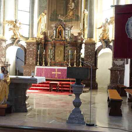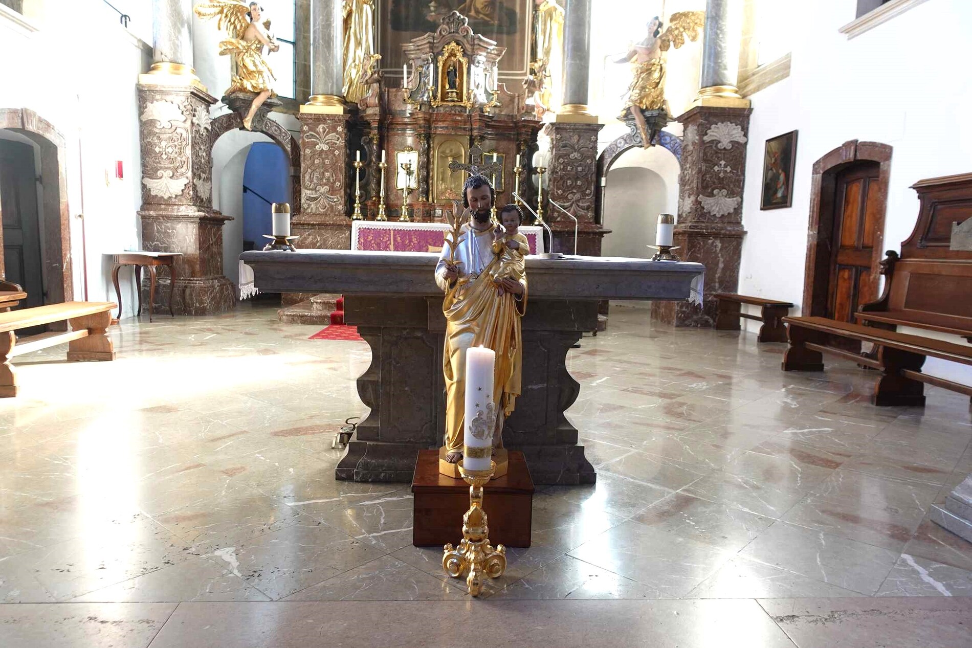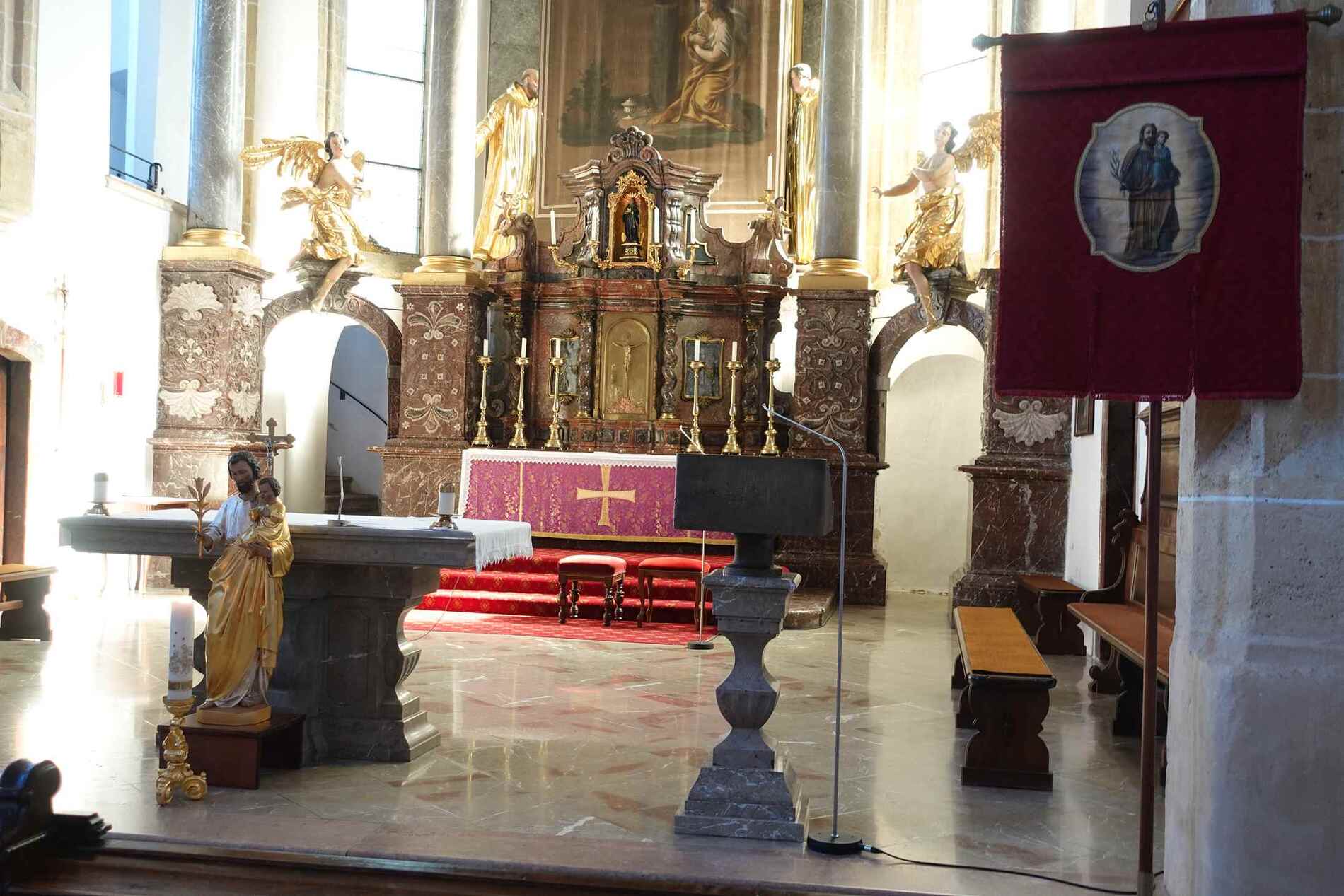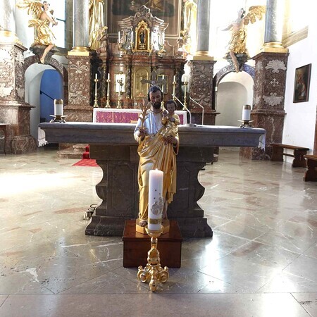 Der hl. Josef wird von den Evangelisten Matthäus und Lukas erwähnt. Nach beiden Evangelien war Josef davidischer Abstammung und Bindeglied zwischen dem Königshaus und dem Messias. Er war ein Mann des Glaubens und des Vertrauens und eingeweiht in göttliche Geheimnisse. Als liebevoller Gatte der Jungfrau Maria hat er an Jesus die Stelle des Vaters vertreten. Wie lange Josef gelebt hat, wissen wir nicht; das letzte Mal wird er bei der Wallfahrt mit dem zwölfjährigen Jesus erwähnt. Papst Pius IX. hat ihn zum Schutzpatron der Kirche erklärt. Außerdem gilt der hl. Josef, der als Zimmerer gearbeitet hat, als Schutzpatron der Arbeiter, Bauhandwerker und Zimmerleute.