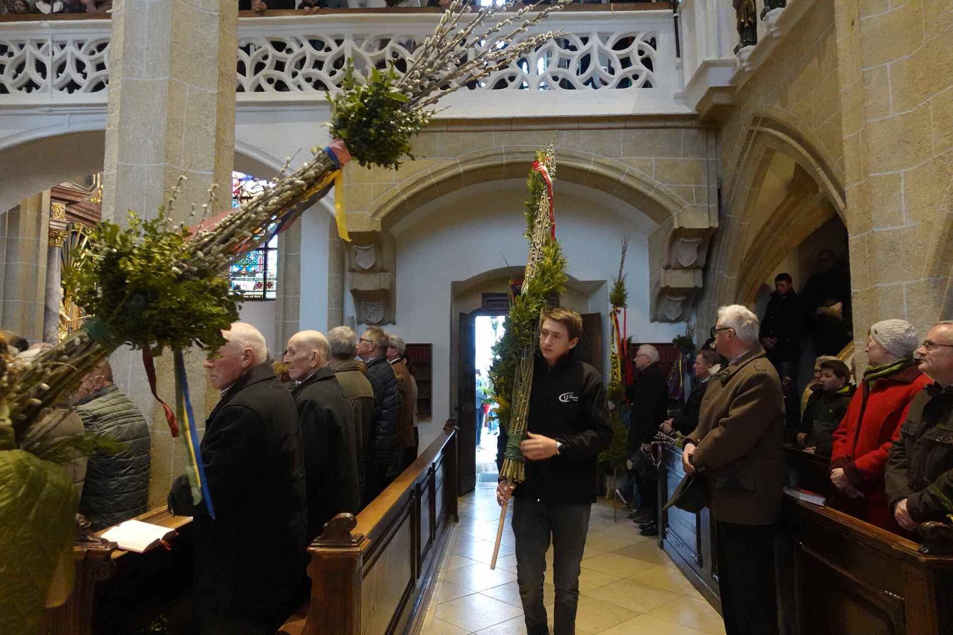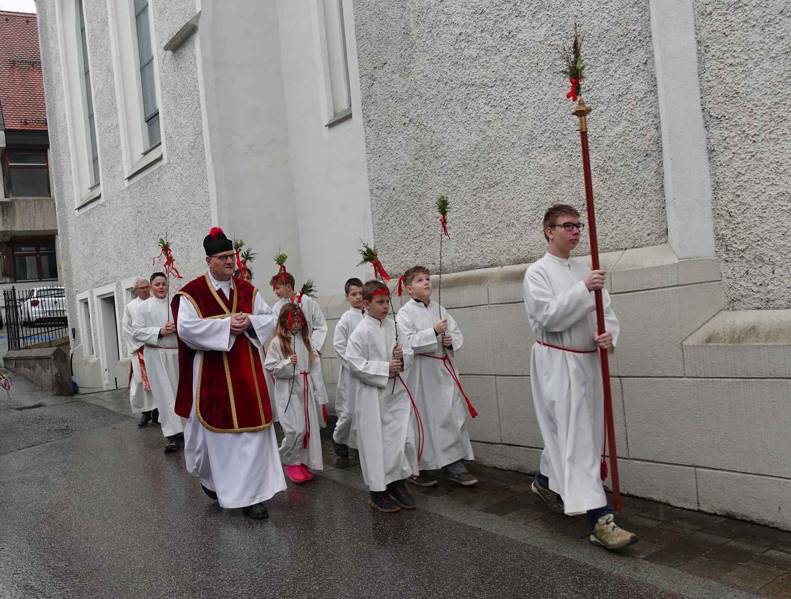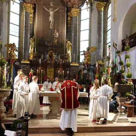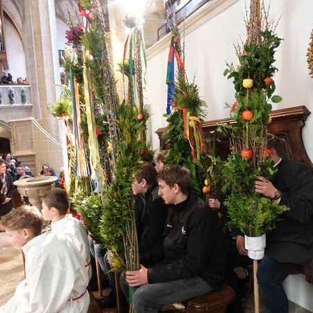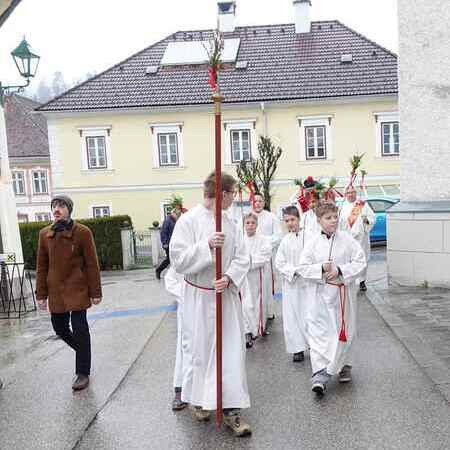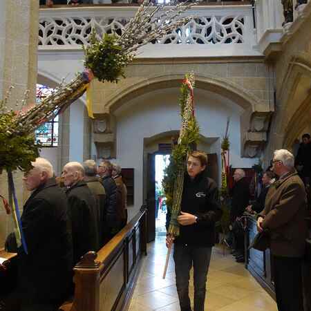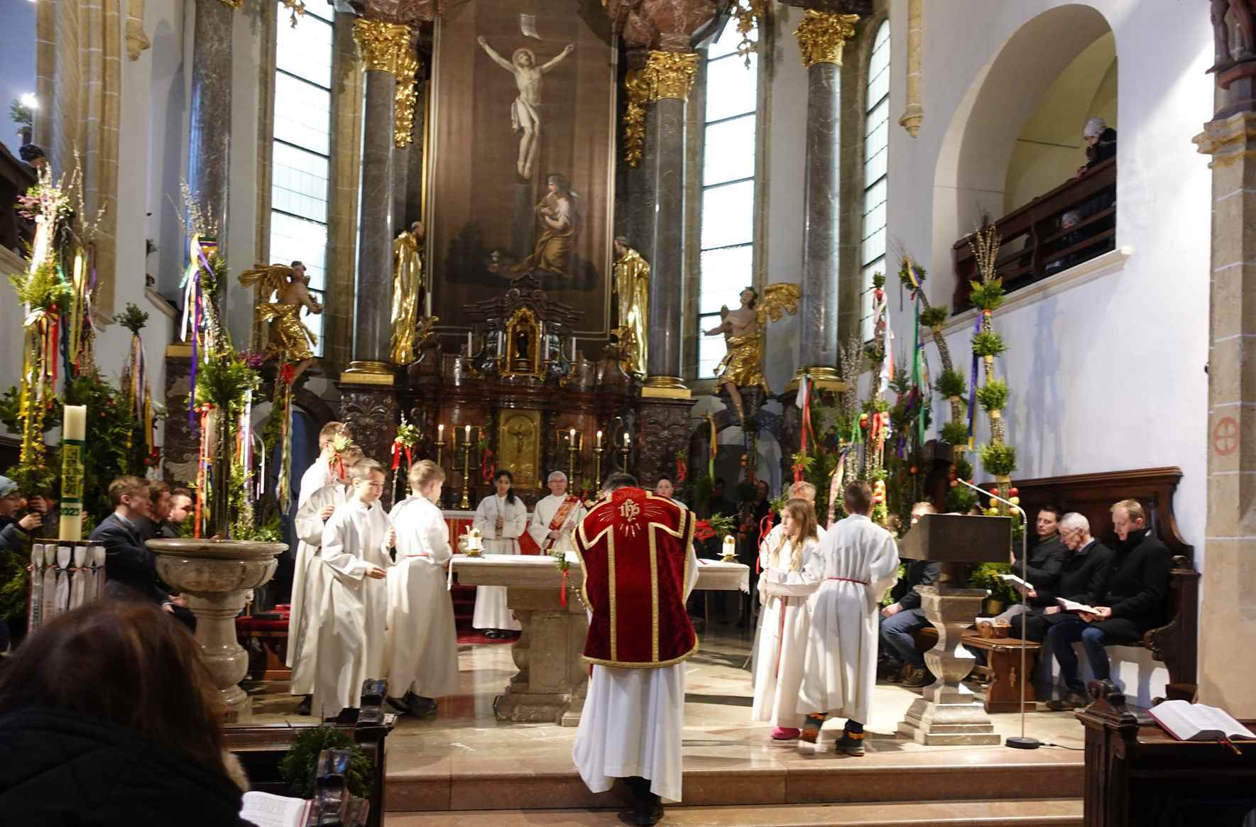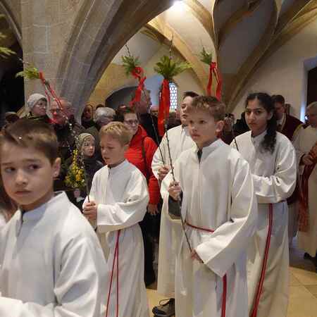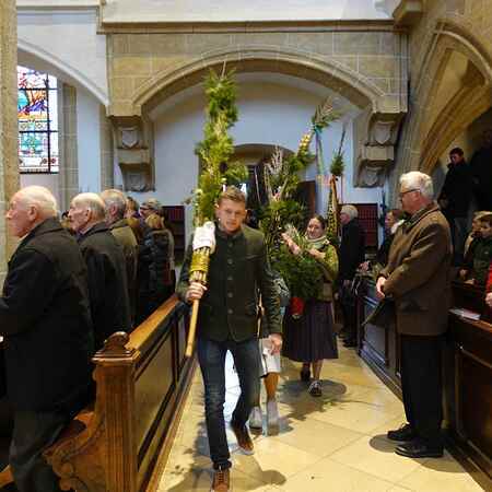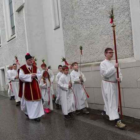 Die gesegneten Palmzweige, besonders die stattlichen und prachtvoll gebundenen Palmbuschen im Altarraum beeindruckten als Zeichen des Glaubens. Sie erinnern an den Einzug Jesu in Jerusalem, wo die Menschen ihm zujubelten, wo man Hosanna rief und ihn hochleben ließ. Der Jubel war aber bald verklungen - in der Passion wurden Leiden und Tod Jesu betrachtet und dann in den heiligen Geheimnissen des Messopfers seine Auferstehung gefeiert.