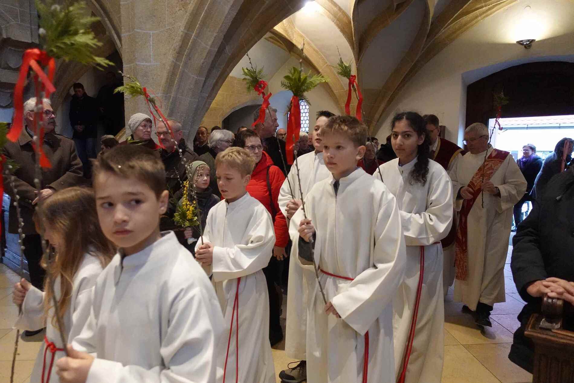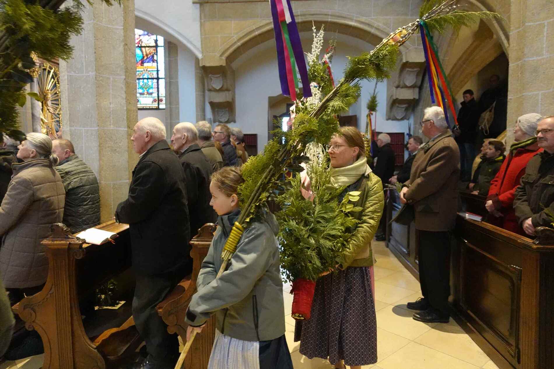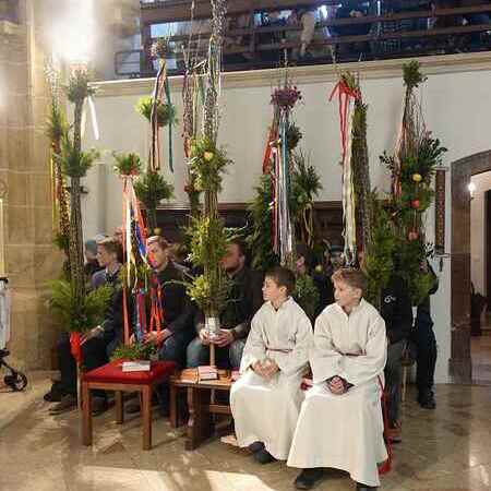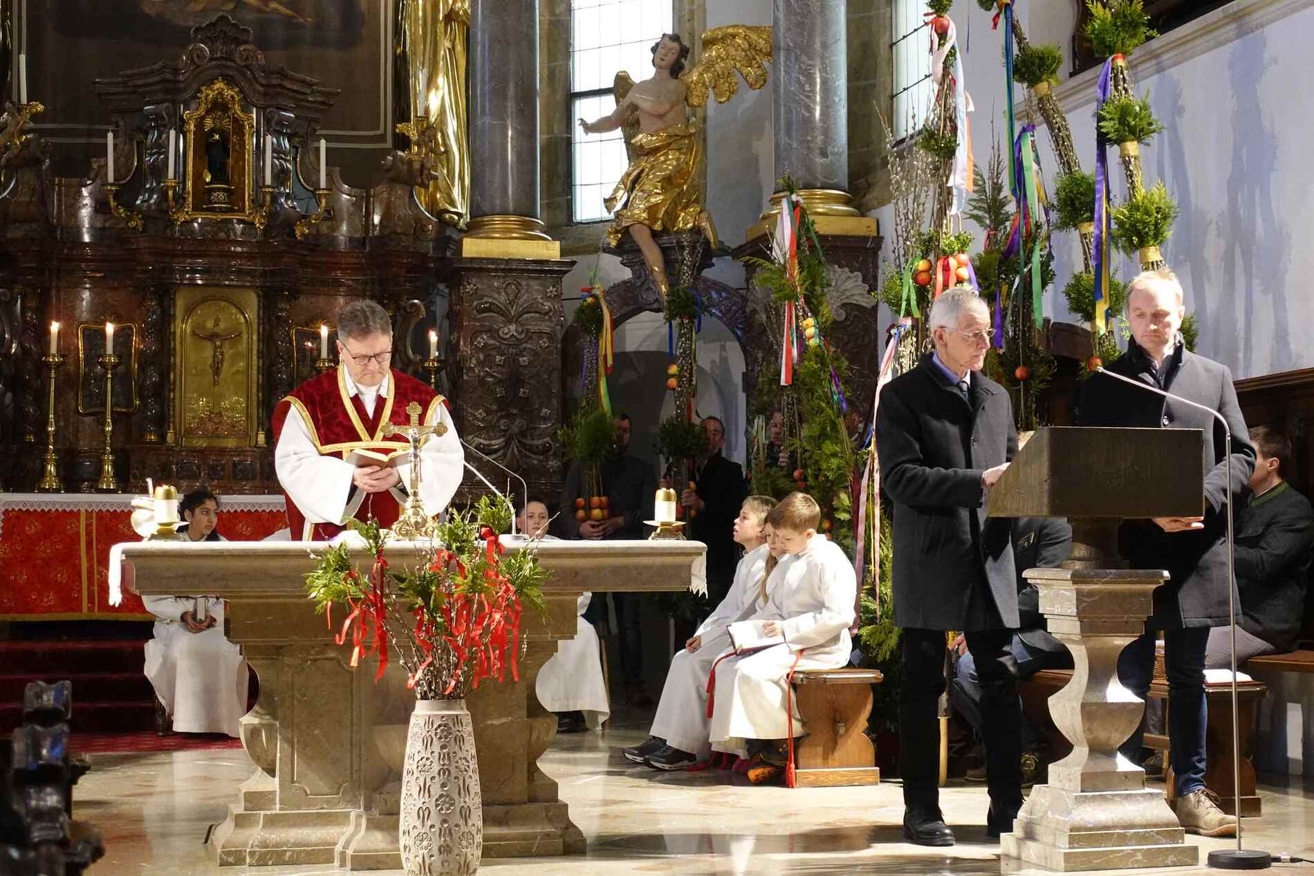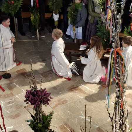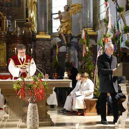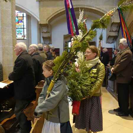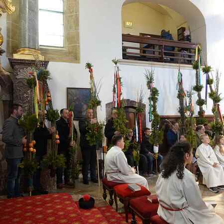 Die gesegneten Palmzweige, besonders die stattlichen und prachtvoll gebundenen Palmbuschen im Altarraum beeindruckten als Zeichen des Glaubens. Sie erinnern an den Einzug Jesu in Jerusalem, wo die Menschen ihm zujubelten, wo man Hosanna rief und ihn hochleben ließ. Der Jubel war aber bald verklungen - in der Passion wurden Leiden und Tod Jesu betrachtet und dann in den heiligen Geheimnissen des Messopfers seine Auferstehung gefeiert.