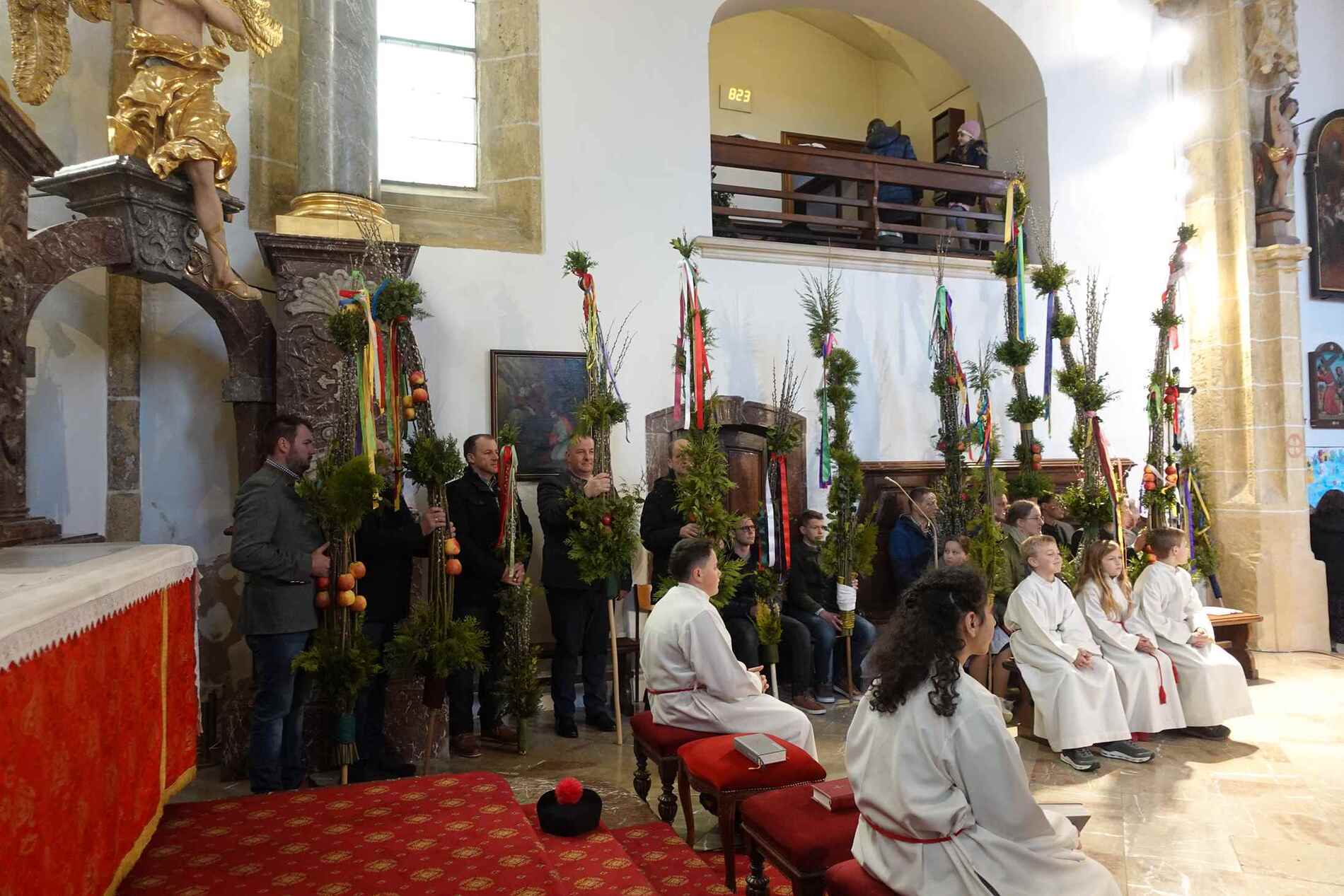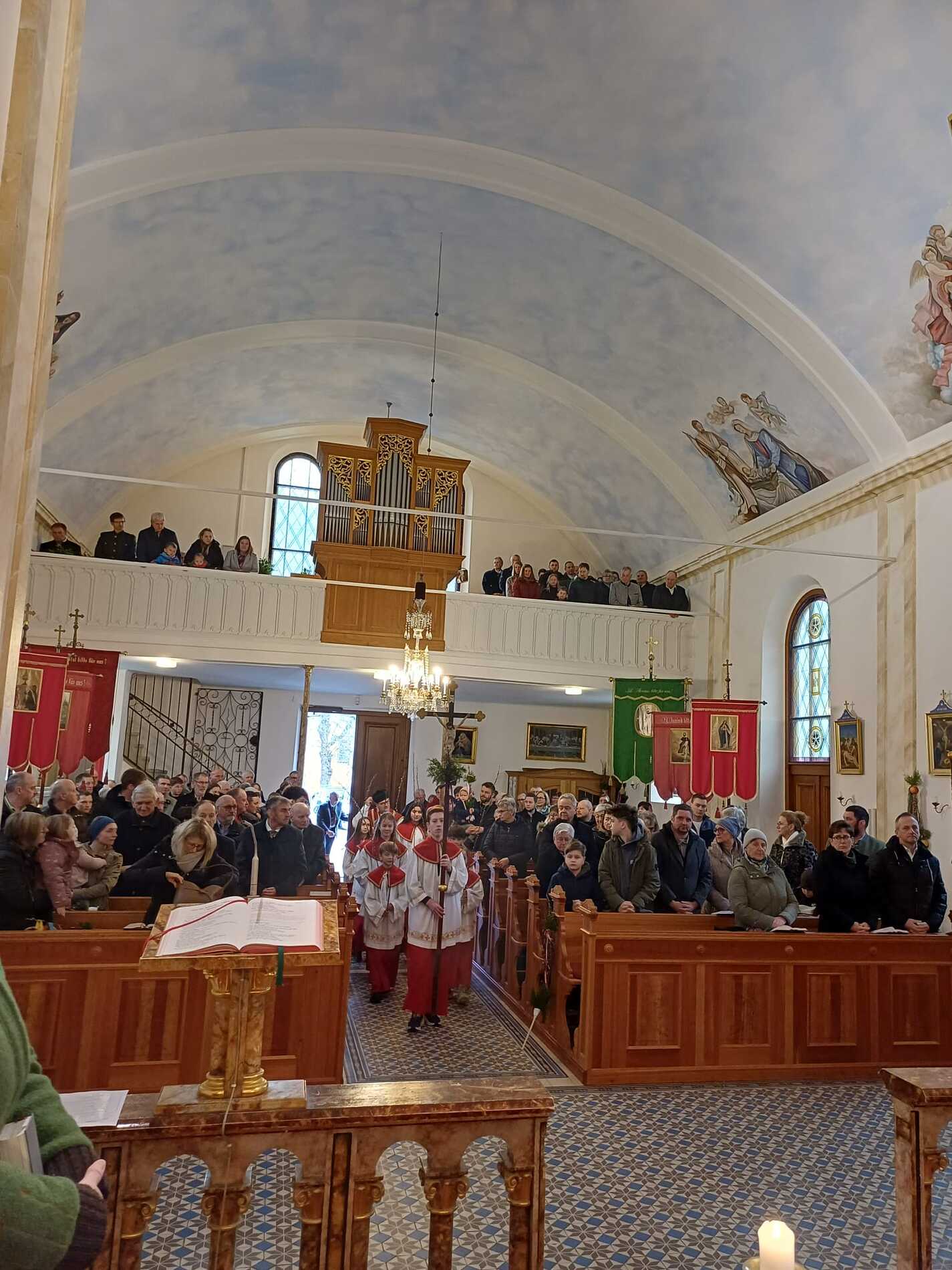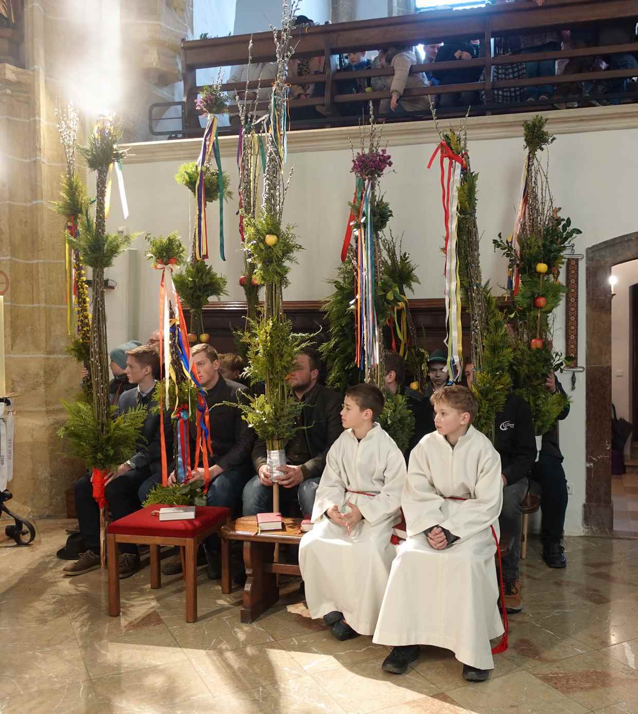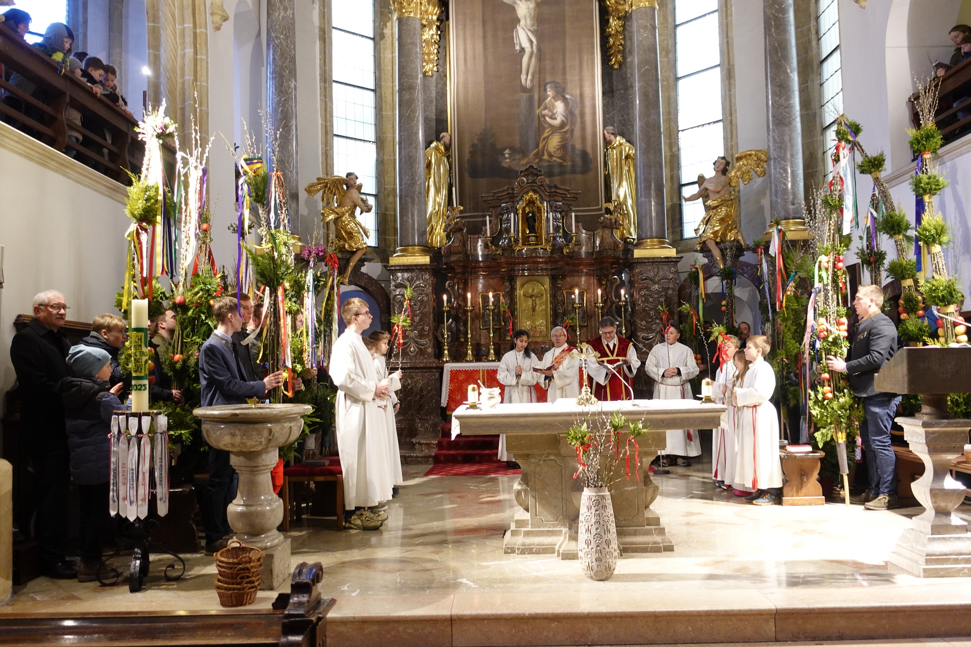 Die gesegneten Palmzweige, besonders die stattlichen und prachtvoll gebundenen Palmbuschen im Altarraum beeindruckten als Zeichen des Glaubens. Sie erinnern an den Einzug Jesu in Jerusalem, wo die Menschen ihm zujubelten, wo man Hosanna rief und ihn hochleben ließ. Der Jubel war aber bald verklungen - in der Passion wurden Leiden und Tod Jesu betrachtet und dann in den heiligen Geheimnissen des Messopfers seine Auferstehung gefeiert.
