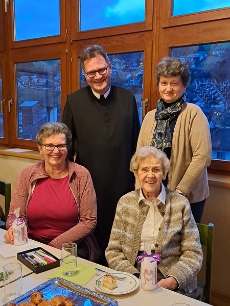 Bei der letzten Besprechung des Besuchsteams der Ybbsitzer Pfarrcaritas gab es auch einen Grund zum Feiern: Eva Kößl und Paula Teufel bekamen für ihre langjährige verlässliche Mitarbeit von der Leiterin des Besuchsteams, Monika Bramauer, und Pfarrer P. Jacobus als Dankeschön eine Kerze überreicht.