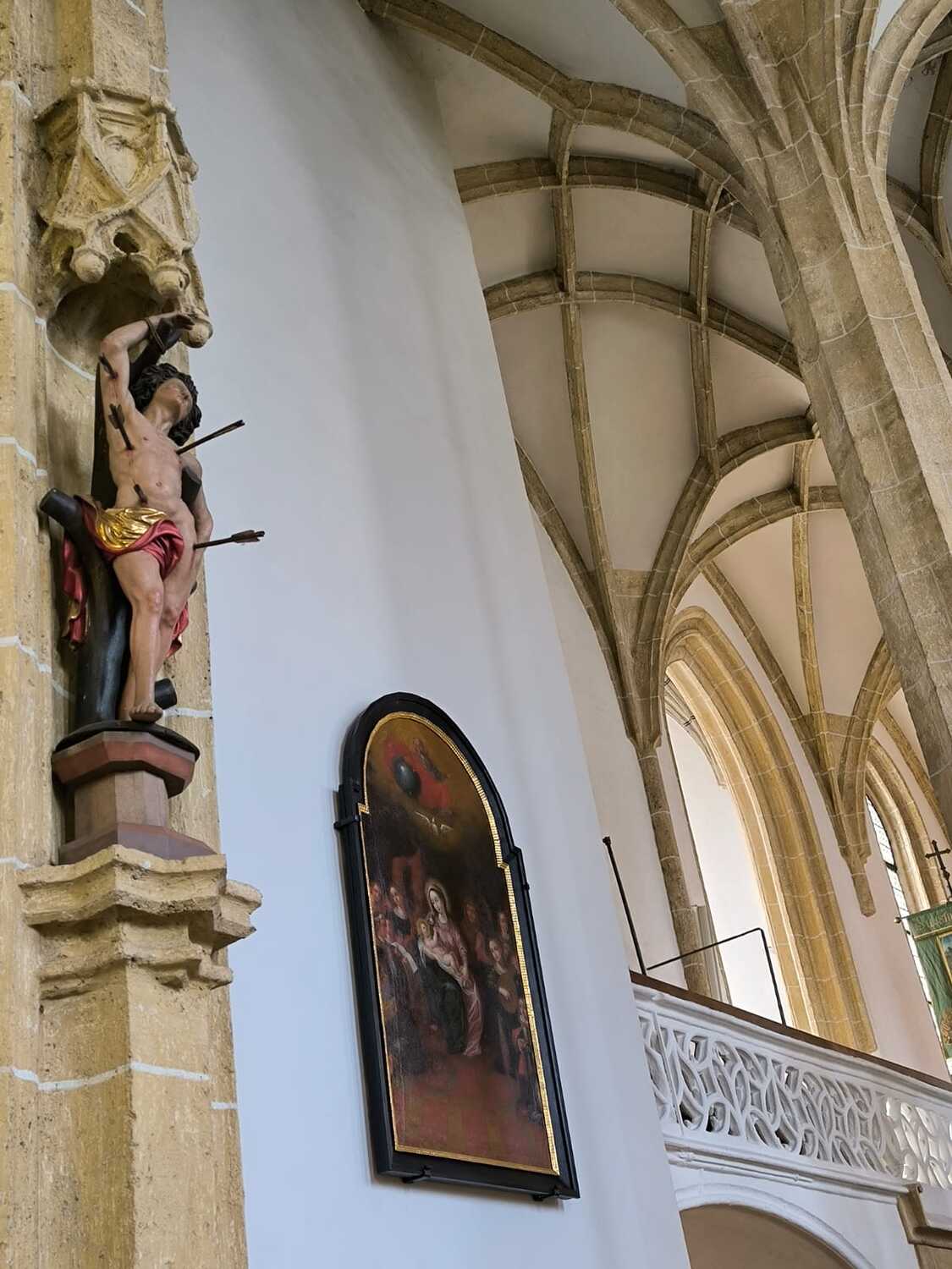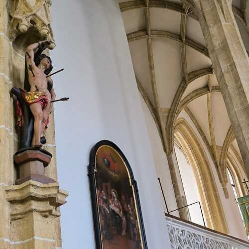 Der Barbara-Altar (links) und Marienaltar mit spätgotischer Madonna sind aus marmoriertem Holz und entstanden um 1690. Gegenüber letzterem die mächtige Zunftfahne der Ybbsitzer Pfannenschmiede.